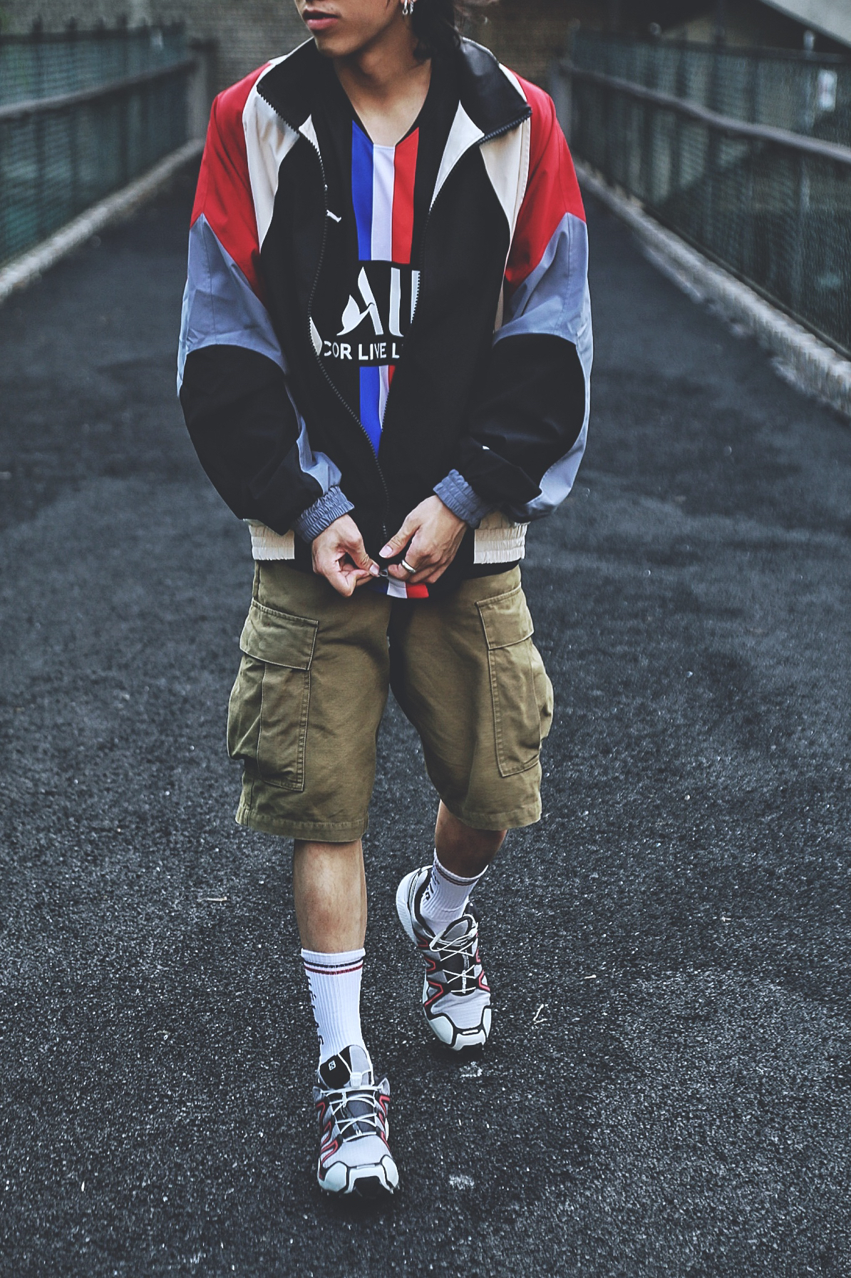 终于到了能穿外套的季节了🤩下半天的第一件外套安排上了,红黑白蓝四色撞色活力满满,宽松的夹克外套版型街头气息十足。这个季节☁️超级适合上长下短的穿搭,下身一条军绿色工装裤,为全身注入更多军事风格,搭配越野户外属性的Salomon,打造🆒🚶🏼♂️早秋搭配😎 🧢:a cold wall 🧥:KKTP 👔:Jordan x 巴黎圣日尔曼 🧦:Helas 👟:Salomon