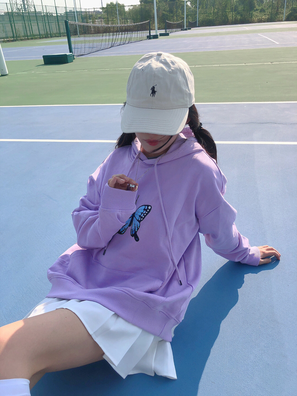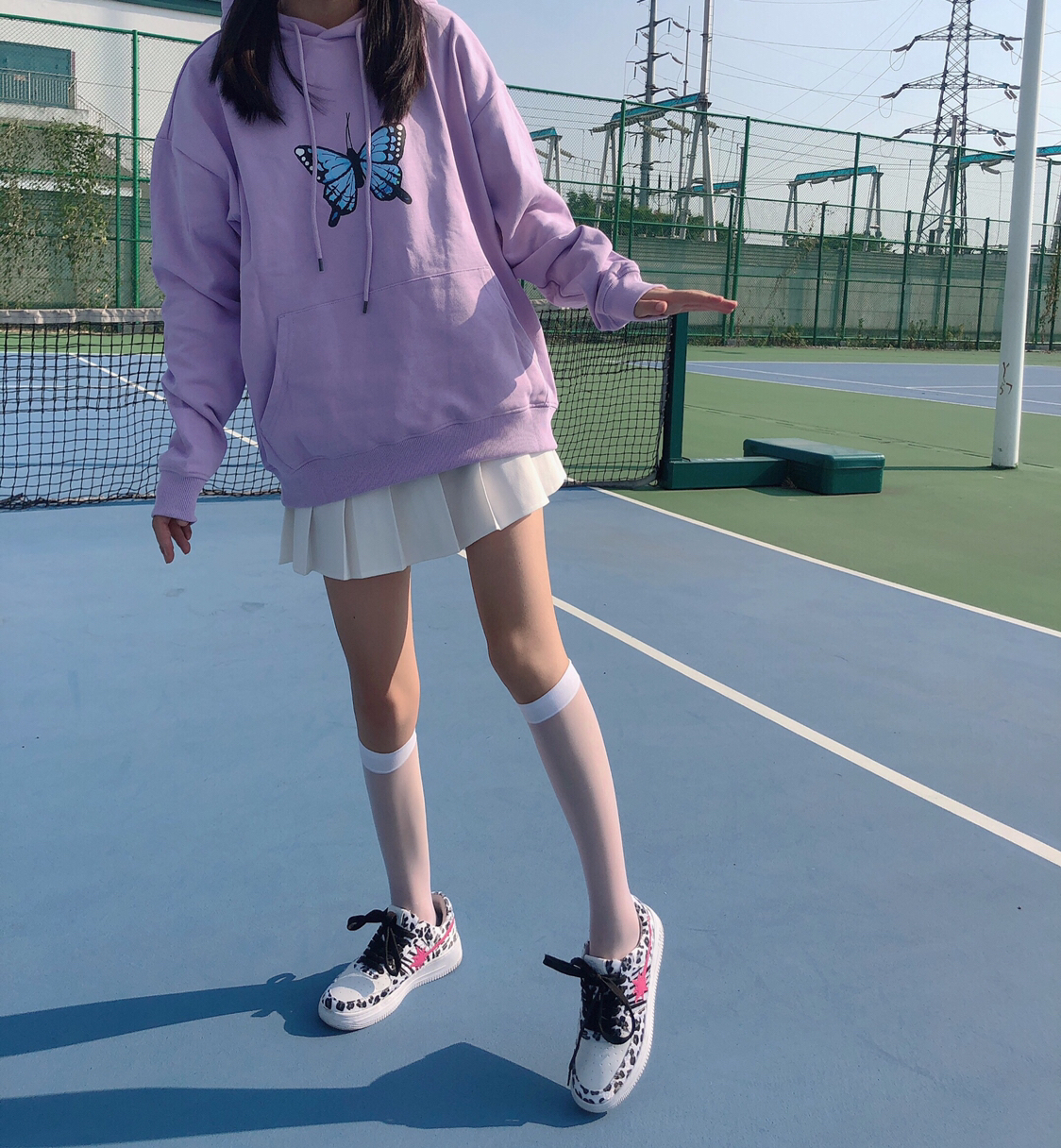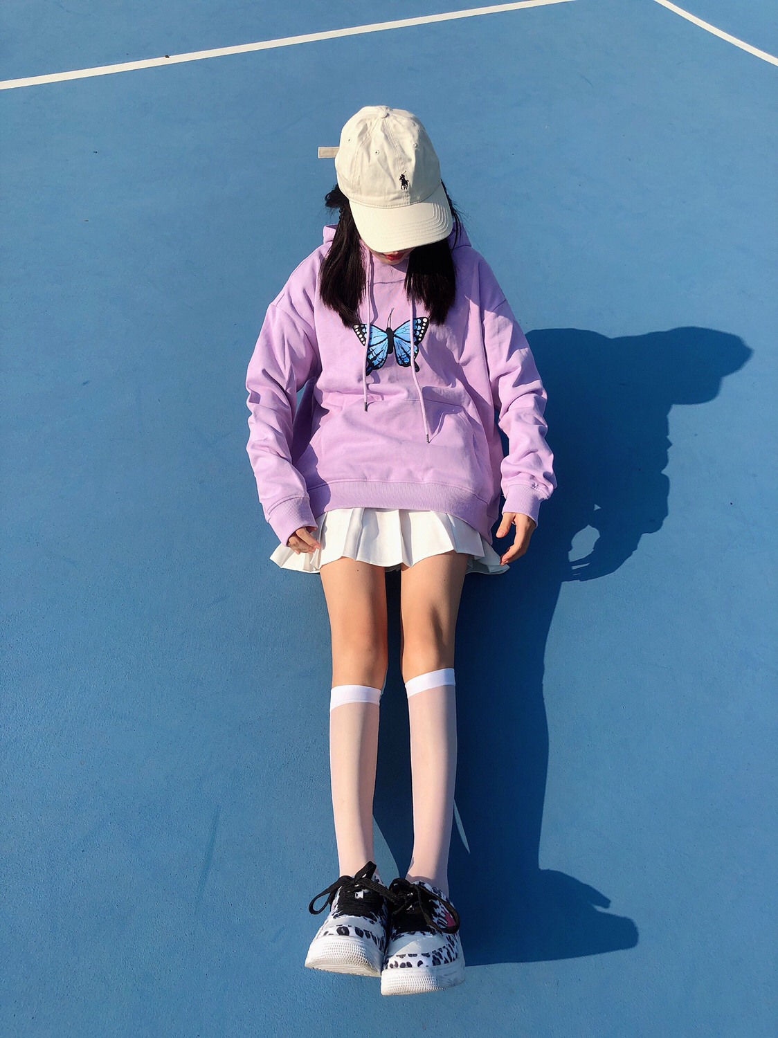 👕:Suamoment蝴蝶卫衣 👖:百褶裙 👟:Starwalk白豹纹 终终于穿到了香芋紫色的卫衣啦 真的是一次尝试 没想到也太显皮肤了吧 而且还是我最爱的蝴蝶元素 本人真的是捅了蝴蝶窝么 今年穿了好多有蝴蝶的卫衣 真的能表达出我有多喜欢了吧! 背后蝴蝶翩翩起舞 真的太好看了! 今天又回到学校拍照了 是大家熟悉的网球场么 今儿阳光太好了 拍出来都是原图直出啊 我太喜欢了!!