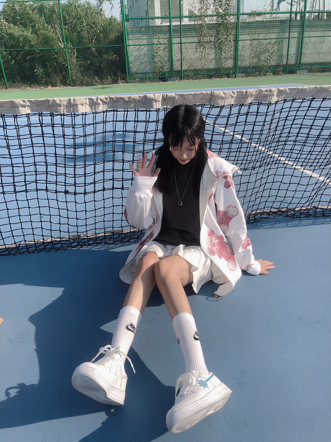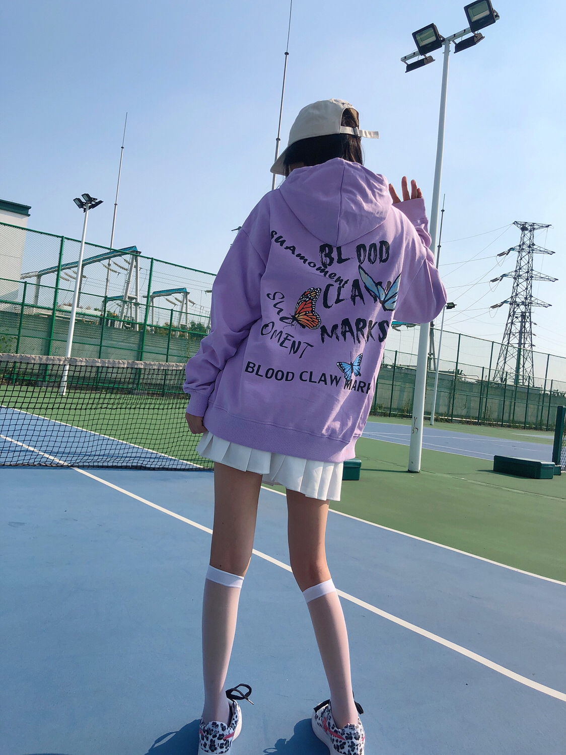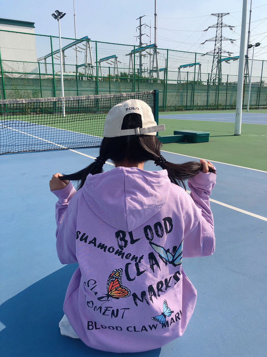 👕:Suamoment蝴蝶卫衣 👖:百褶裙 👟:Starwalk白豹纹 终终于穿到了香芋紫色的卫衣啦 真的是一次尝试 没想到也太显皮肤了吧 而且还是我最爱的蝴蝶元素 本人真的是捅了蝴蝶窝么 今年穿了好多有蝴蝶的卫衣 真的能表达出我有多喜欢了吧! 背后蝴蝶翩翩起舞 真的太好看了! 今天又回到学校拍照了 是大家熟悉的网球场么 今儿阳光太好了 拍出来都是原图直出啊 我太喜欢了!!