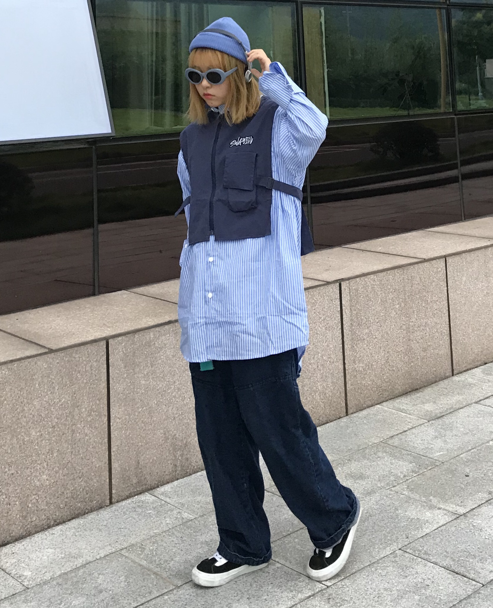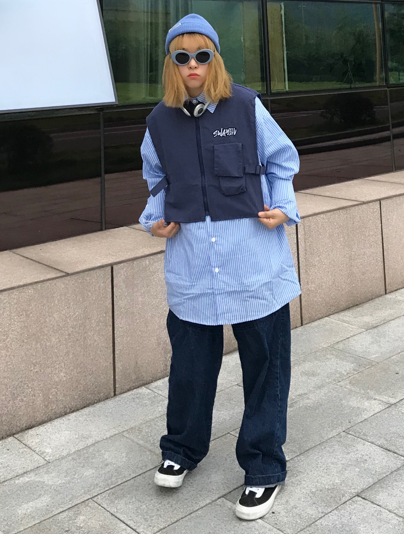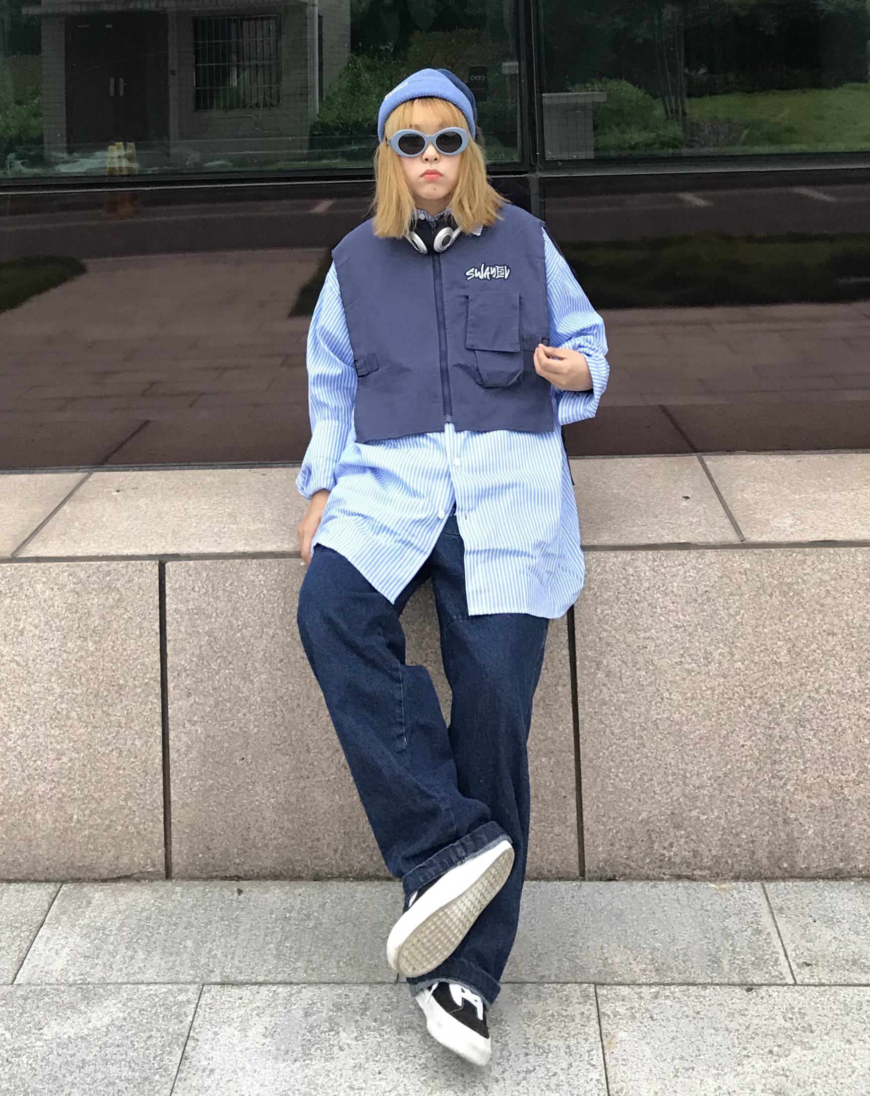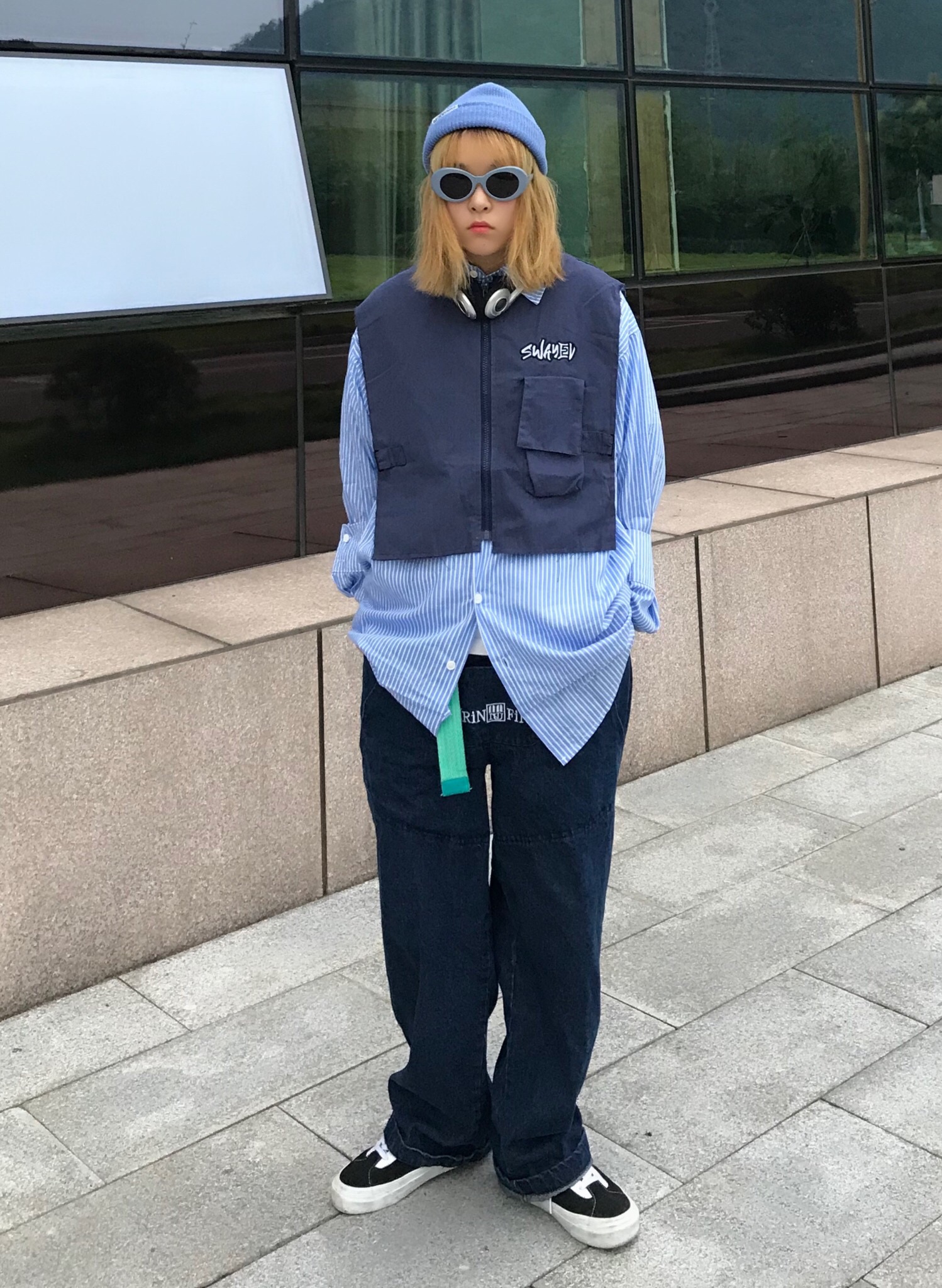 👔:Take off咖喱人 👖:Take off咖喱人 👟:Vans bold 整套我都很喜欢 因为衣服的设计很好 外面是假马甲很酷 裤子呢很宽松 很好搭配板鞋 各种都可以 那个假背带是不是特别有趣 只要是蓝色我就要好好搭配!