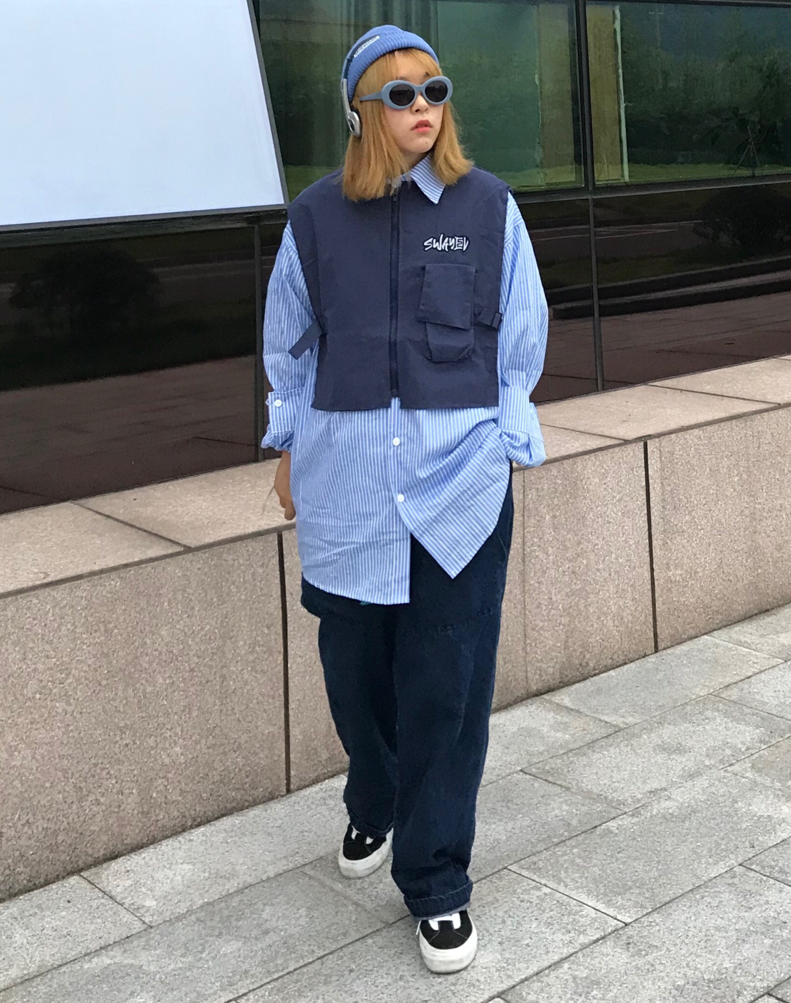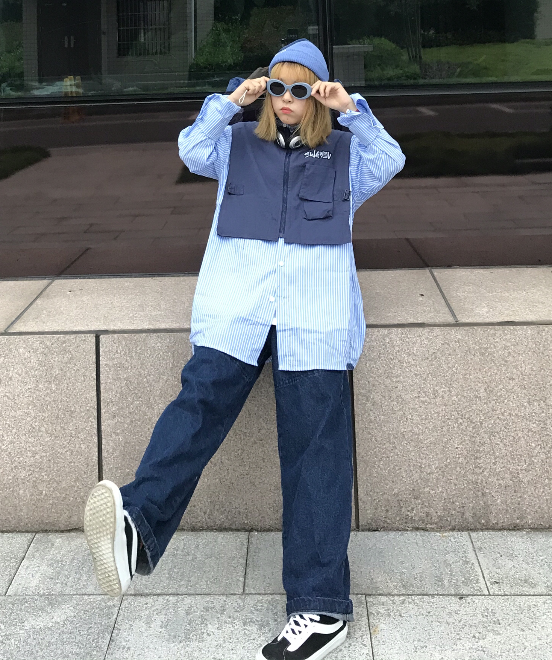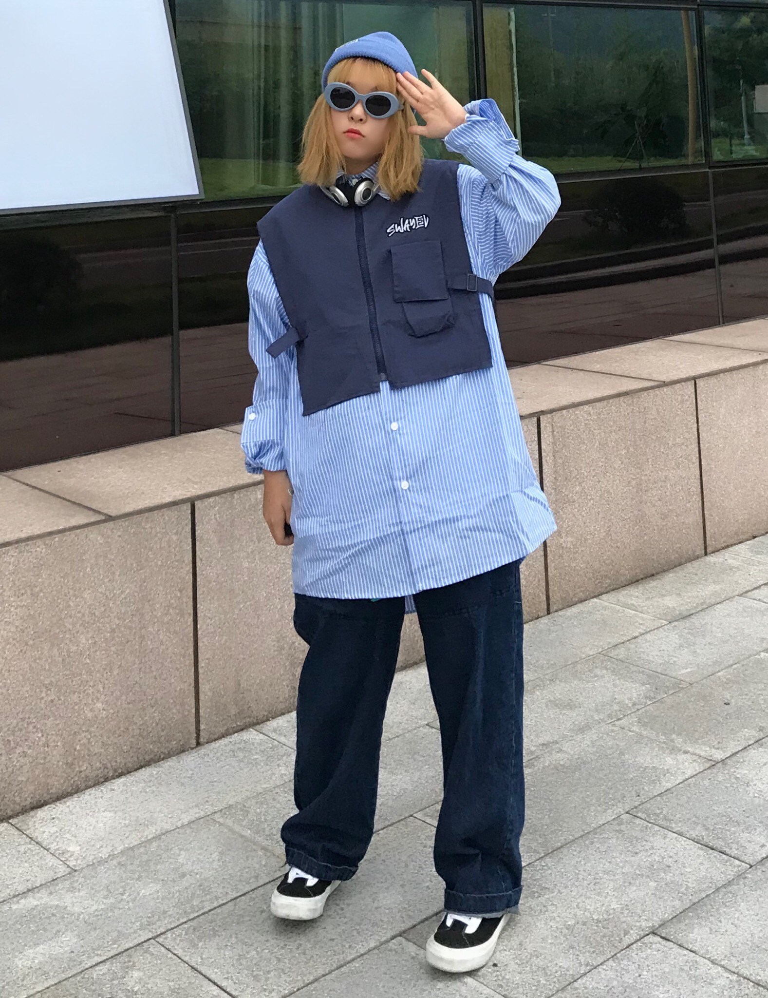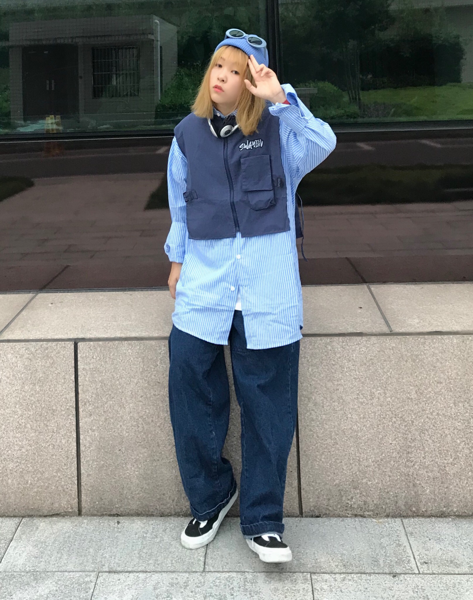 👔:Take off咖喱人 👖:Take off咖喱人 👟:Vans bold 整套我都很喜欢 因为衣服的设计很好 外面是假马甲很酷 裤子呢很宽松 很好搭配板鞋 各种都可以 那个假背带是不是特别有趣 只要是蓝色我就要好好搭配!