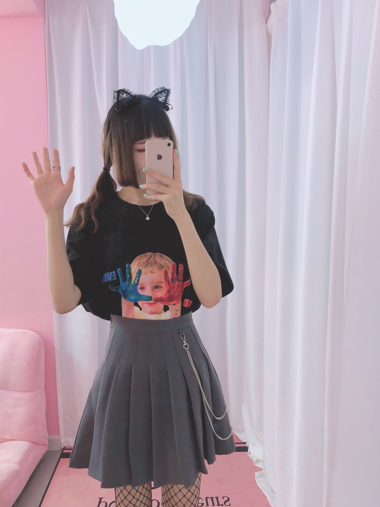 t恤: m5is 小孩印花图案可可爱爱有个性 是不太会撞款的单品 黑色百搭 单穿打底都ok 选择oversize款更百搭多变 短裙: conklab JK风小短裙 软妹儿必备😻 链条⛓️设计可盐可甜 灰色很好搭配 170 82斤穿s码刚好 项链: agatha 瑷嘉莎 这款项链设计很精致百搭 采用了今年大火的小雏菊元素🌼 小清新风十足 很适合送甜美小妹妹~