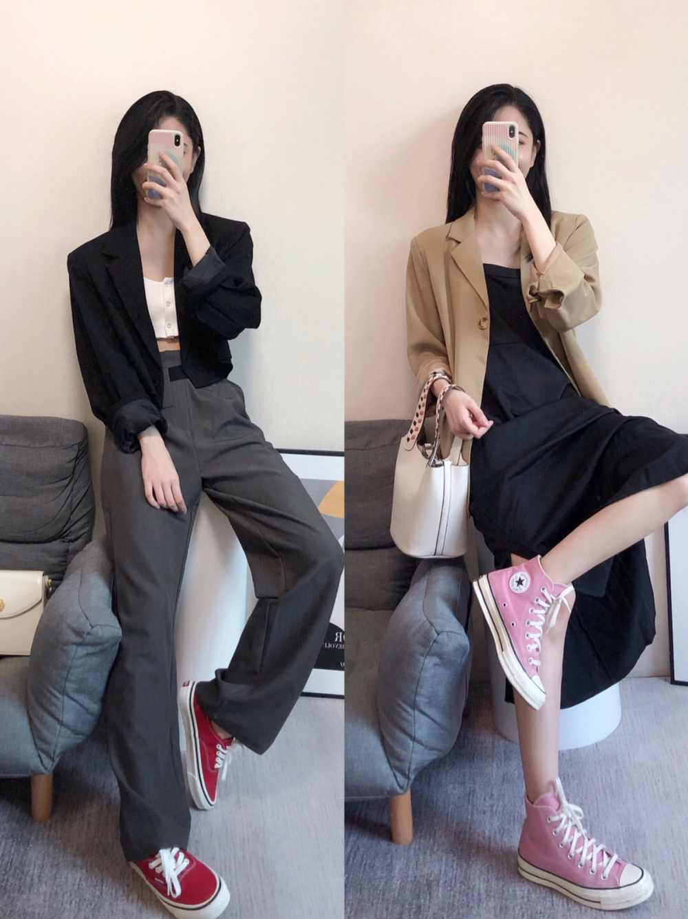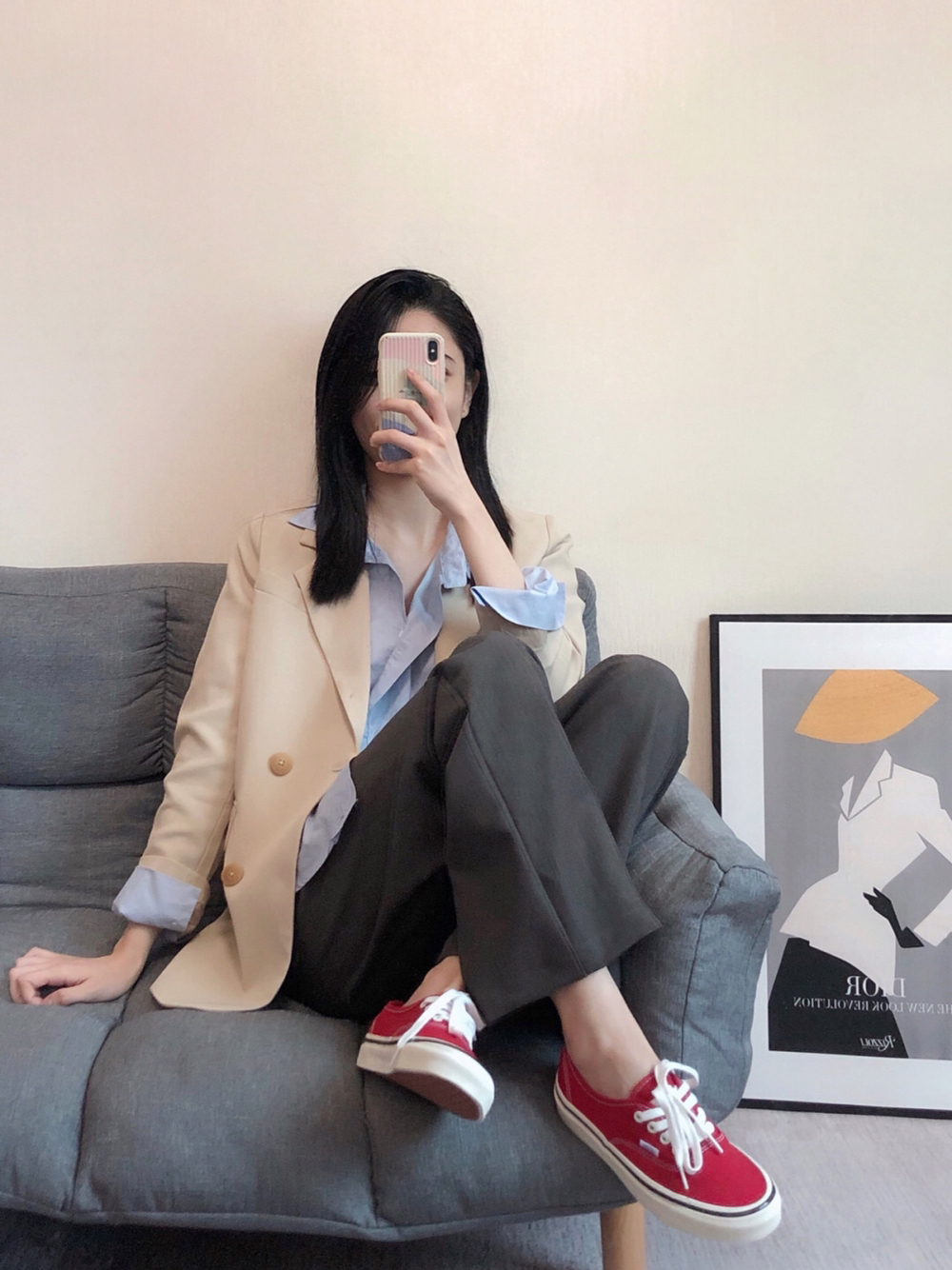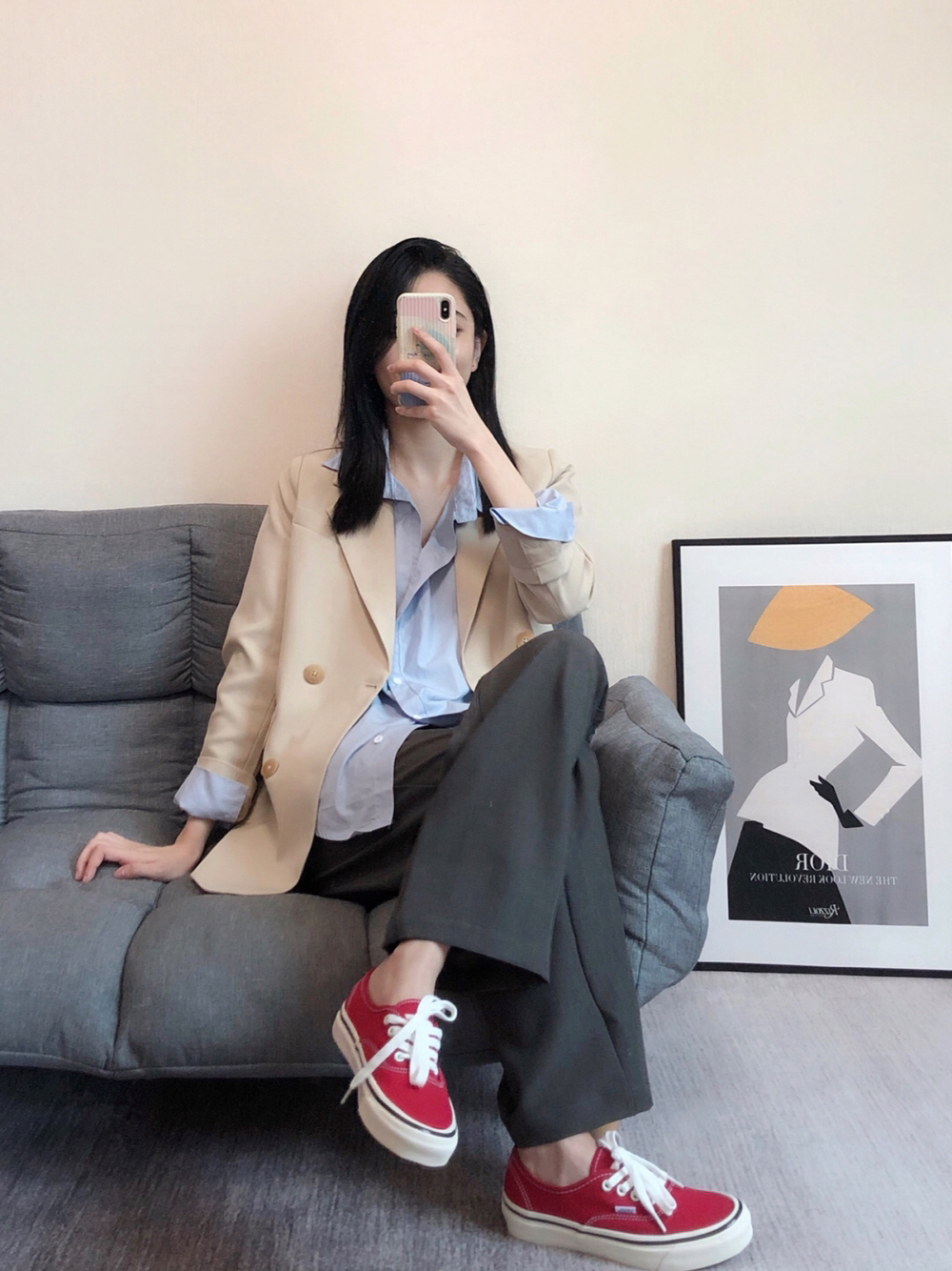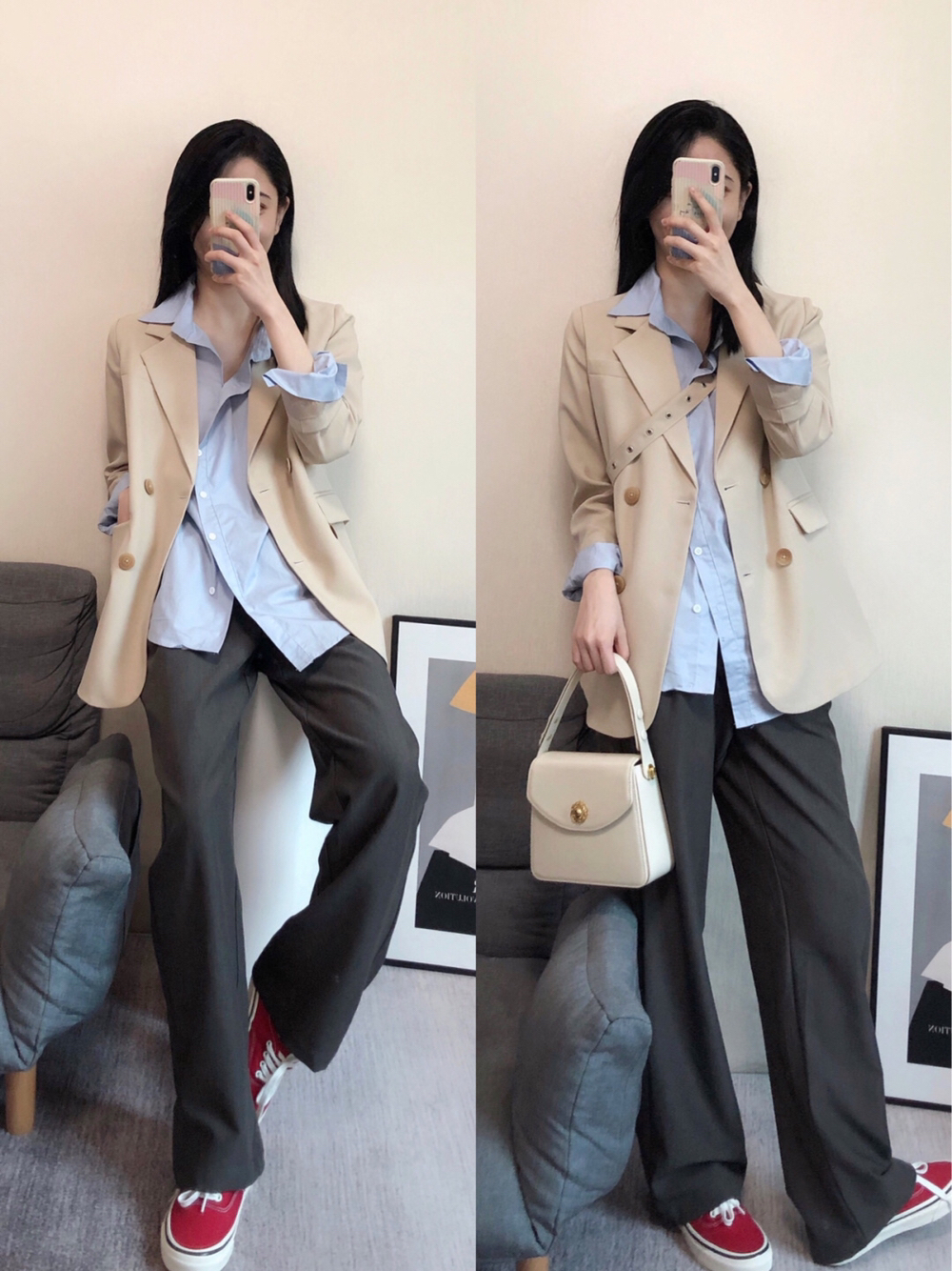 哈喽呀 我来啦 今日分享三套西装穿搭 秋天真的是西装的季节 想找到版型好又不会太正式款 真的太难啦 今天发现三套宝藏西装 分享给你们 Look1:设计款小众绑带西装 直筒版型 上身大气 遮肉 双排扣带有复古的感觉 杏色上身超好看 低调又有气质 下半身搭配直筒阔腿裤 高腰设计 拉长腿的比例 垂感也很好 里面我叠穿了一件蓝色的斜扣衬衫 增加了层次感 一整套下来好看又高级 👟:vans安纳海姆系列 红色...
