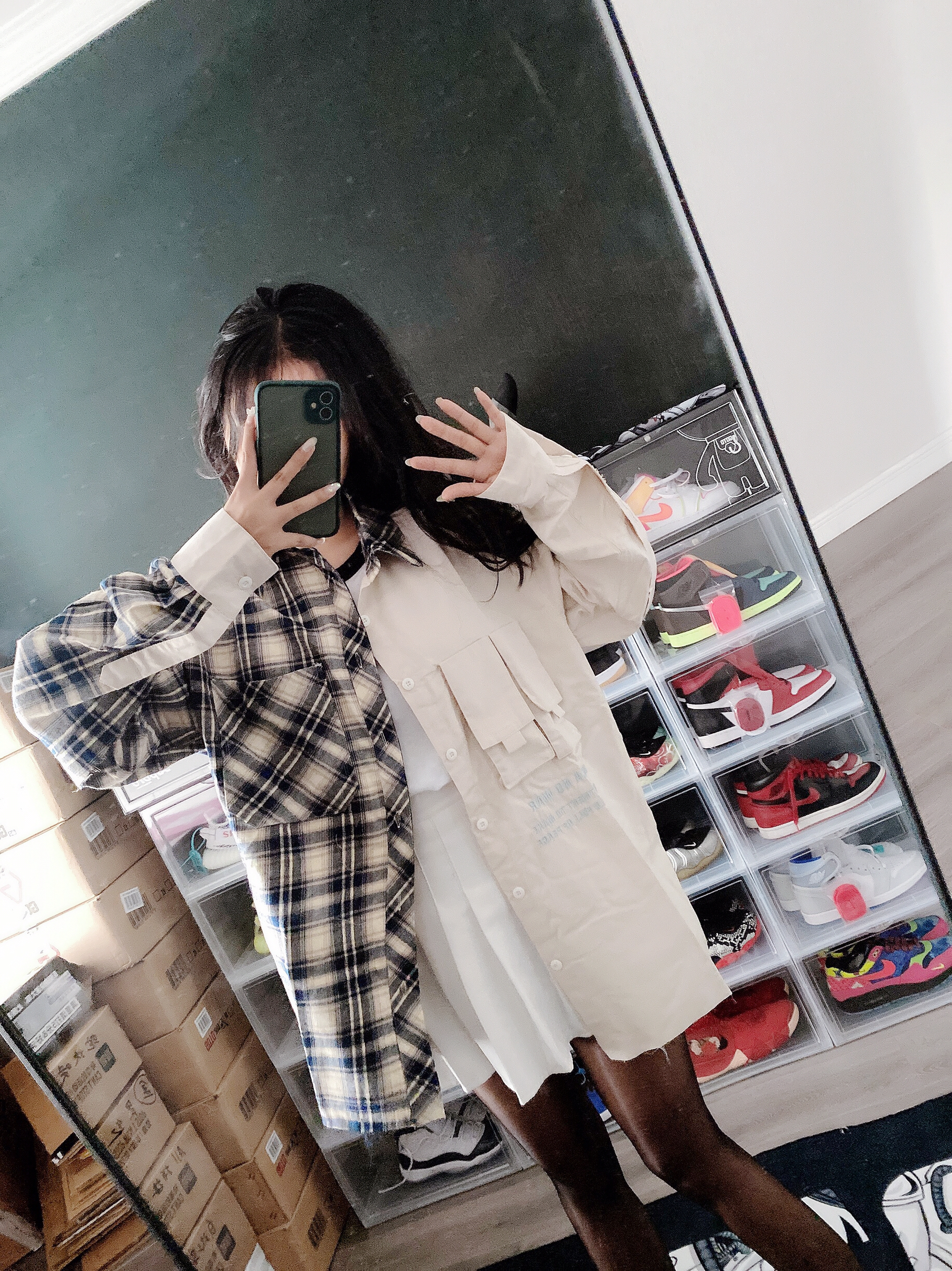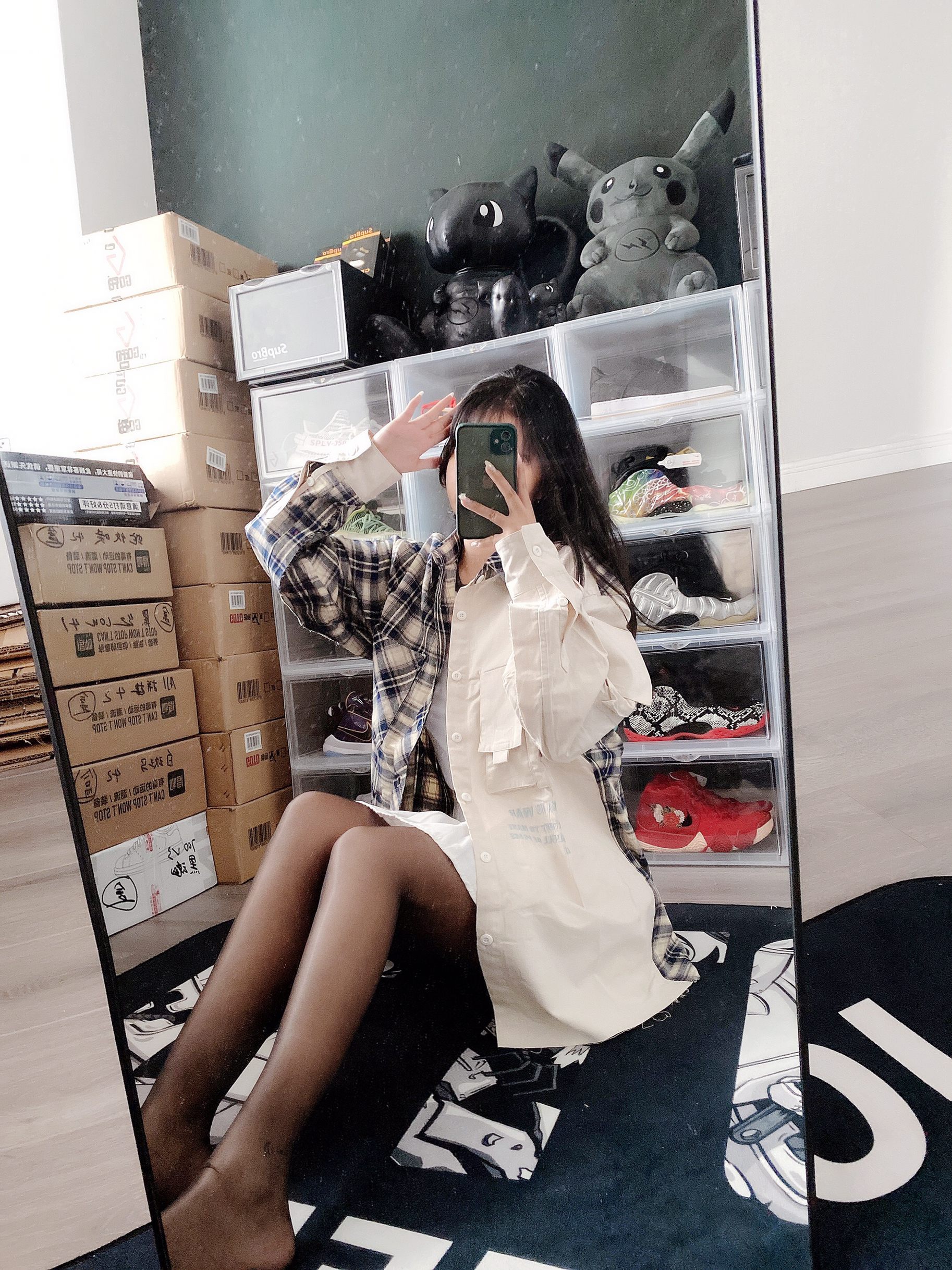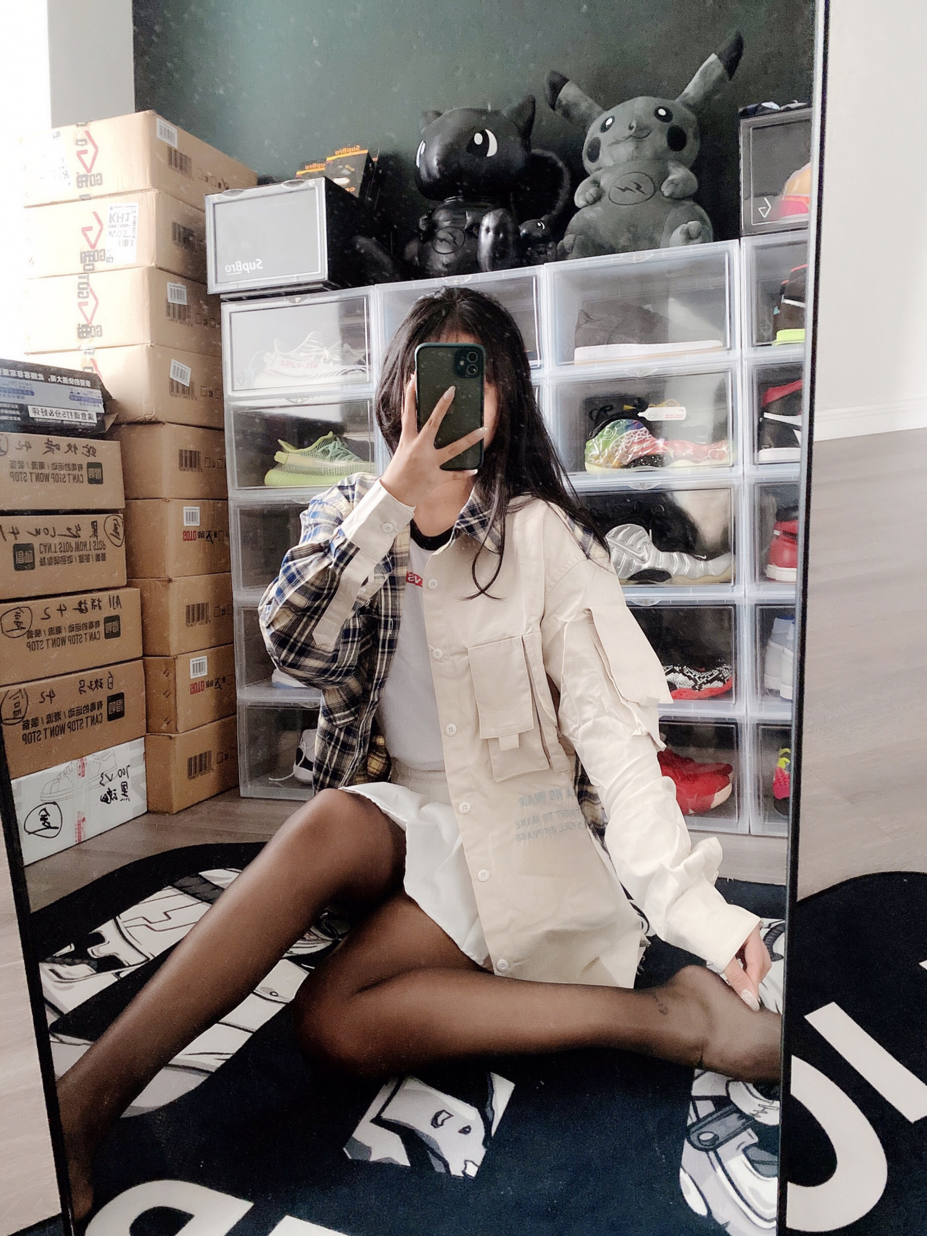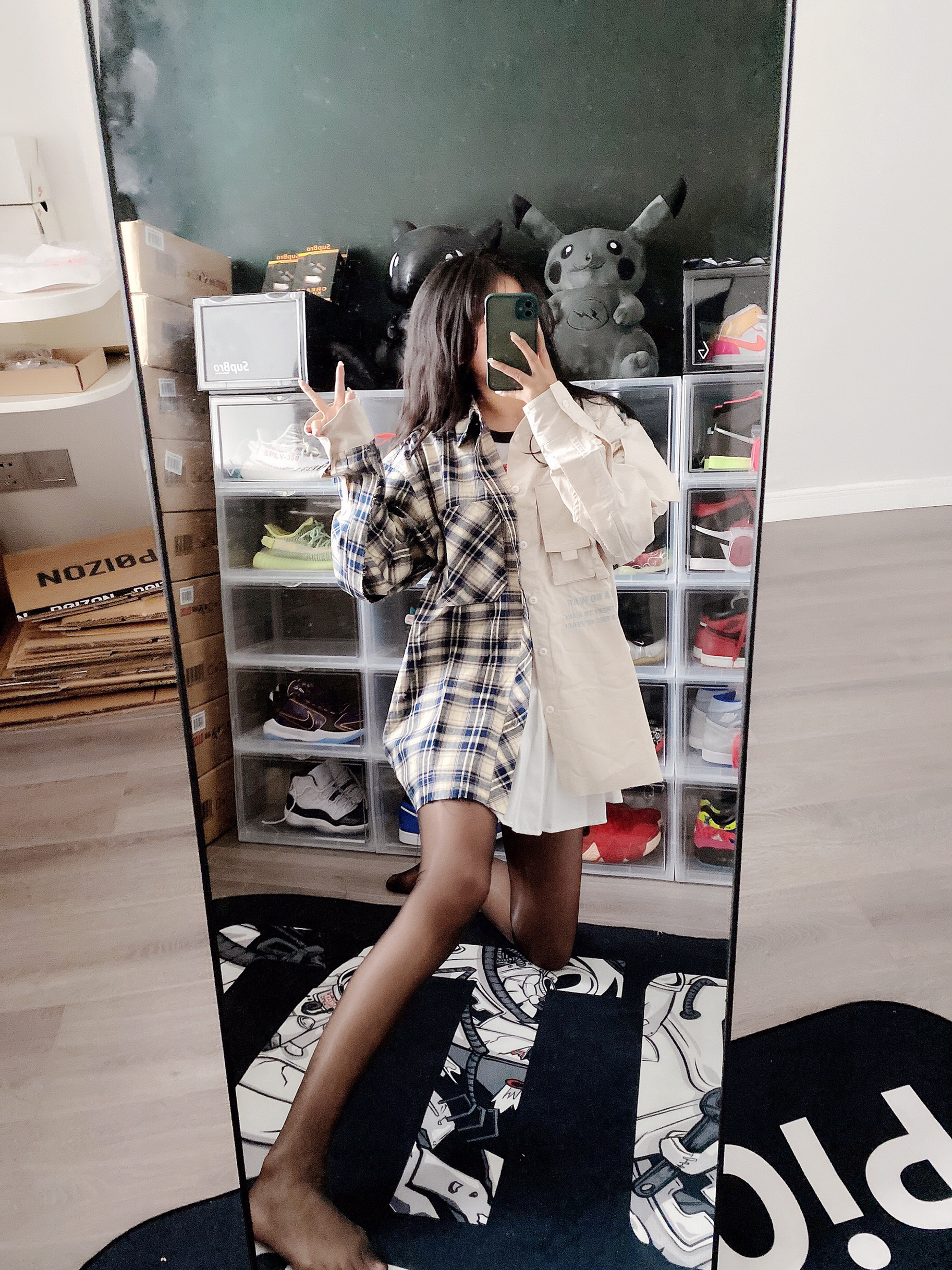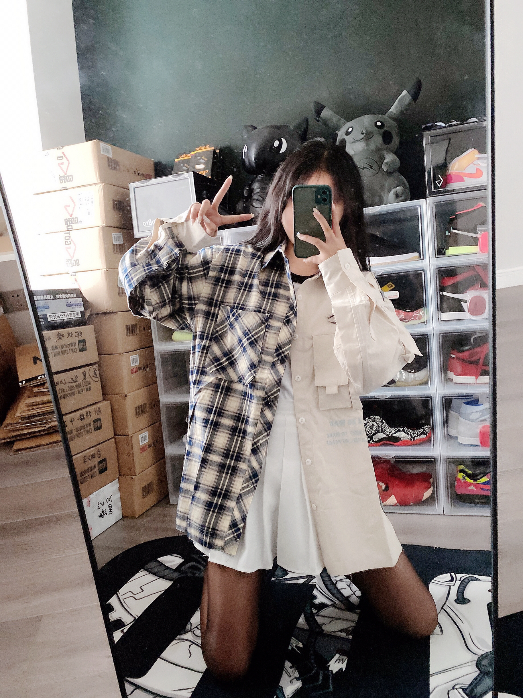👔:Guuka@GUUKA 👚:Levi\\\'s 👗:白色百褶裙 🧦:梦奇遇 太喜欢今天搭配的这个格子拼接衬衫了👔和往常的衬衫不一样的是~它采用的设计是拼接并且胸前还有个特别大的口袋~平时出门装手机或者卫生纸都很方便🤍💖而且这种设计非常潮流🧏♀️超级喜欢guuka家的衣服质量又好价格亲民💕