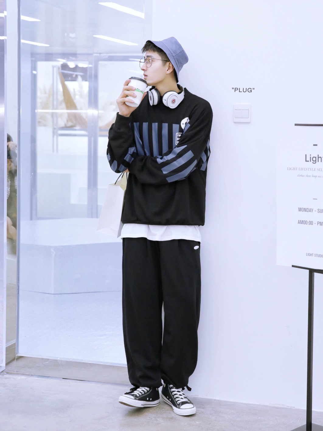 🔹周末快乐!这星期因为杭州下雨,天气不怎么好,所以我没有外出游玩,但我还是会分享穿搭给大家。今天这套黑色系休闲运动搭配,是我近期自己很喜欢的一套秋季穿搭LOOK。 — 🔹 🎩·帽子·蓝黑两面戴渔夫帽—KAXX; 👔·上衣·黑色宽松套头卫衣—PD大人; 👕·打底·白色短袖—UNIQLO优衣库; 🎧·耳机·白色头戴式耳机—BEATS; 👖·裤子·黑色宽松运动裤—PD大人; 🧦·袜子·白袜—LARGEE...