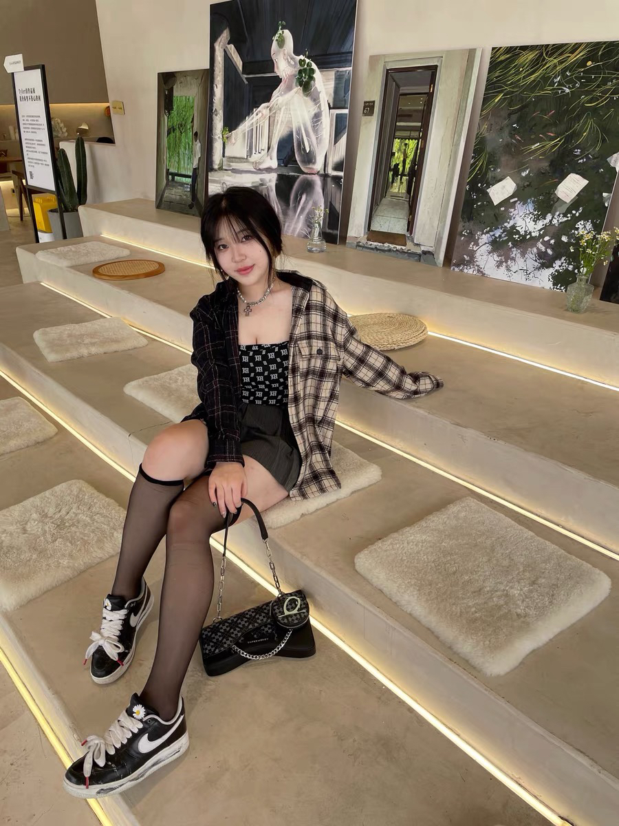 卫衣:ssur plus 联名iconslab 小熊印花连帽卫衣 短裙:蓝色格子小短裙 球鞋:椰子500