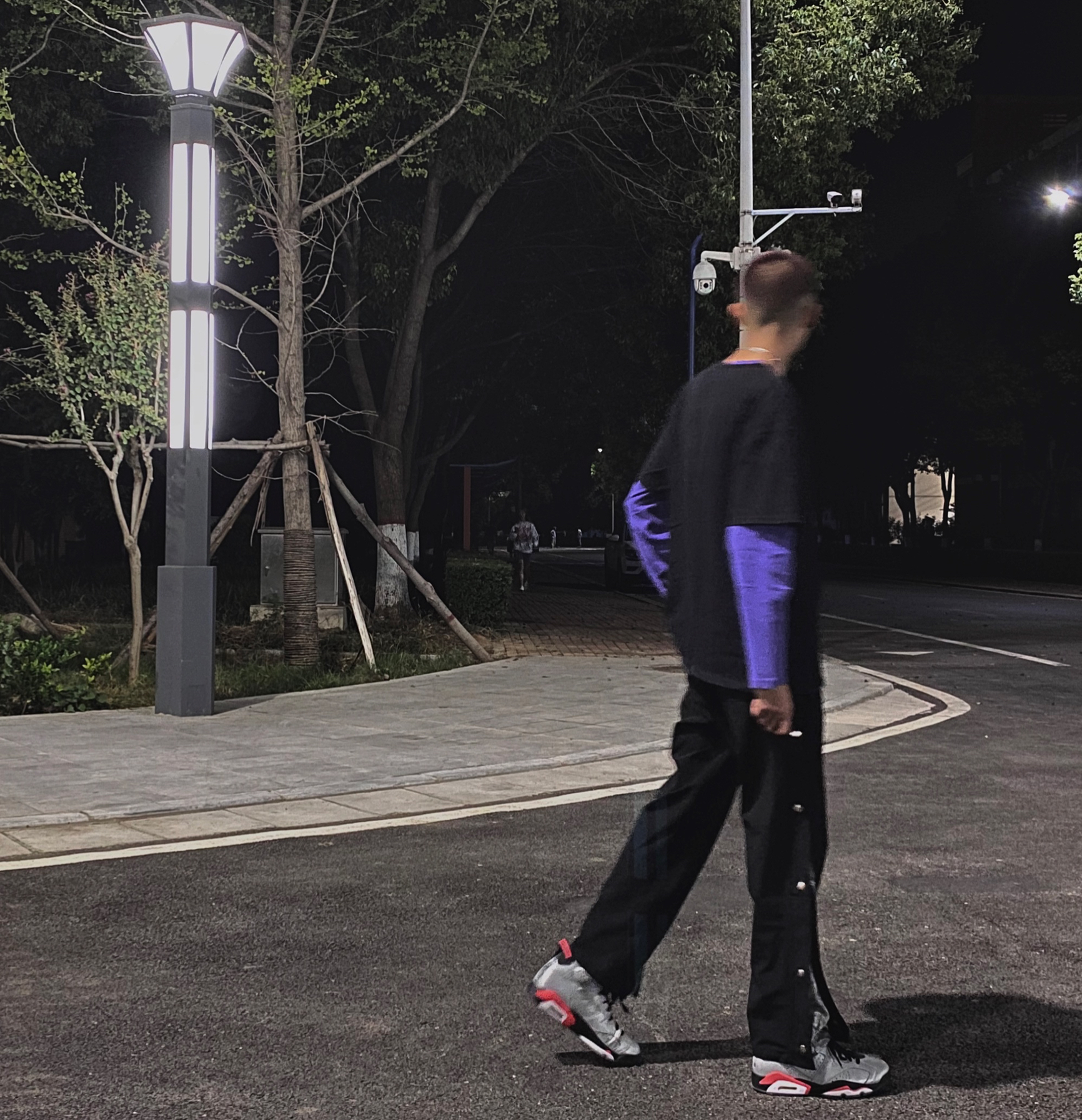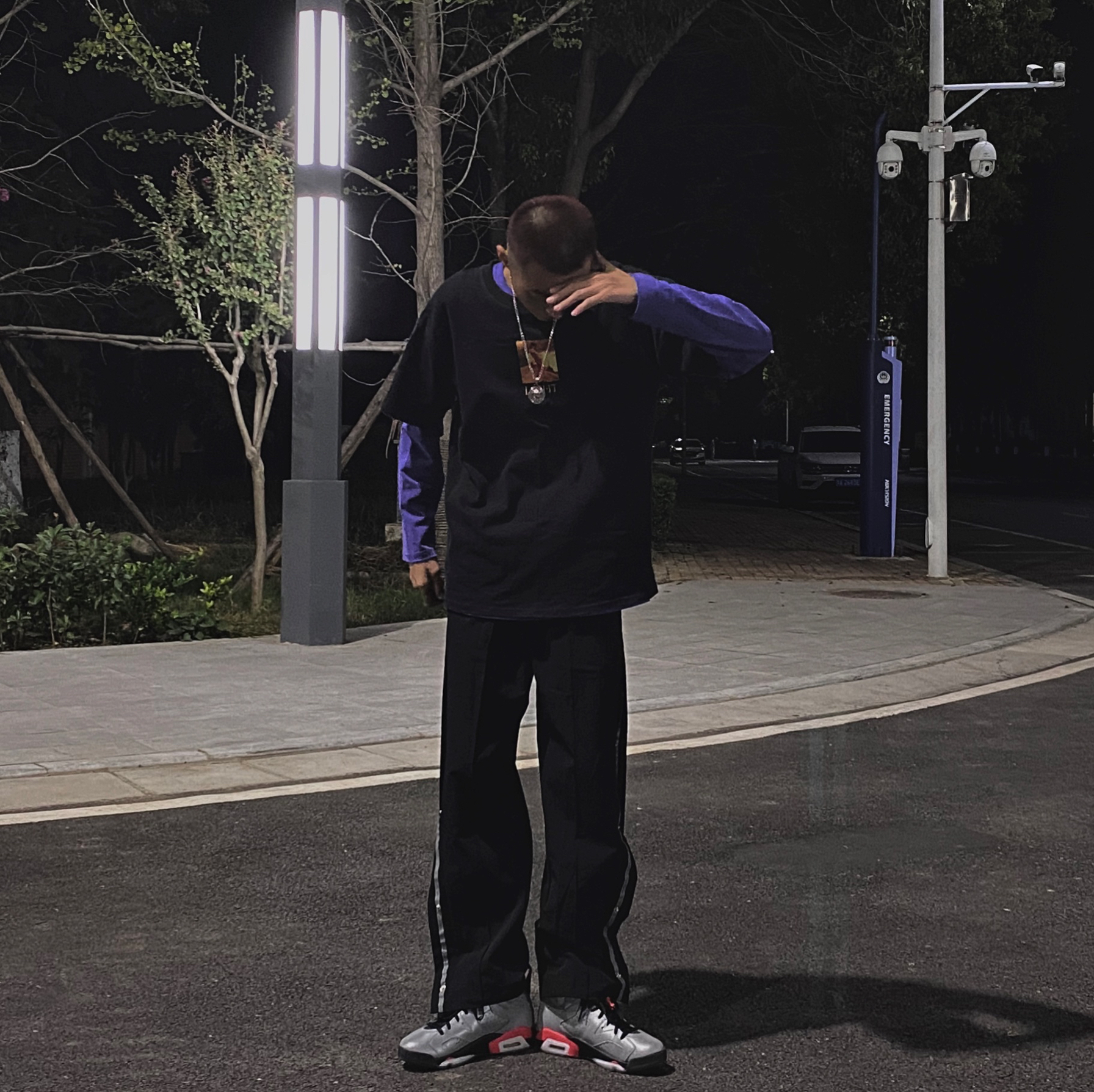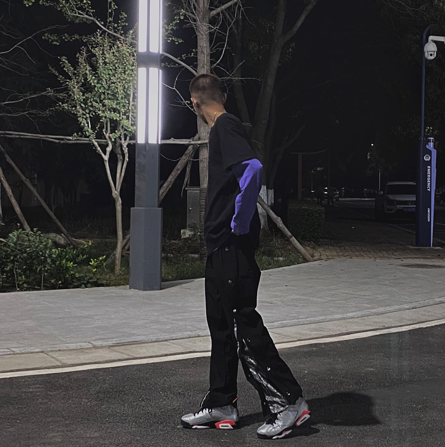 👕 : 17Y6 黑色短袖叠穿紫色内搭 👖 : UTTERER 黑色排扣裤布料很舒服腰果花设计很细节看起来很有质感裤边还有反光条设计 👟 : AJ6 3M反光