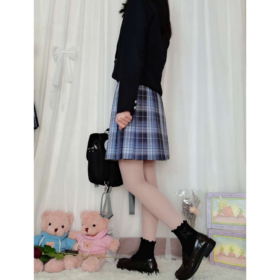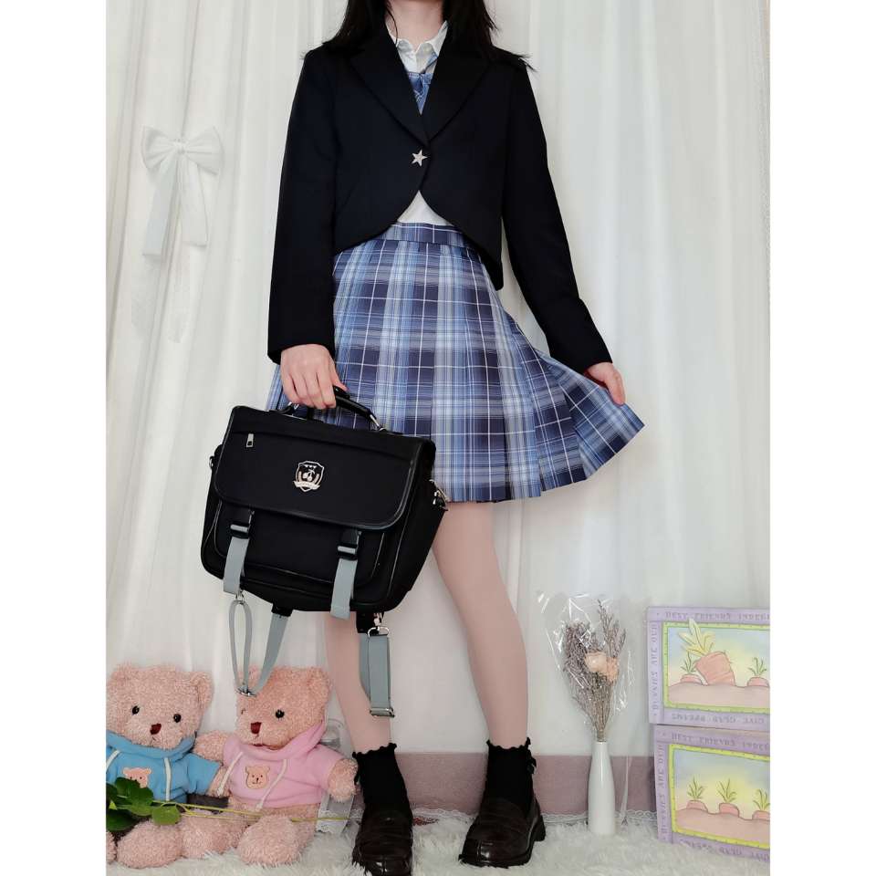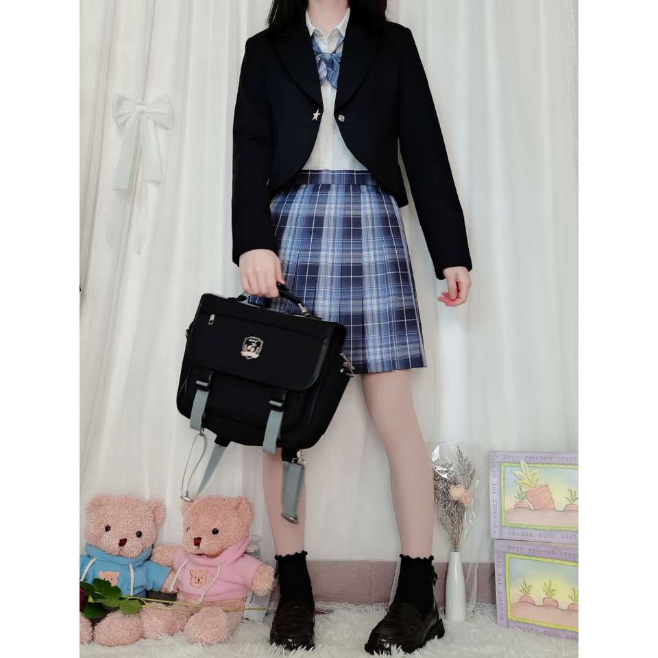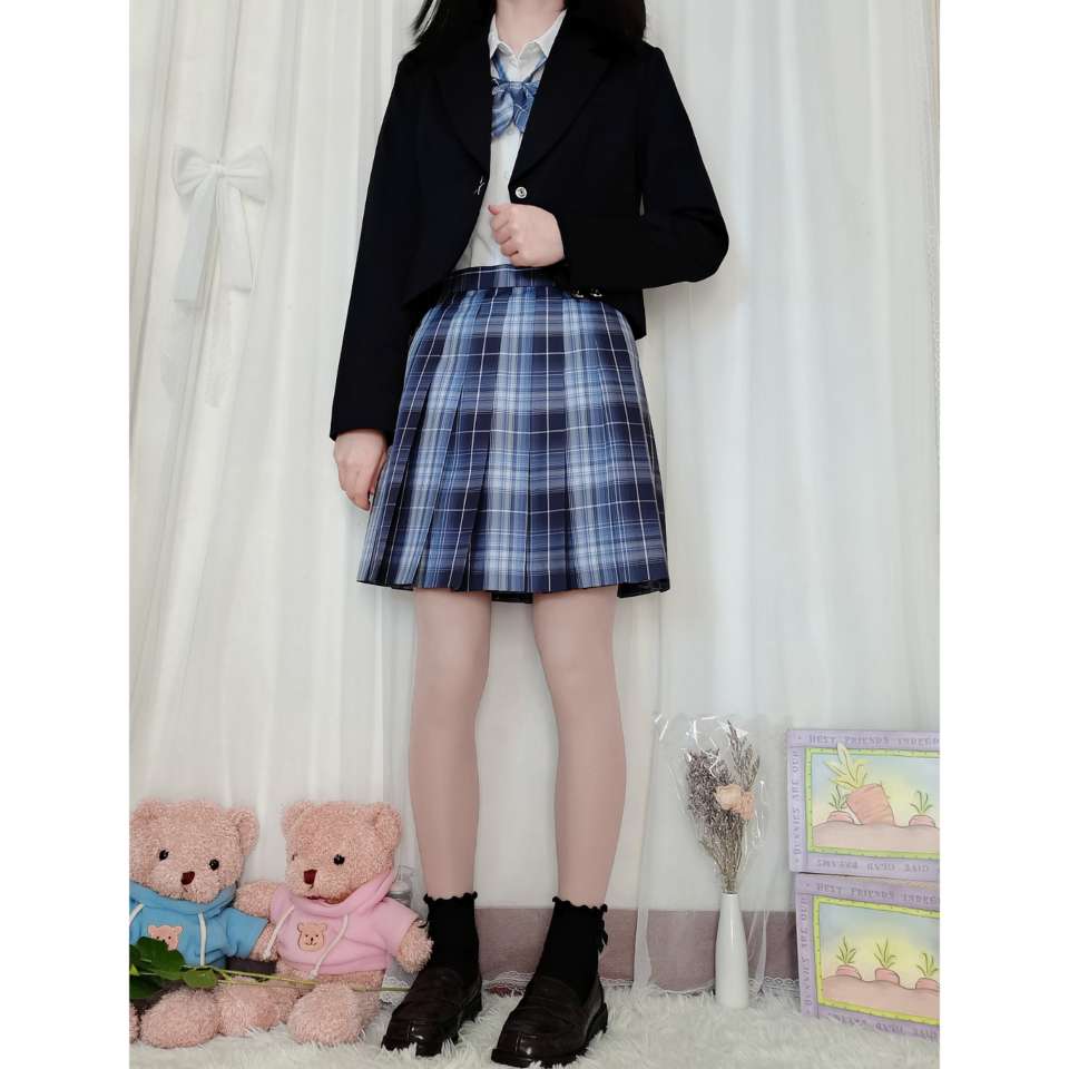 西服:西西酱jk【圣星川】 👔:优等生原创【春暖花开】 👗:晴天社jk【咫尺光年】 这件小西服是短款的喔,很适合jk来穿着,为什么店家将西服名字取名为圣星川呢?因为西服的小扣子是一颗★的设计喔!