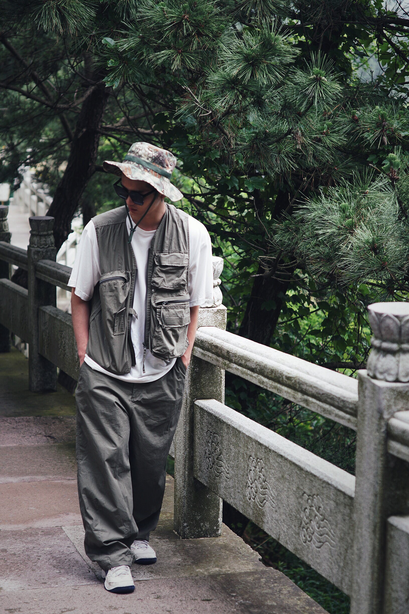 说到工装单品,多口袋马甲自然必不可少,穿上不管走哪我都是户外猛男🤛,同时也增加了层次感,下身选择的是一条同色系的工装裤,蟒纹渔夫帽给造型增加一些野性