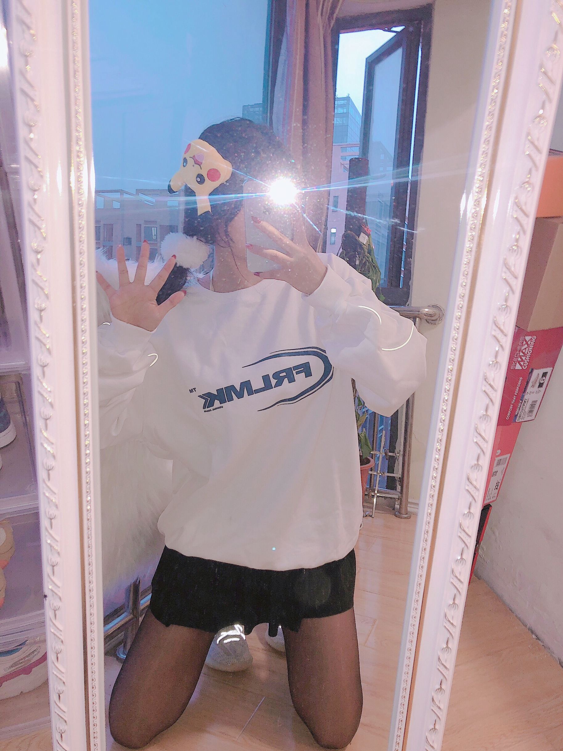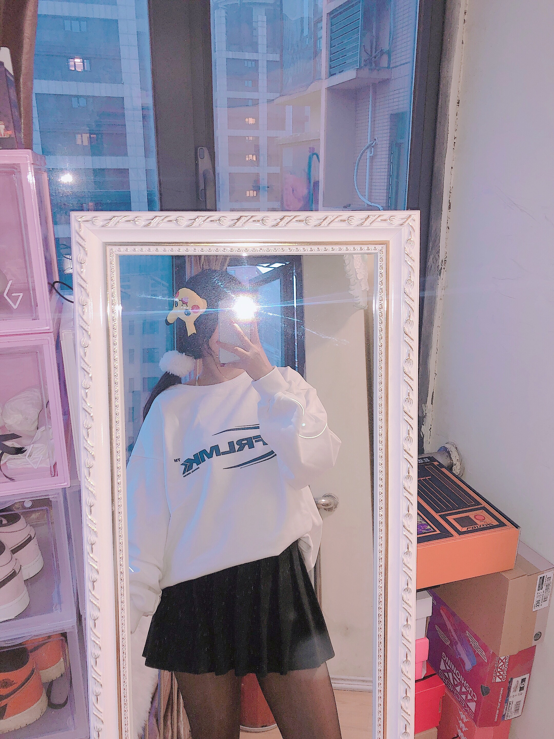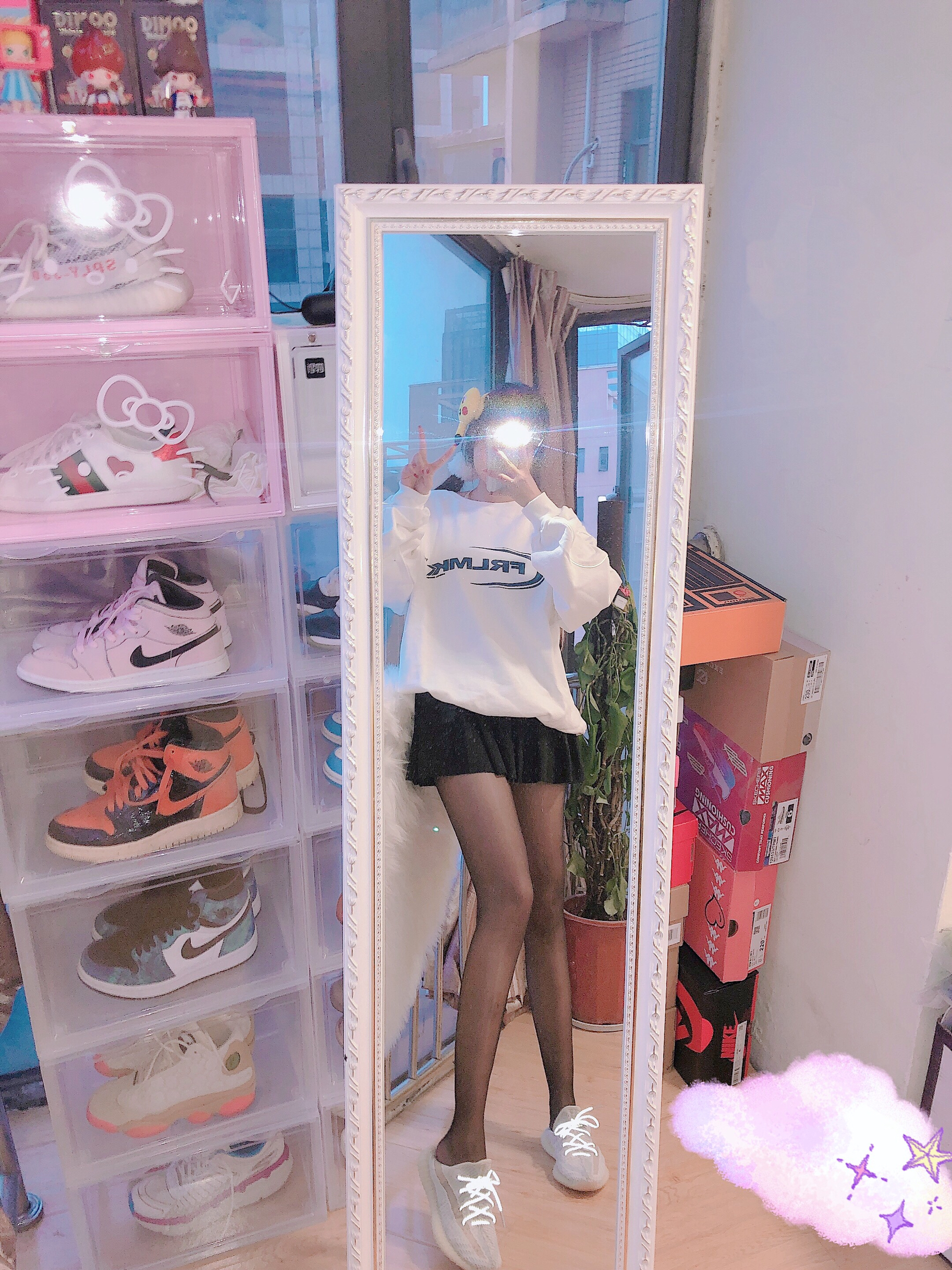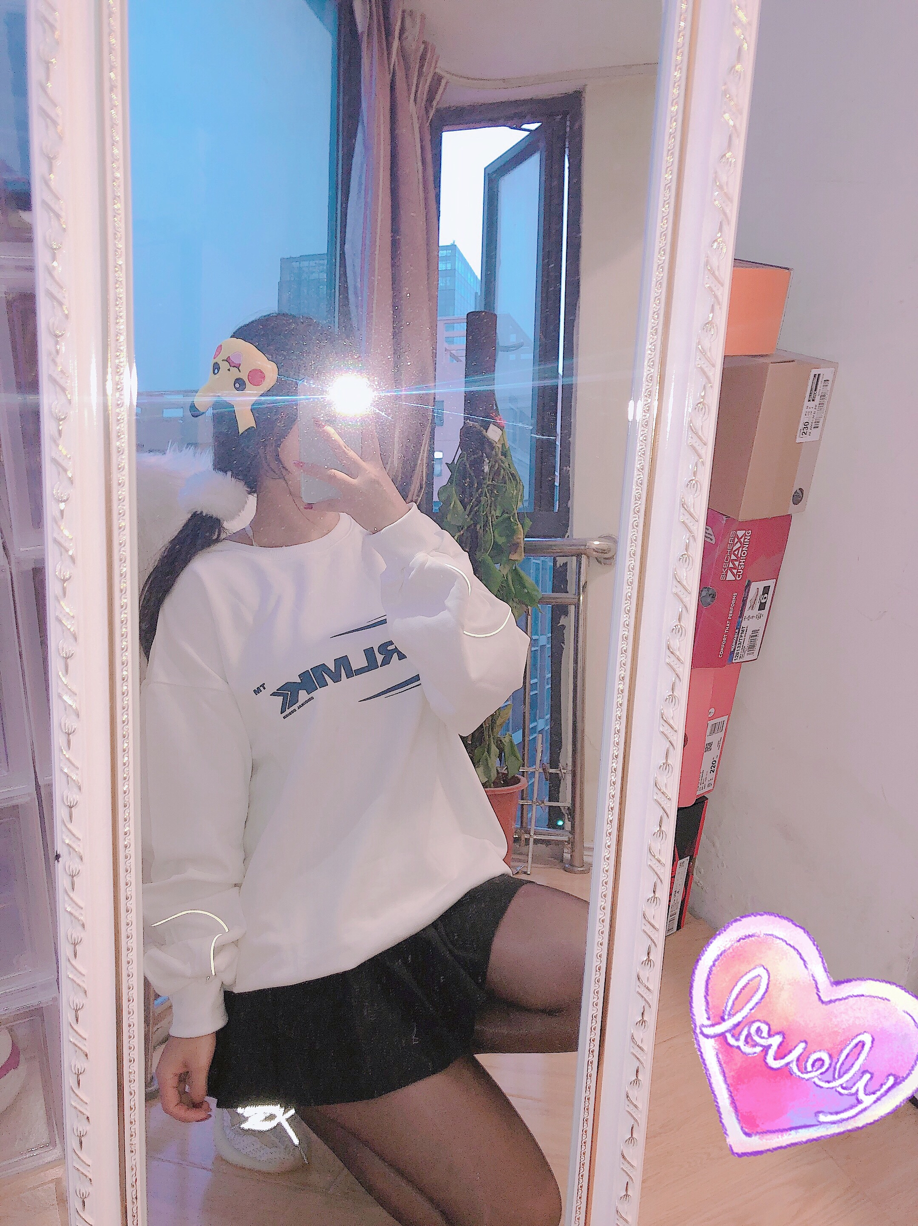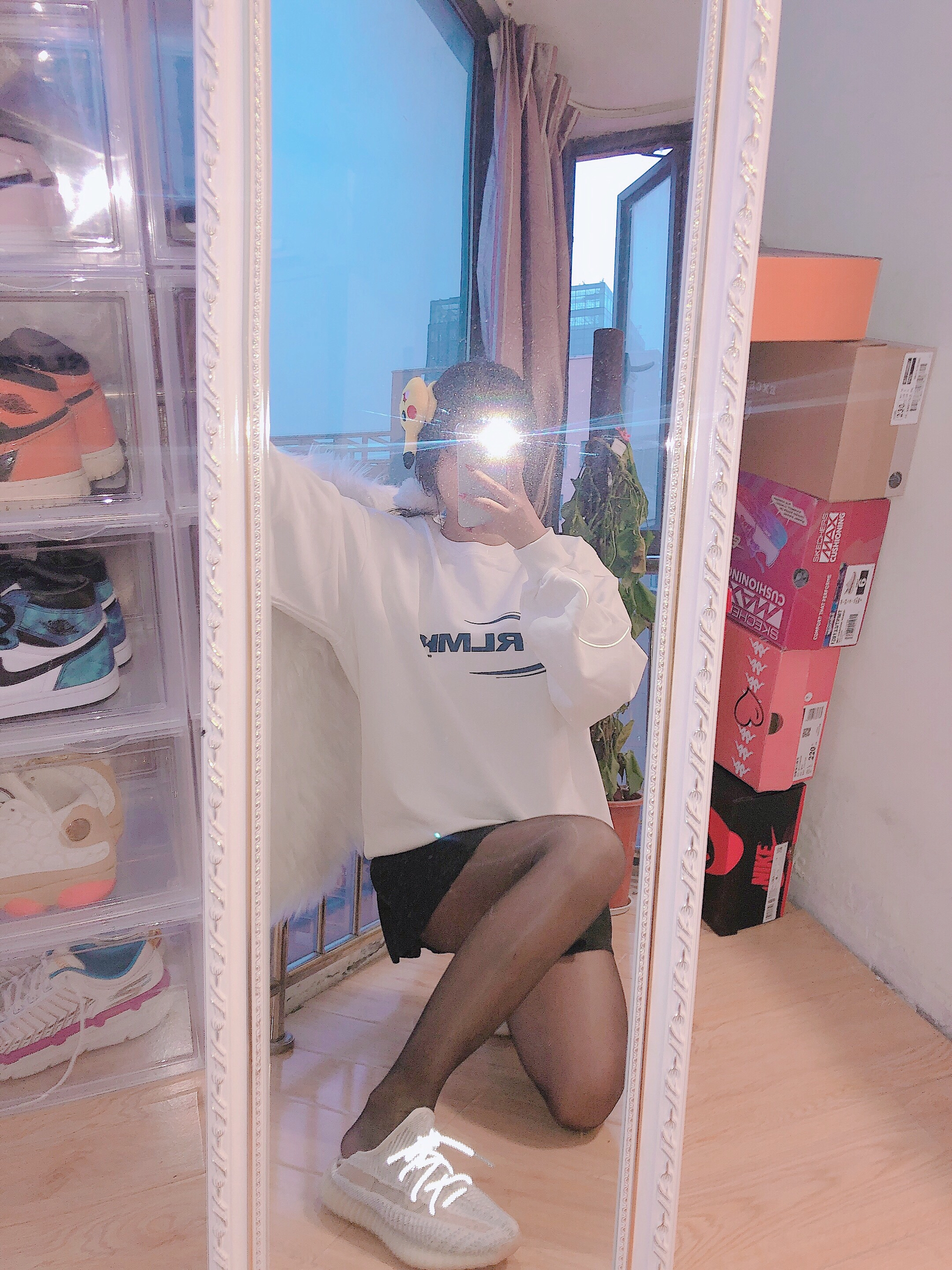 👔:Frlmk 👗:黑色百褶裙 👟:yeezy芝麻天使 今日搭配卫衣和黑丝袜~基础款的卫衣穿着特别舒服袖子的侧边有条纹是可以闪光灯发光的和yeezy呼应上了💓这个卫衣字母蓝色设计非常简约和小清新💙