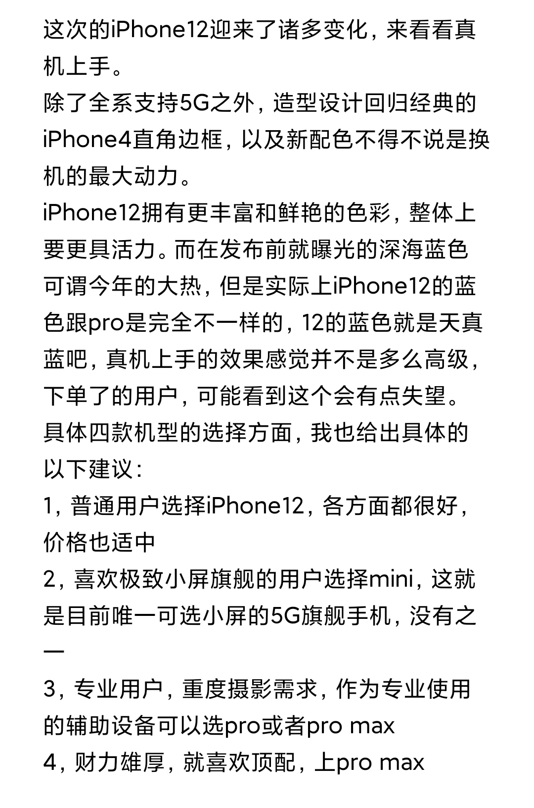 这次的iPhone12迎来了诸多变化,来看看真机上手。 除了全系支持5G之外,造型设计回归经典的iPhone4直角边框,以及新配色不得不说是换机的最大动力。 iPhone12拥有更丰富和鲜艳的色彩,整体上要更具活力。而在发布前就曝光的深海蓝色可谓今年的大热,但是实际上iPhone12的蓝色跟pro是完全不一样的,12的蓝色就是天真蓝吧,真机上手的效果感觉并不是多么高级,下单了的用户,可能看到这个会...