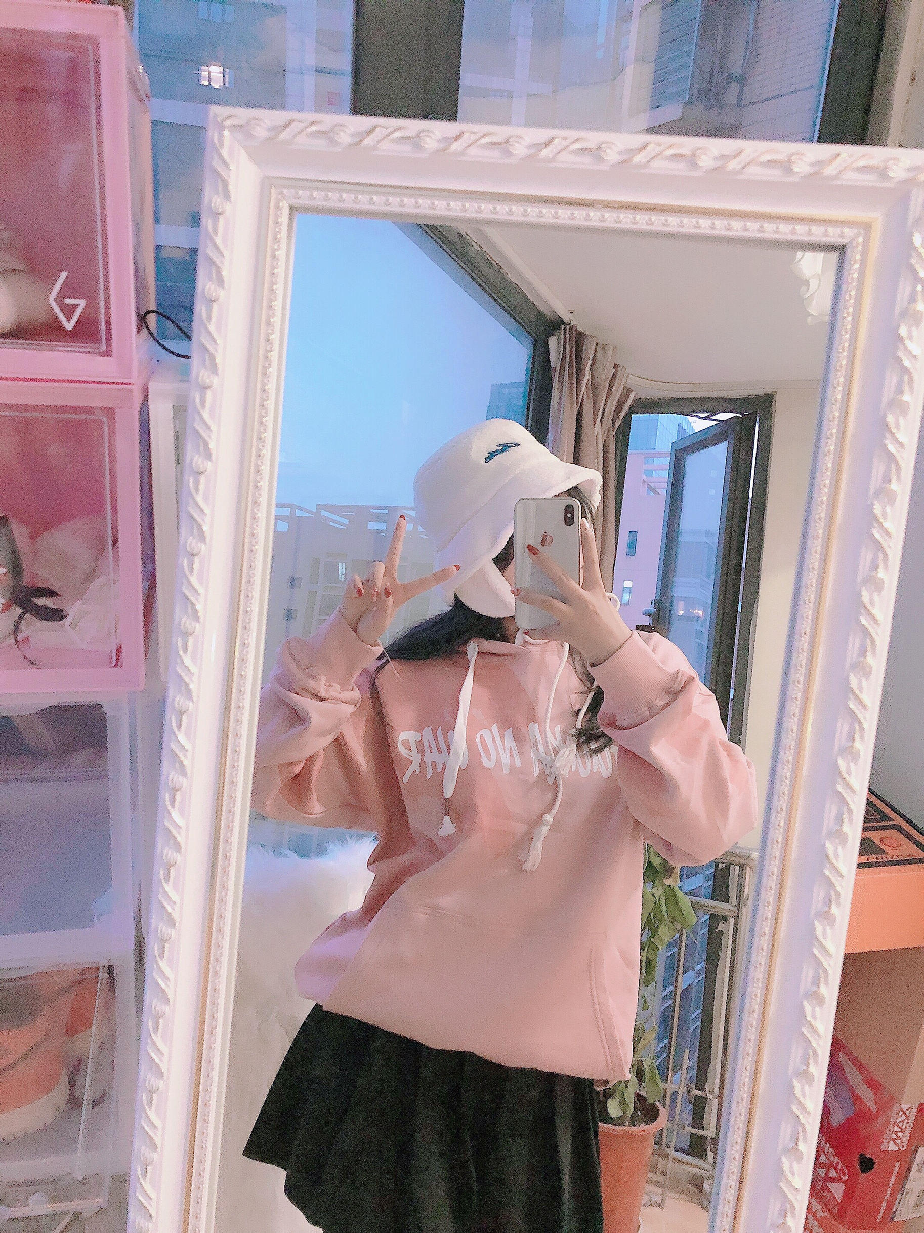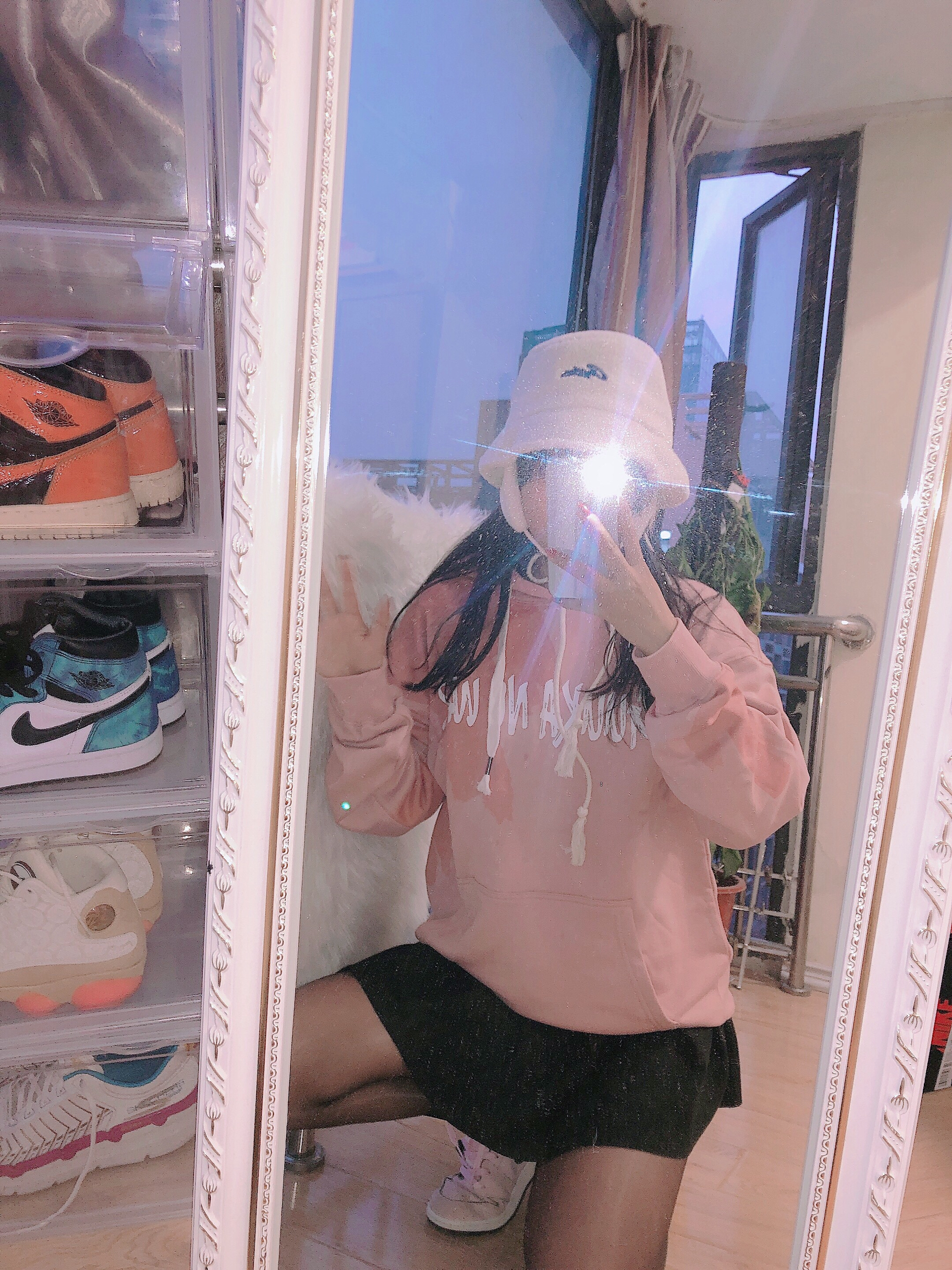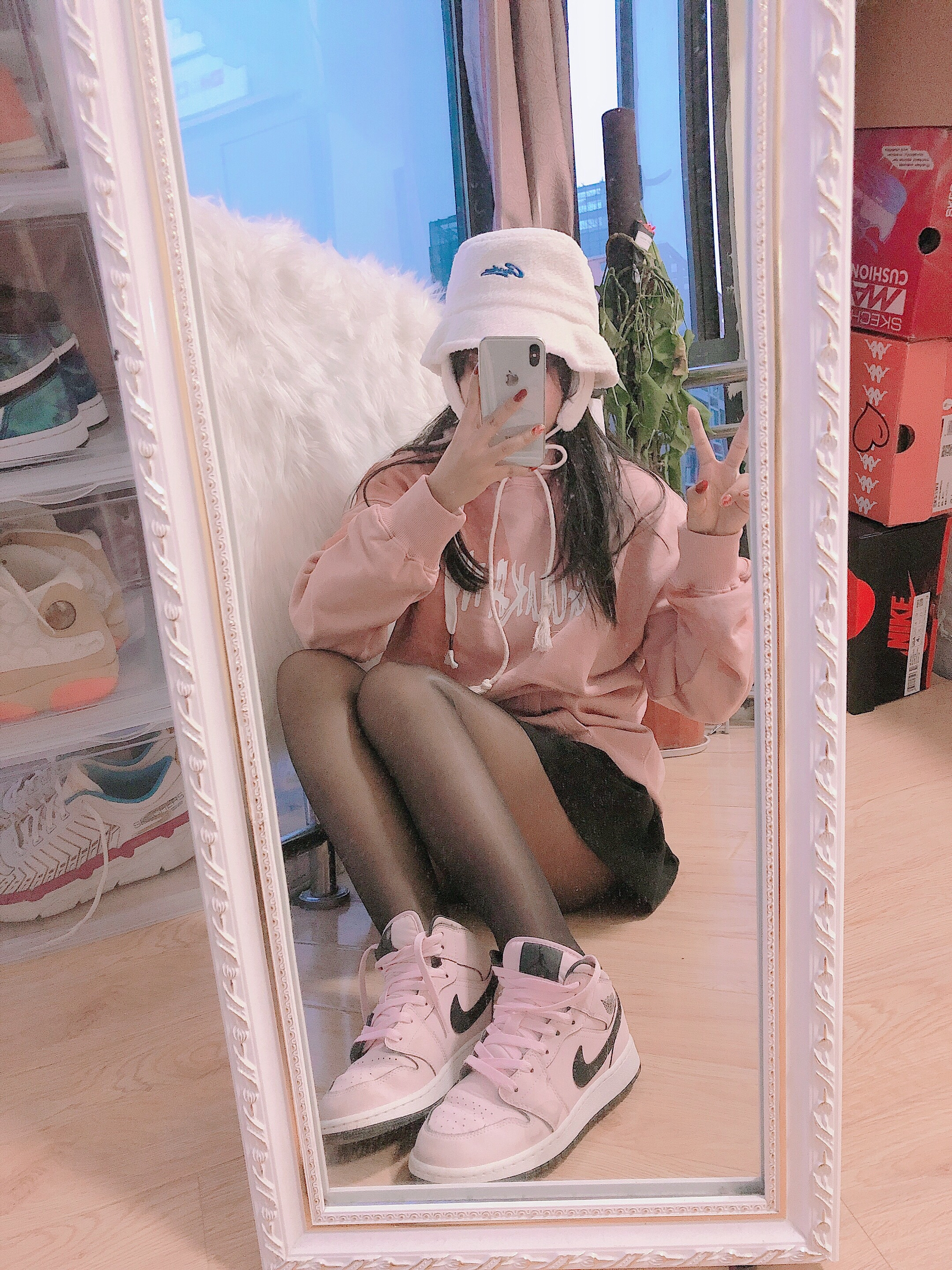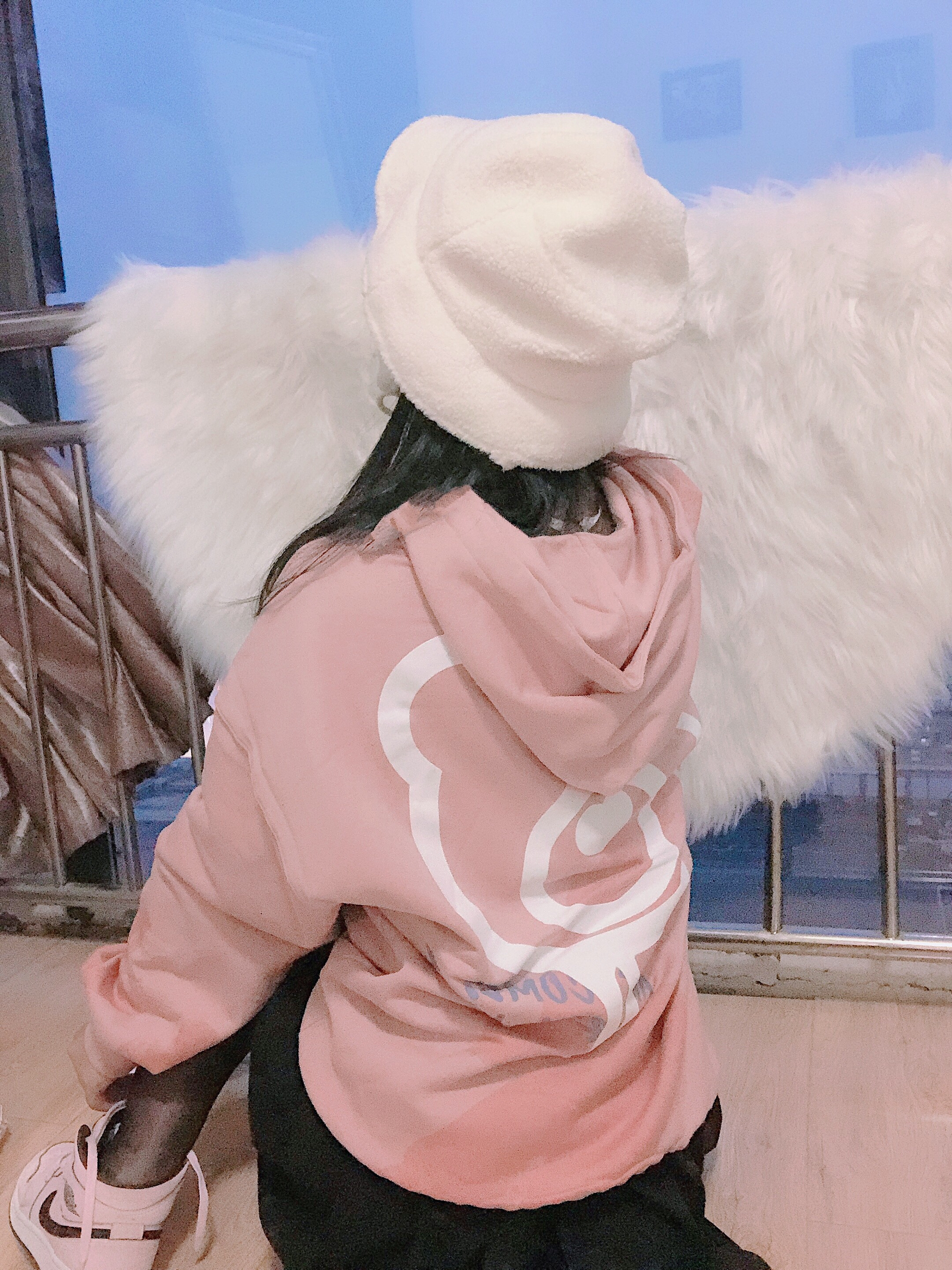 👔:Guuka 👗:黑色百褶裙 🧢:Guuka 👟:Aj樱花粉 今日份粉色甜美仙女搭配💕粉色卫衣渐变色有白色字母搭配整体非常的特别设计感很足~不容易撞衫✨💓拼色的感觉非常好看!!!然后帽子🧢也是搭配guuka家羊羔毛帽子耳朵旁边有挡风小细节这样冬天耳朵不会受凉了~🌟🙈