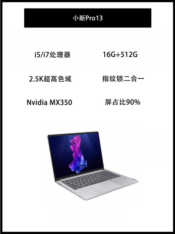 联想(Lenovo)小新Pro13 配置参数: 采用英特尔i5/i7处理器6核心12线程,可轻松驾驭大型开发设计软件,屏幕采用2.5K超高色域屏,屏占比达到90%,亮度300nits,全新的Nvidia MX350独立显卡,相比上代图形性能提升20%,带来了更流程的系统体验。 用户体验: 外观高大上,金属机身,轻薄程度尚可,屏幕清晰,很轻薄携带方便开盖就能开机,支持人脸识别,开机速度快,系统运行...