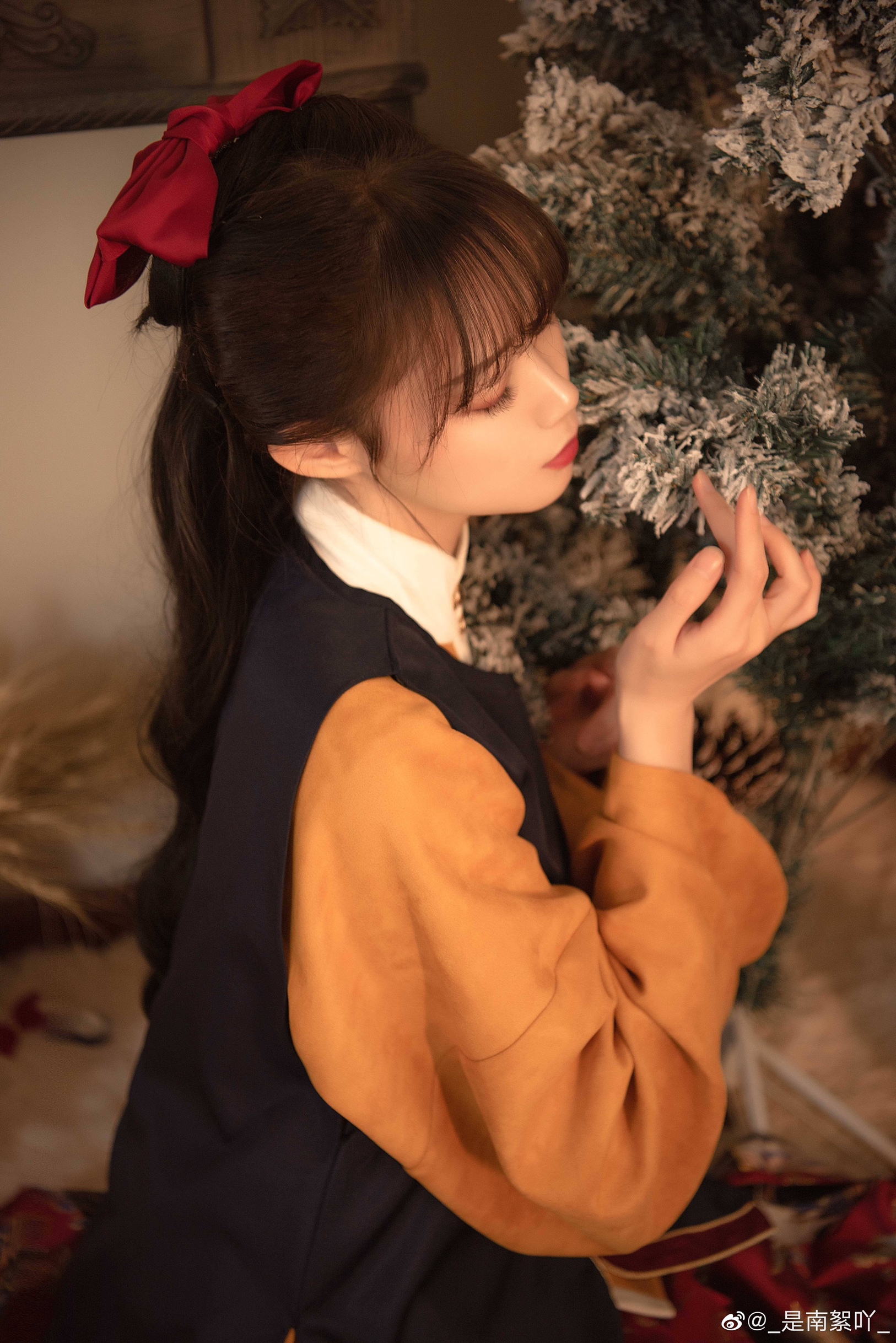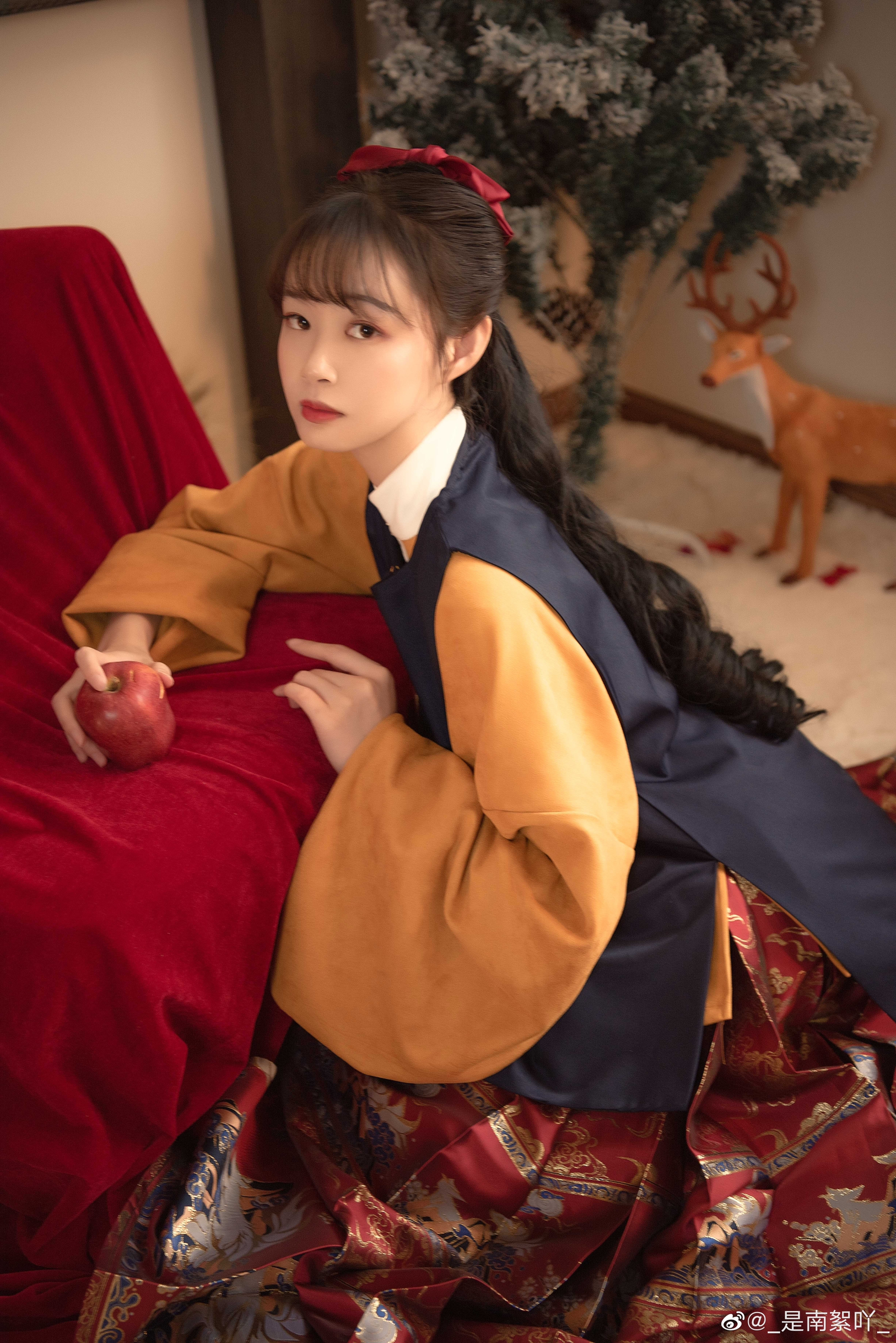 红黄蓝的色彩运用是不是代入了点白雪公主的感觉呢🌝虽说比甲的颜色是深了点,但也十分融洽🥳 传统的汉服搭配红色蝴蝶结🎀与长卷发👩🦱立马就俏皮了起来🧚♀️ 立领+比甲:云出岫 马面:远山黛