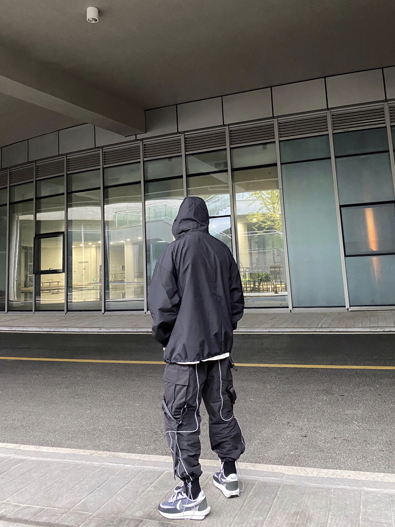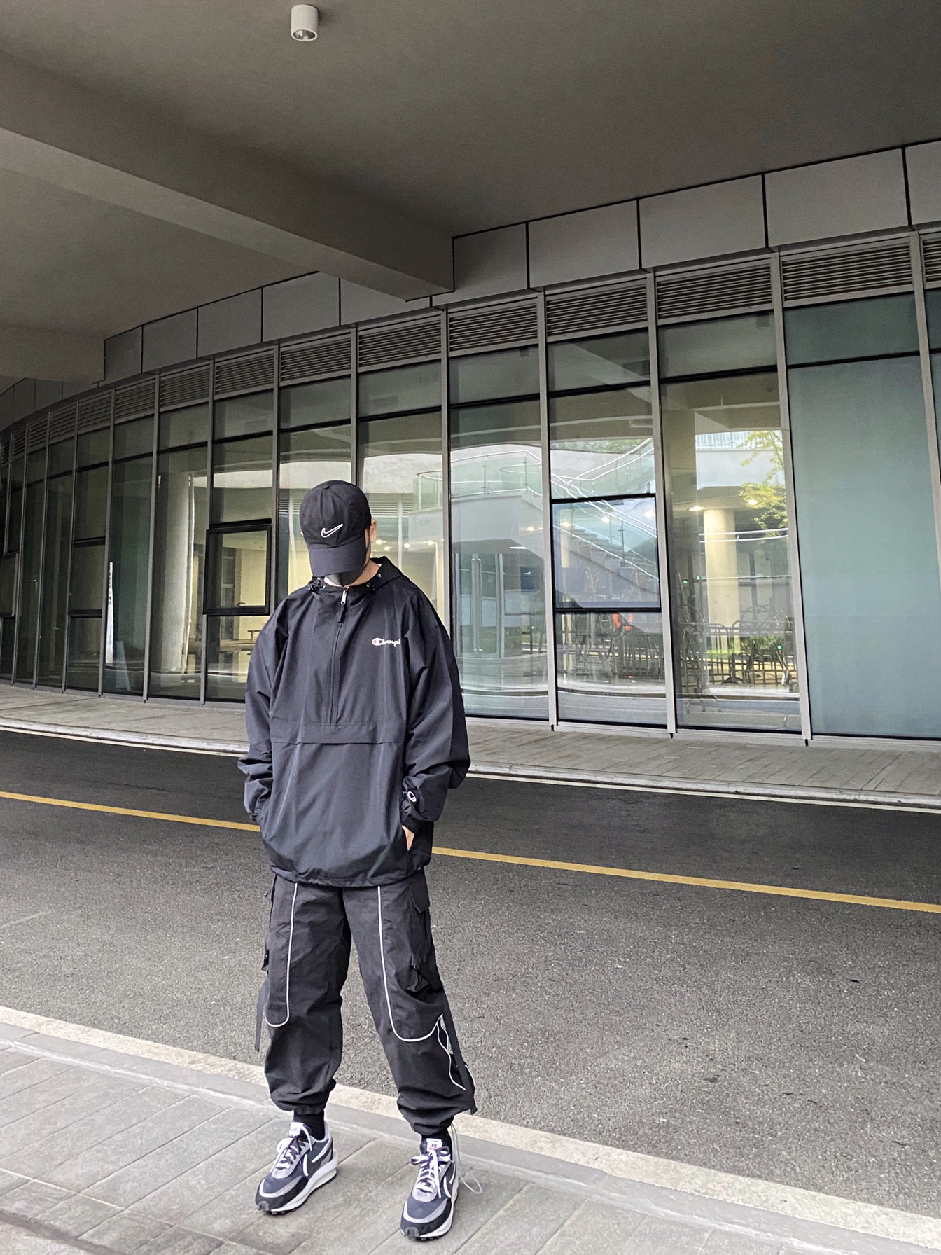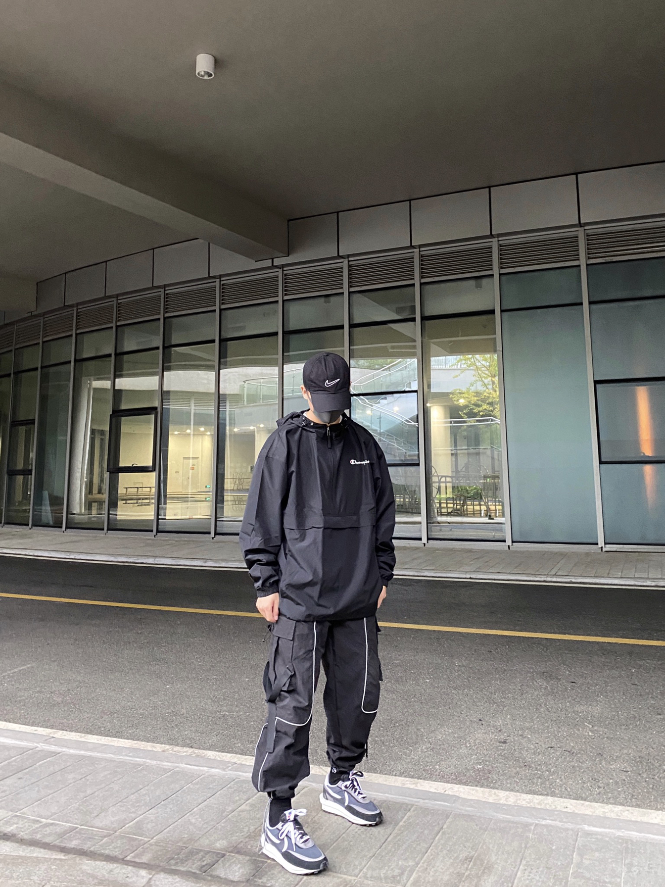 👕:champion 👖:气泡因子 champion也算我一直在入手的老品牌了 虽然也不贵 但是很担心在别处会买到fake 现在champion入驻得物后终于省心了 可以直接冲!这款冲锋衣就很不错 算是简简单单的基础百搭款了 价格也便宜 配上一条有细节的反光伞兵机能抽绳束脚裤 就很稳了 然后突然发现这双sacai配上抽绳裤也不错!之前都是搭配牛仔裤 感觉对壮士不太友好 现在好了 这个裤子啥身材...