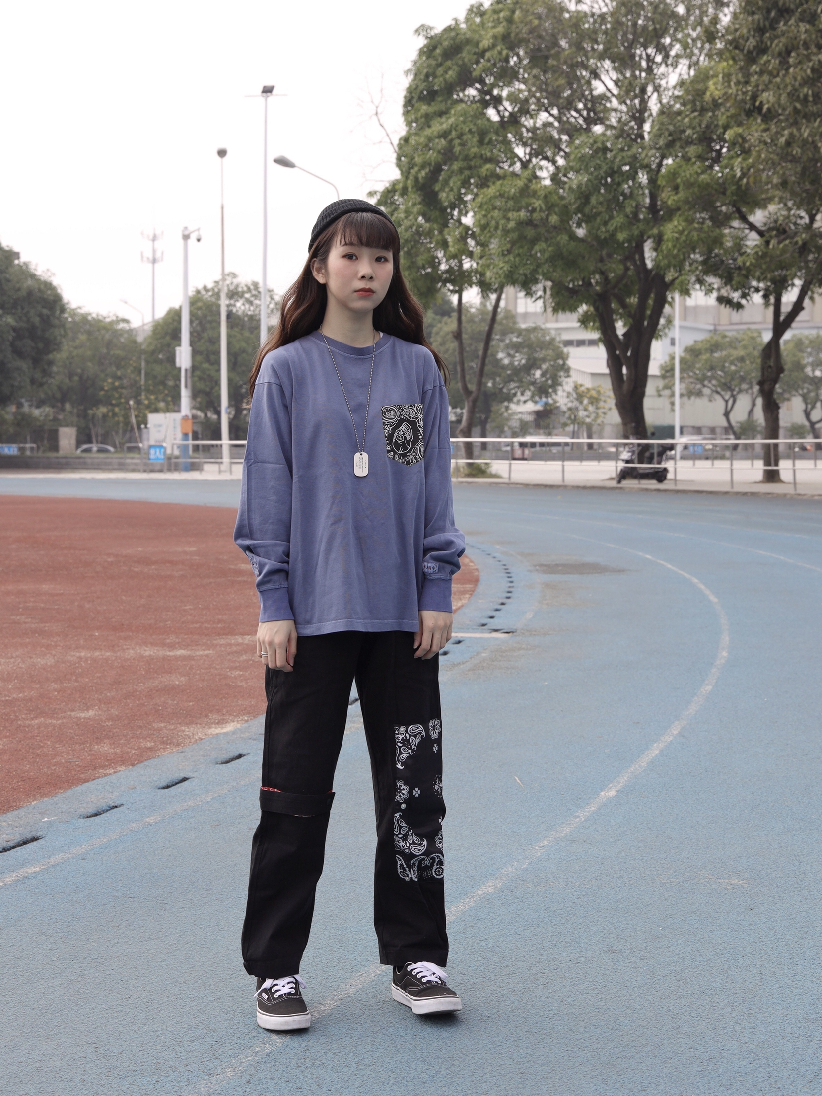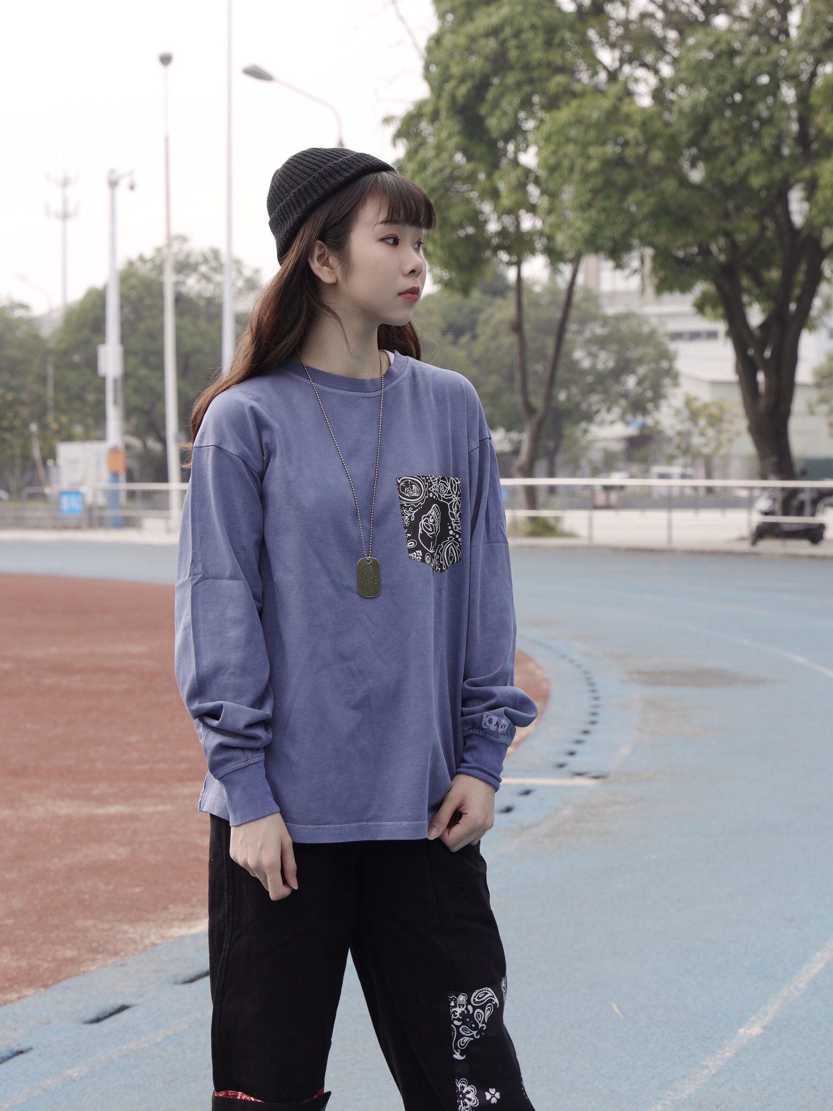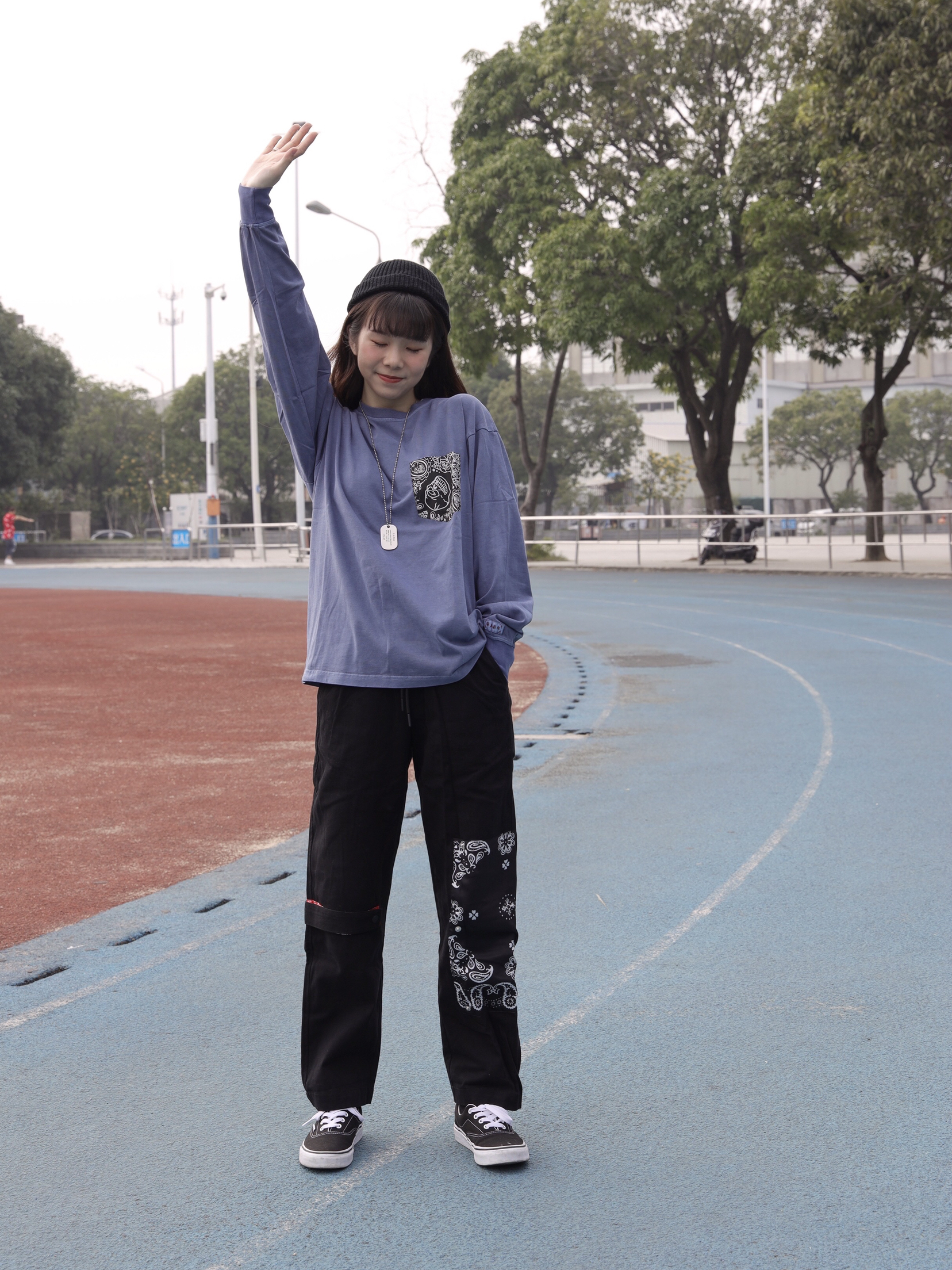 长袖:华人青年 这件华人青年x高山隆的联名T恤 紫蓝色视觉上非常舒服 口袋设计是比较中国风的设计 袖口也有标签点缀 也是比较有细节感的T恤 版型上身非常合适 裤子:legend 可拆卸腰果花长裤 设计感也很强 有局部的腰果花贴布设计独特又好看 点缀一下裤子以外 和衣服上下呼应非常搭!满满的中国风的一套 非常讨喜 鞋子:vans 百搭快的帆布鞋 黑色耐脏又日常!