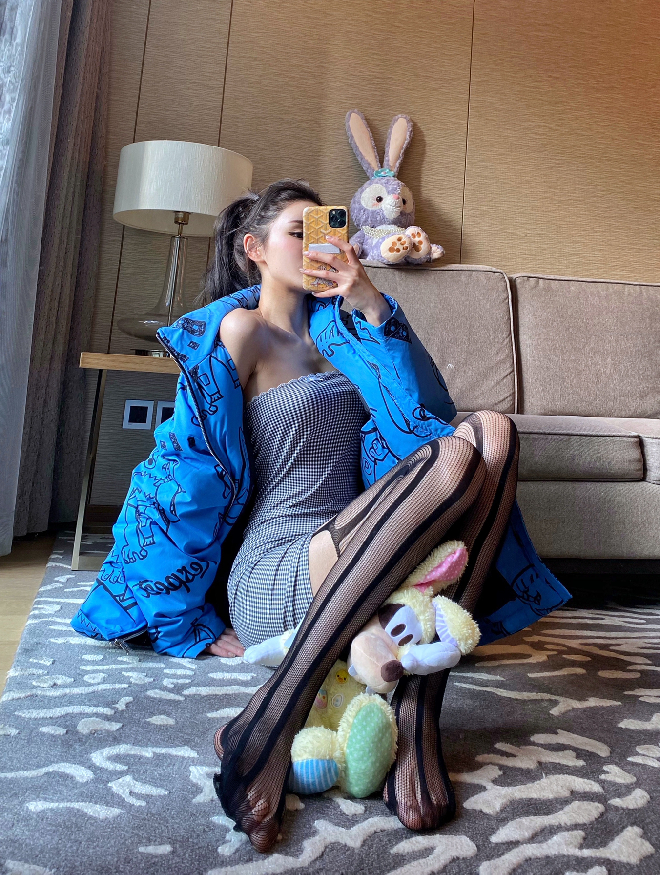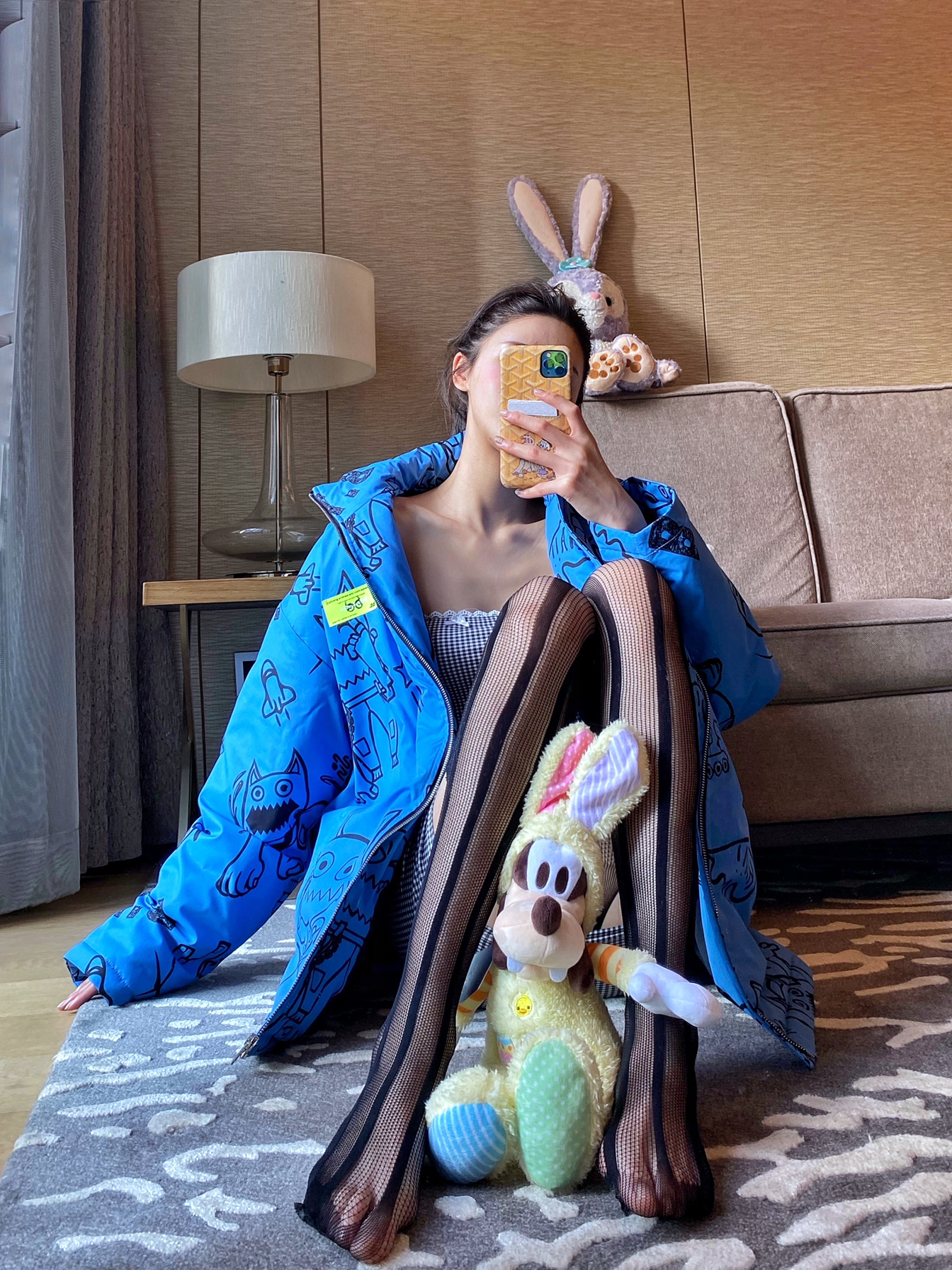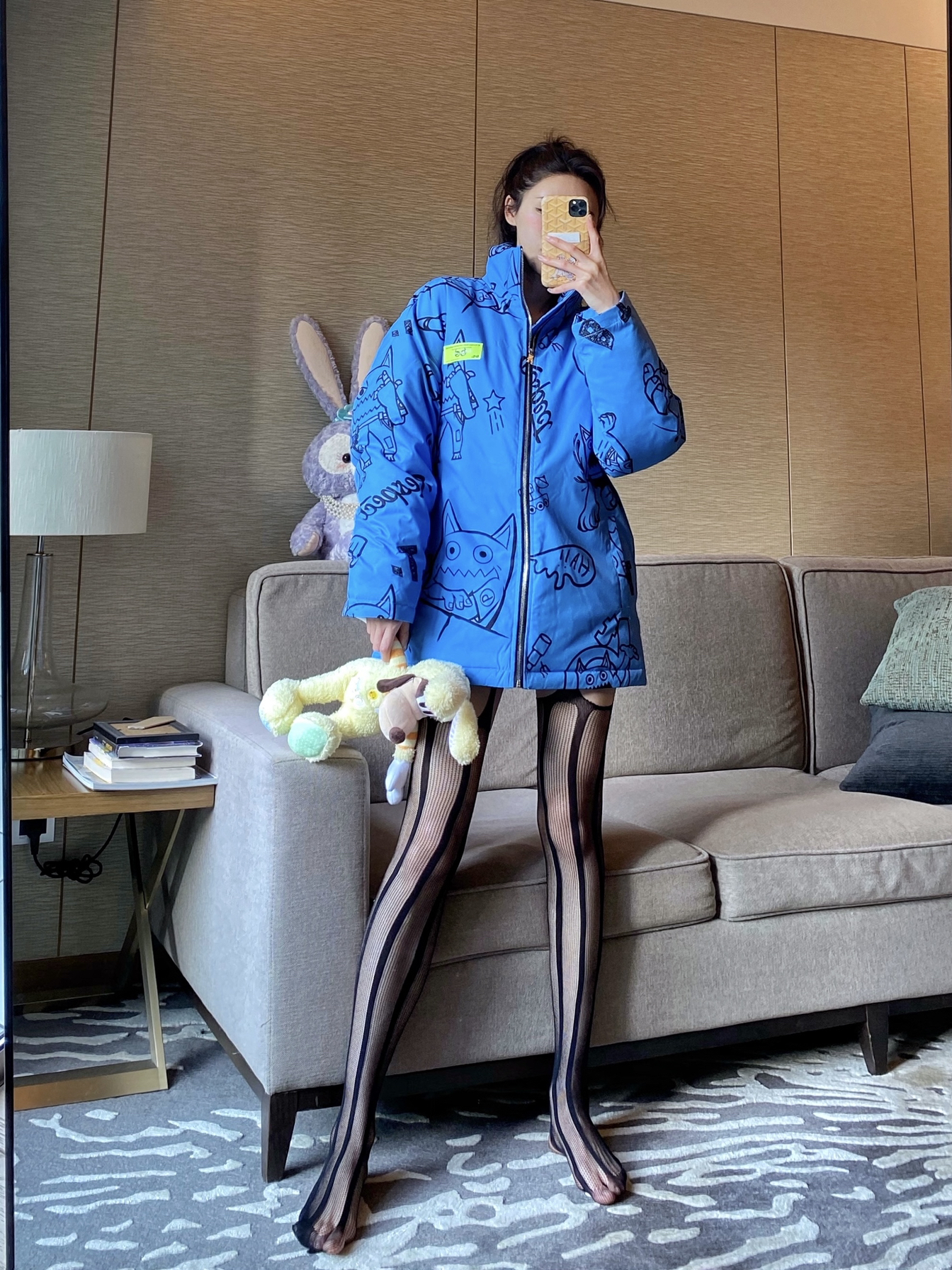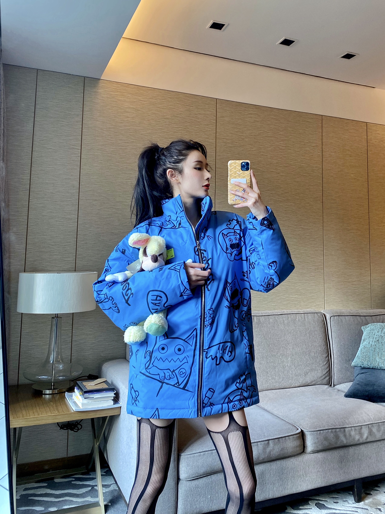 机能男友风 蓝色大棉服+潮元素图案 欠缺点柔美感 内搭吊带+丝袜 今日份纯欲风get!