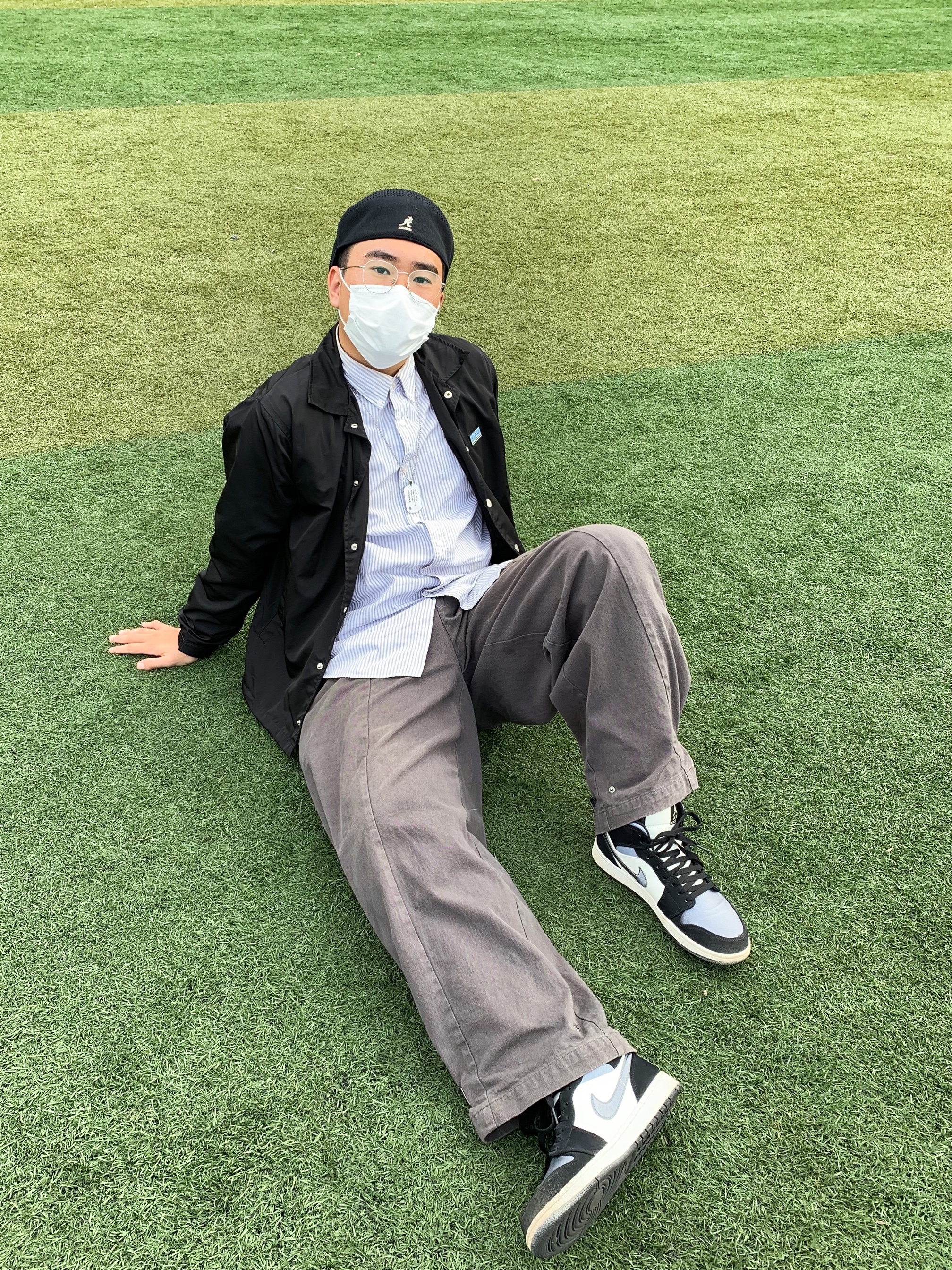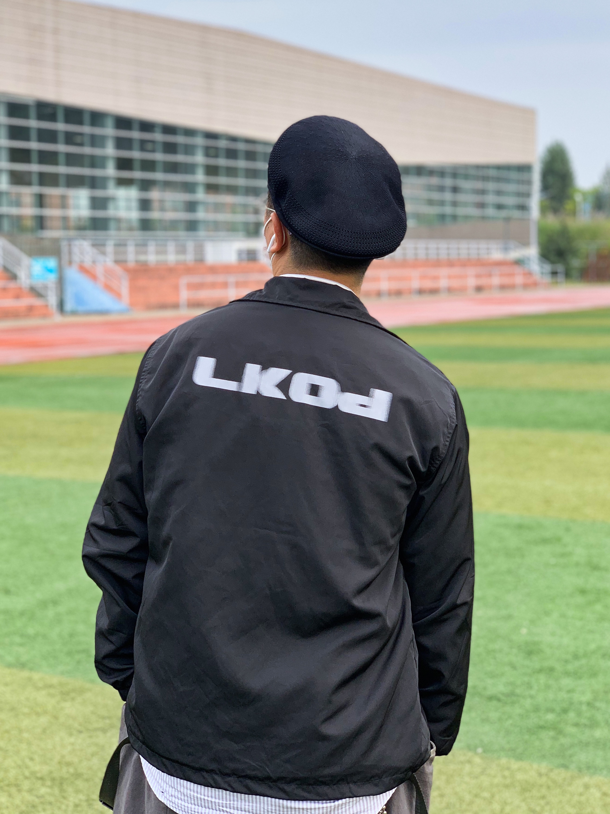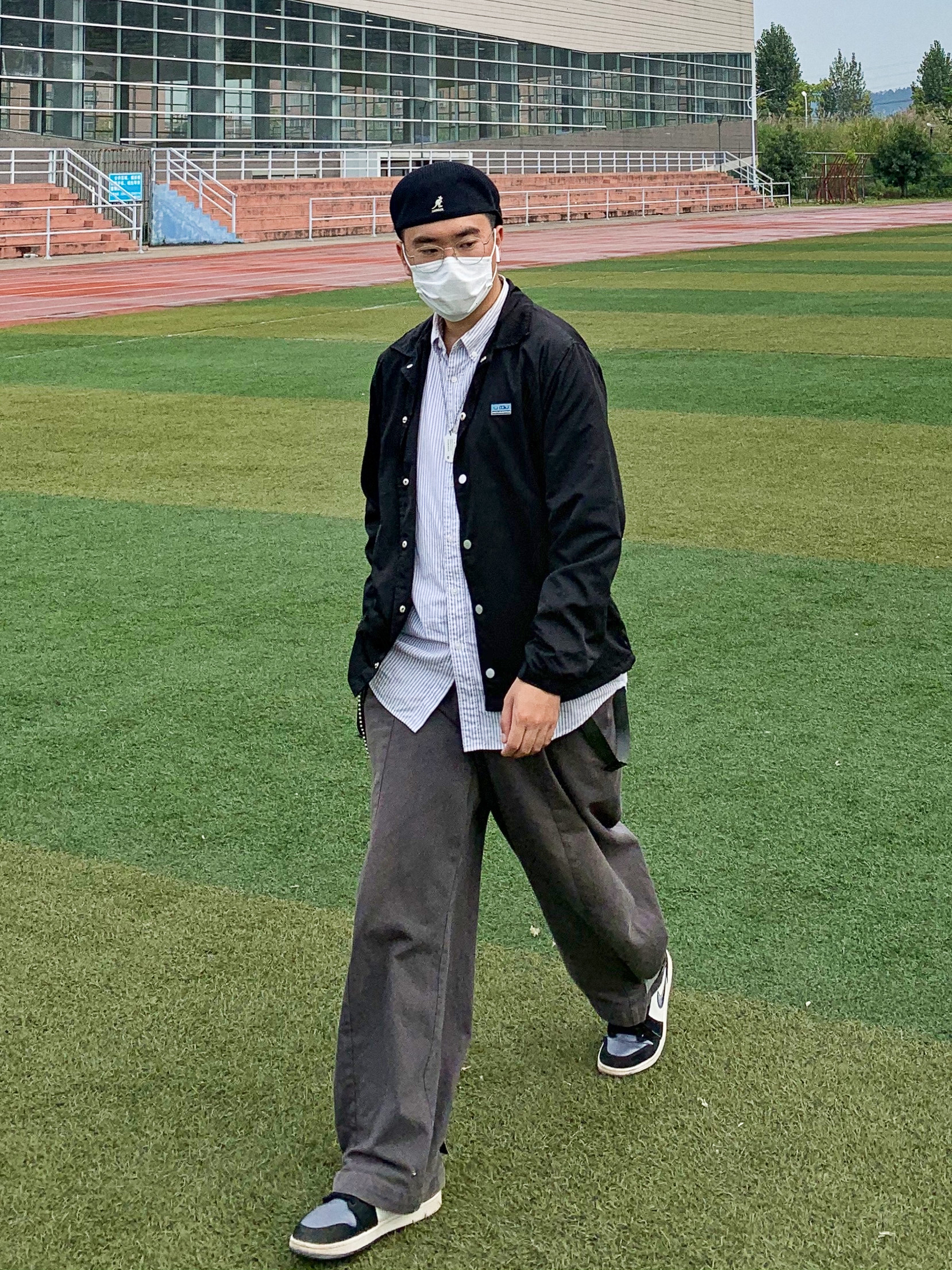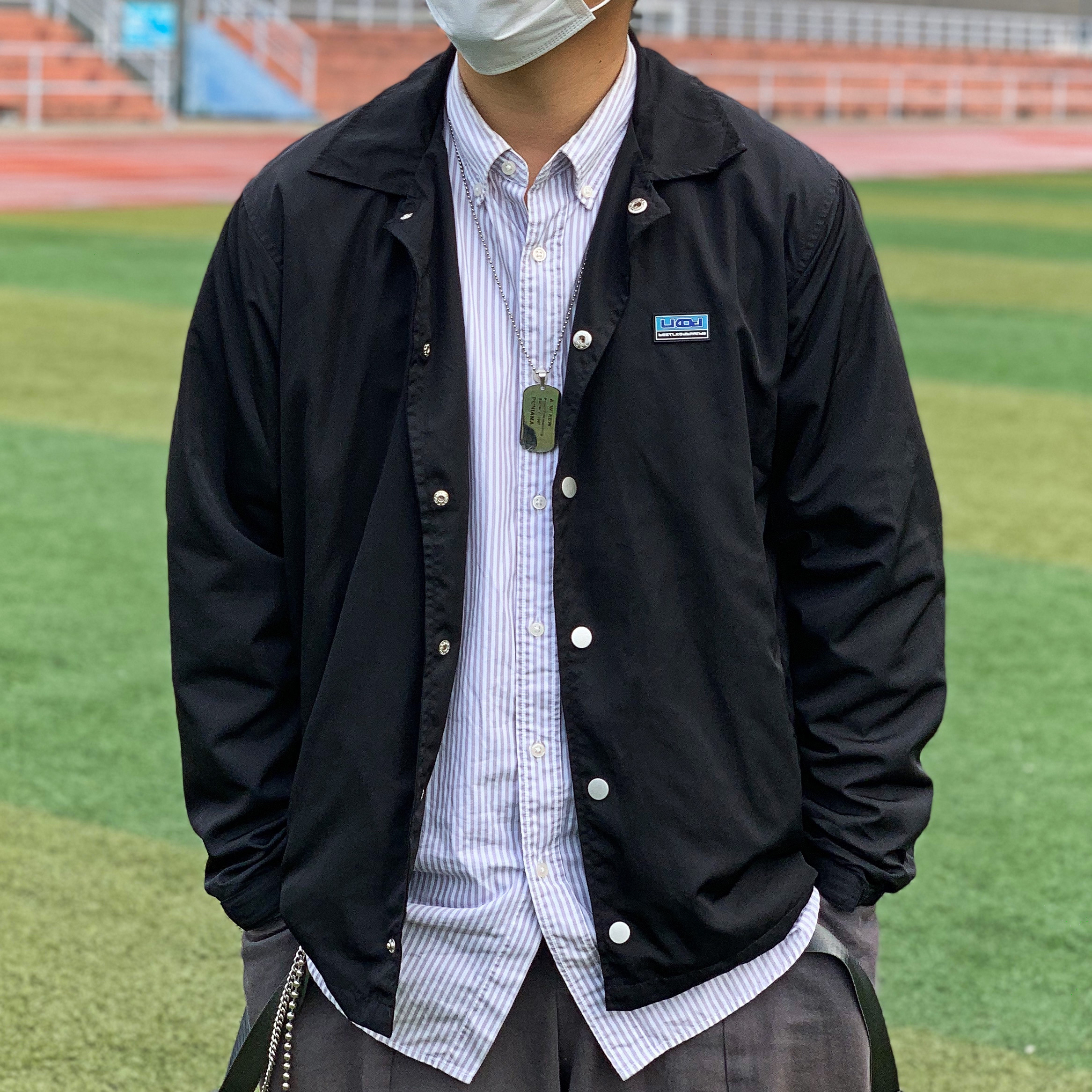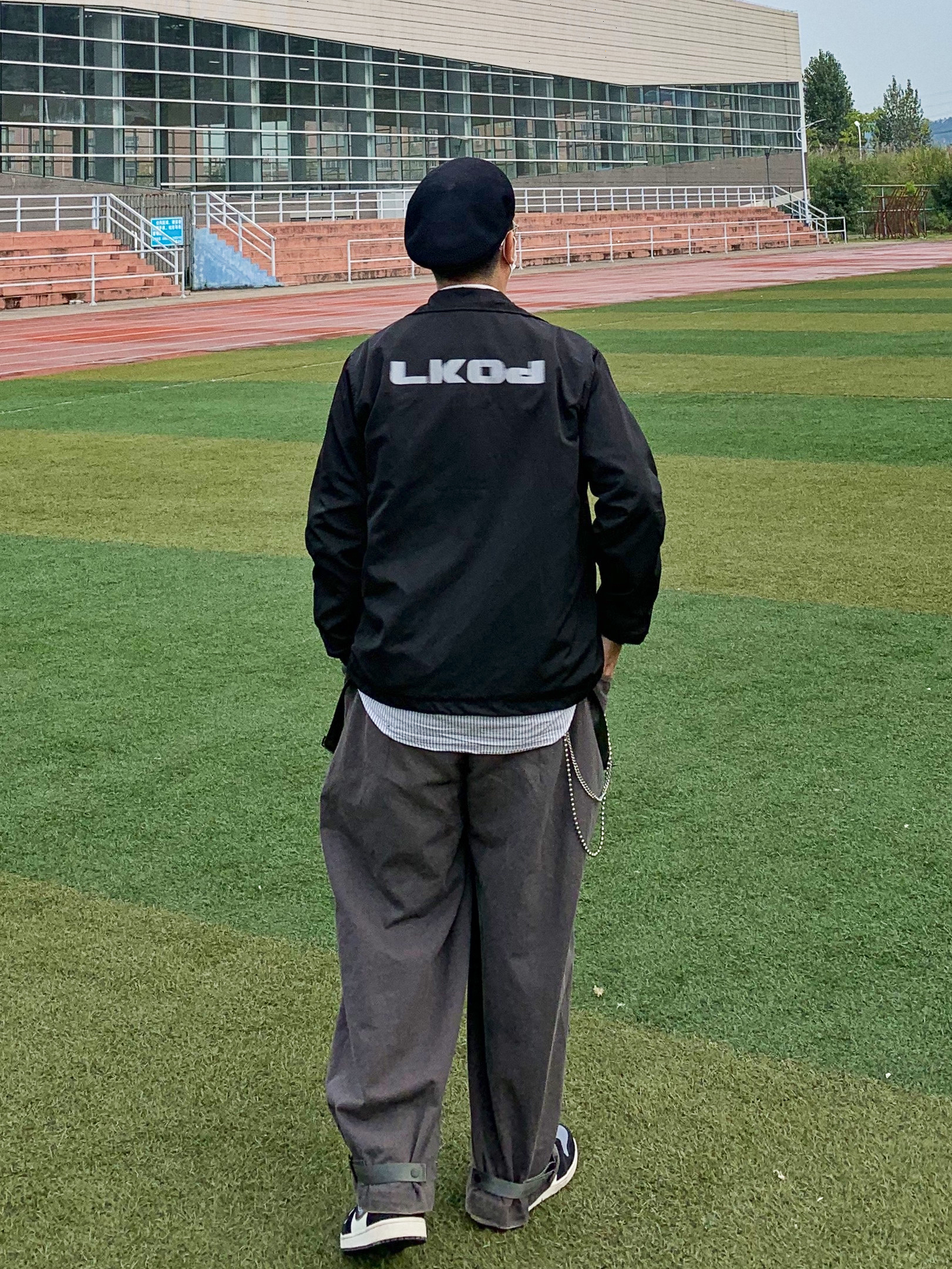 👔衣服:LK STORE 整体以这个教练夹克主体,整体搭配围绕着夹克进行,采用黑白搭配。背景是操场给人一种青春感 👖裤子:哭喊中心 下半身选择工装裤,在版型上来更好的呼应整体的搭配,让整体搭配更加完善。 👟鞋子:aj1灰丝绸 这双鞋的配色很好的协调了上半身的黑色配色。