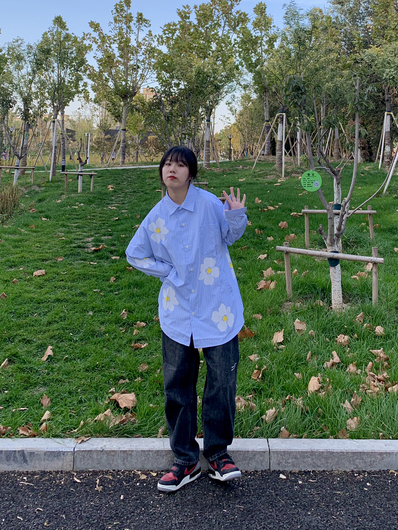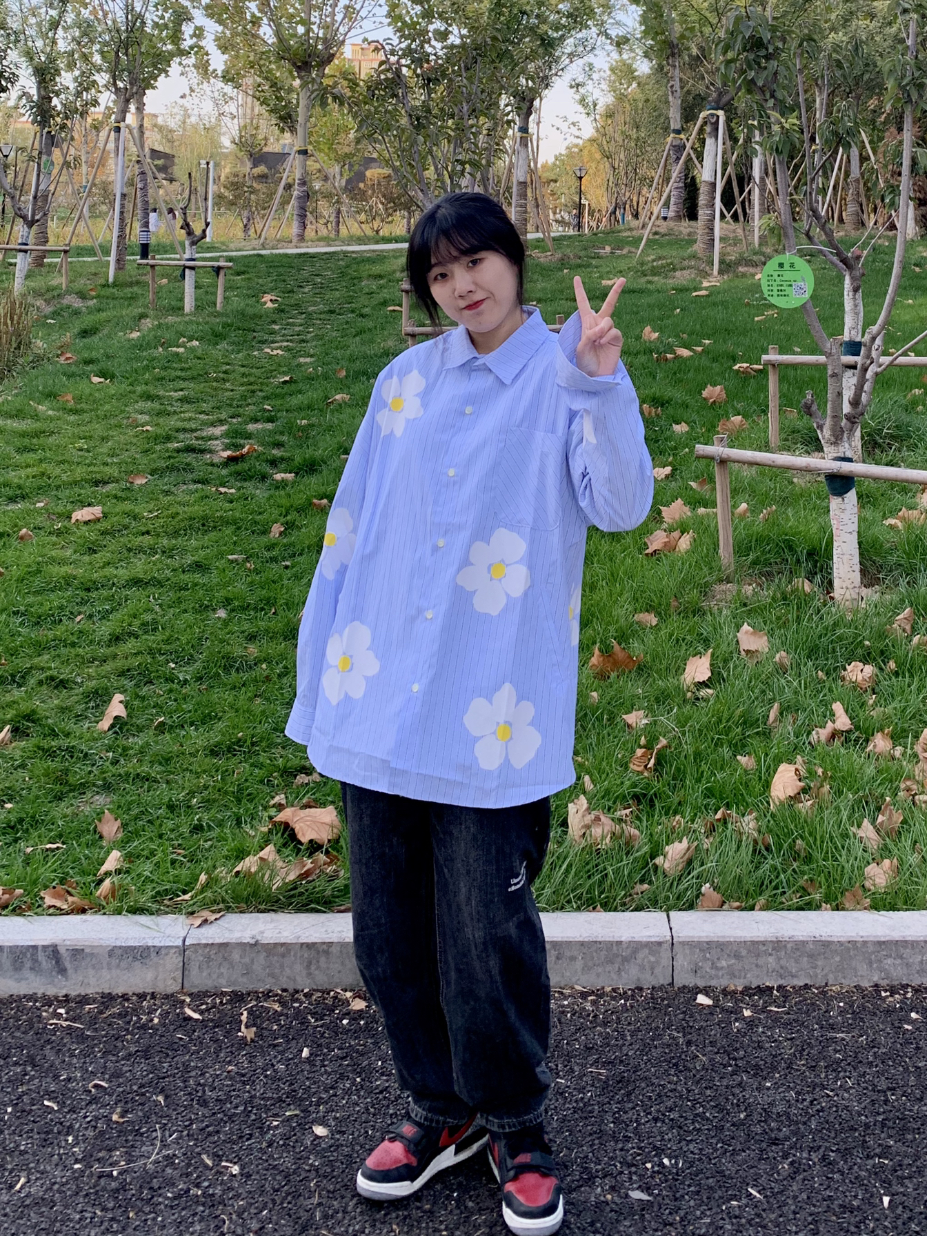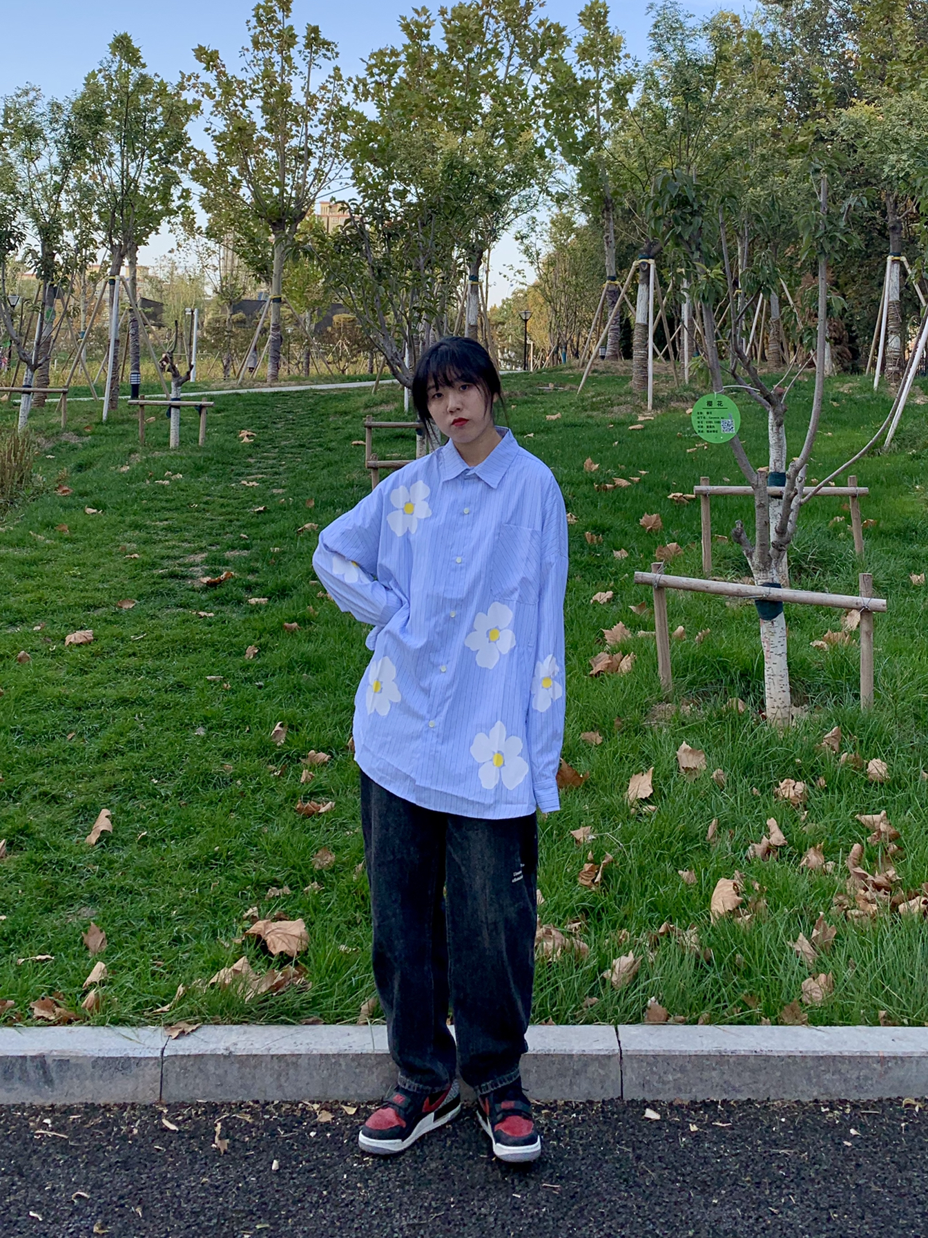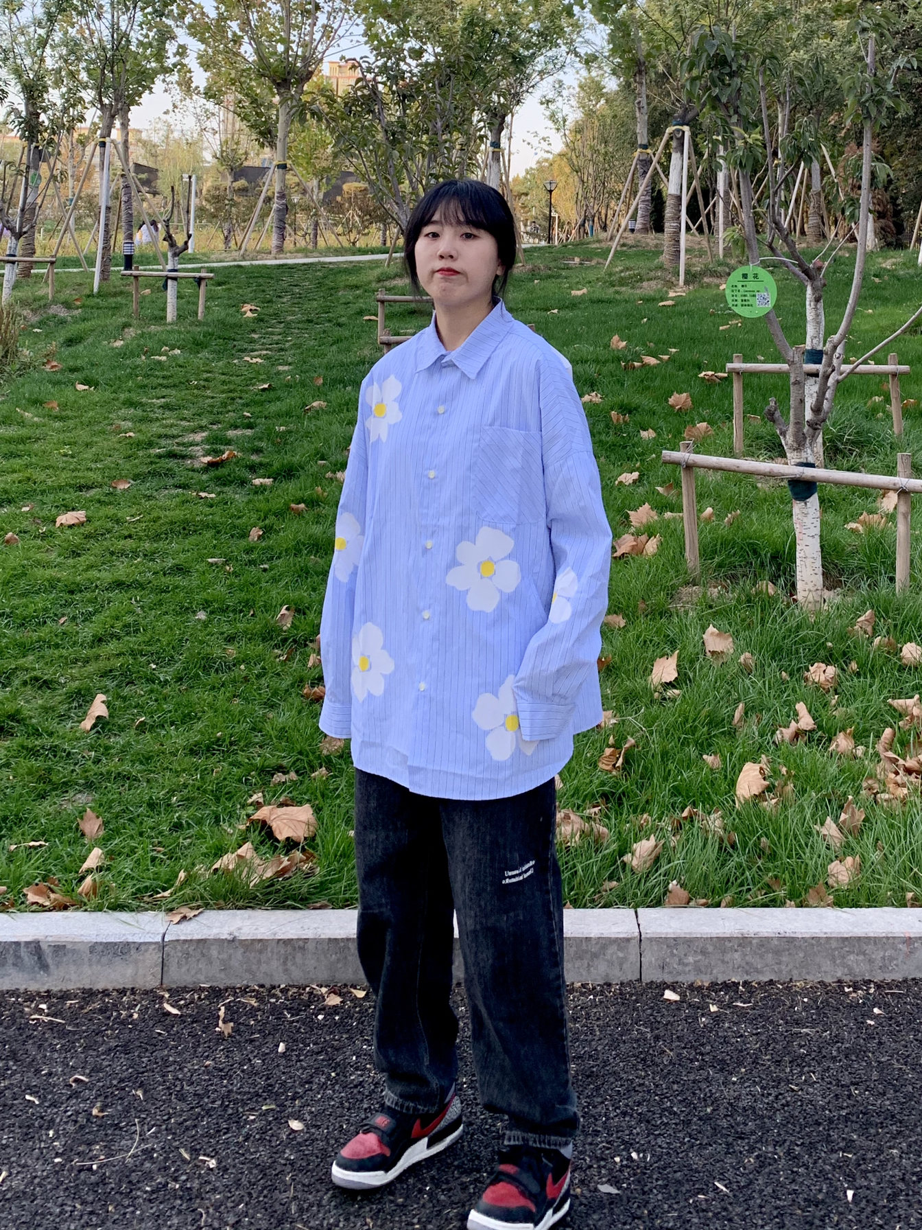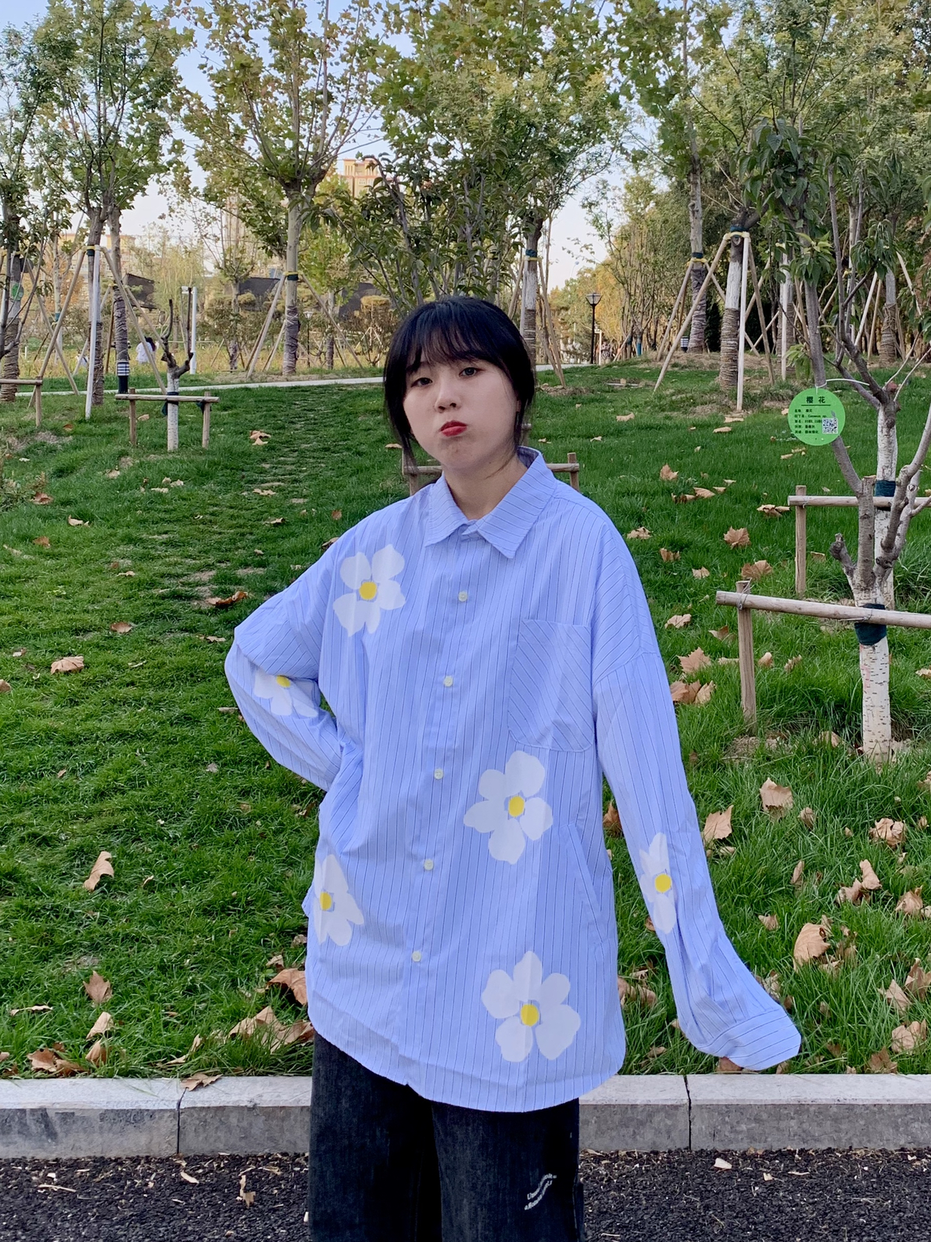 👔:PCLA线上商店 👖:费克赛文 PCLA原创潮牌秋冬双色小花长袖纯棉衬衫 蓝色条纹的巨清新。非常显白,加上上面的双色花花不会显得单调,os的版型可以做外套穿,像外套一样两边还有口袋非常贴心的设计。170买的s都非常宽松,作为参考 裤子版型奈斯 众所周知 蓝色的比较容易撞款 所以买了水洗灰 非常好看 又百搭