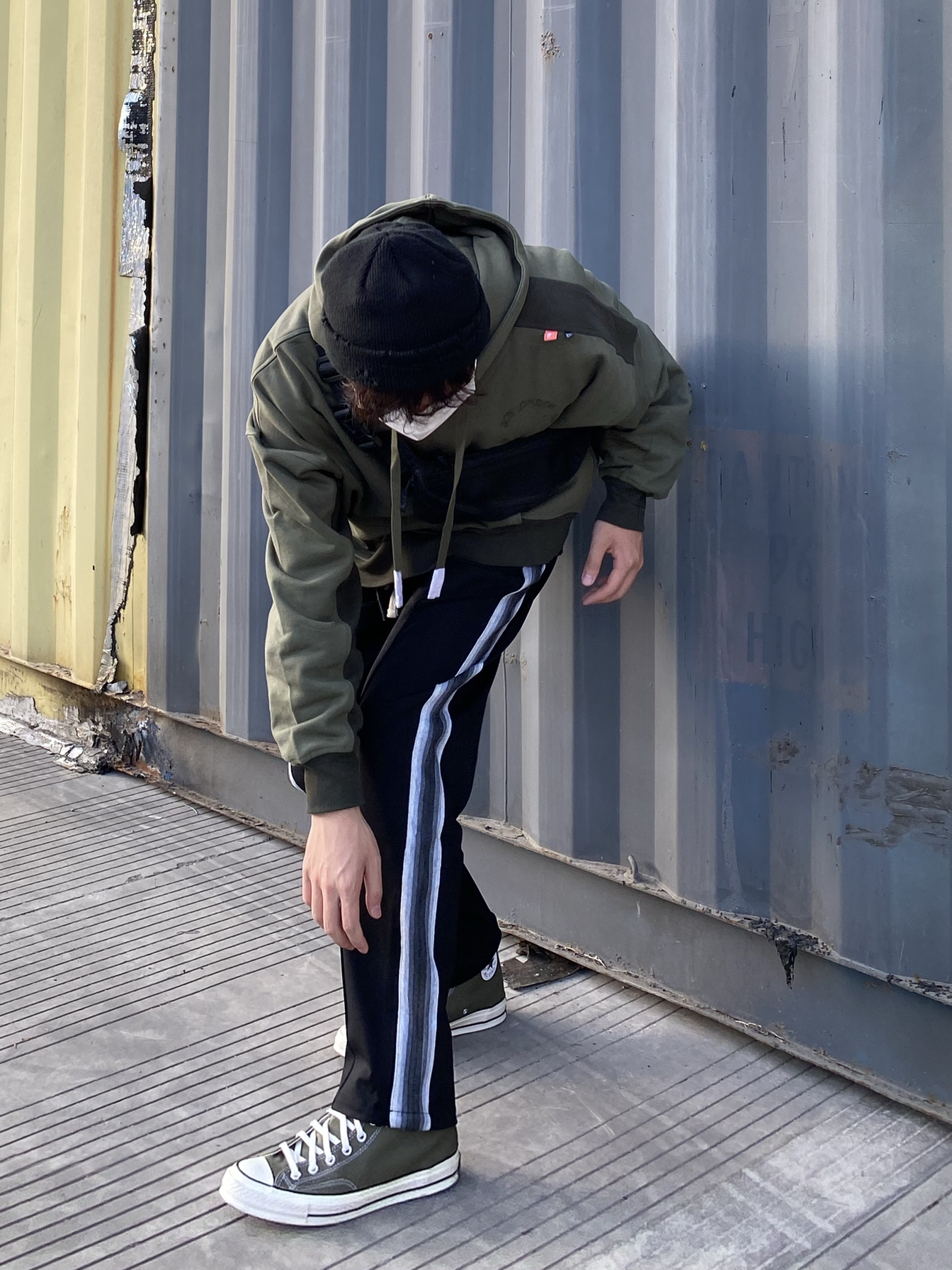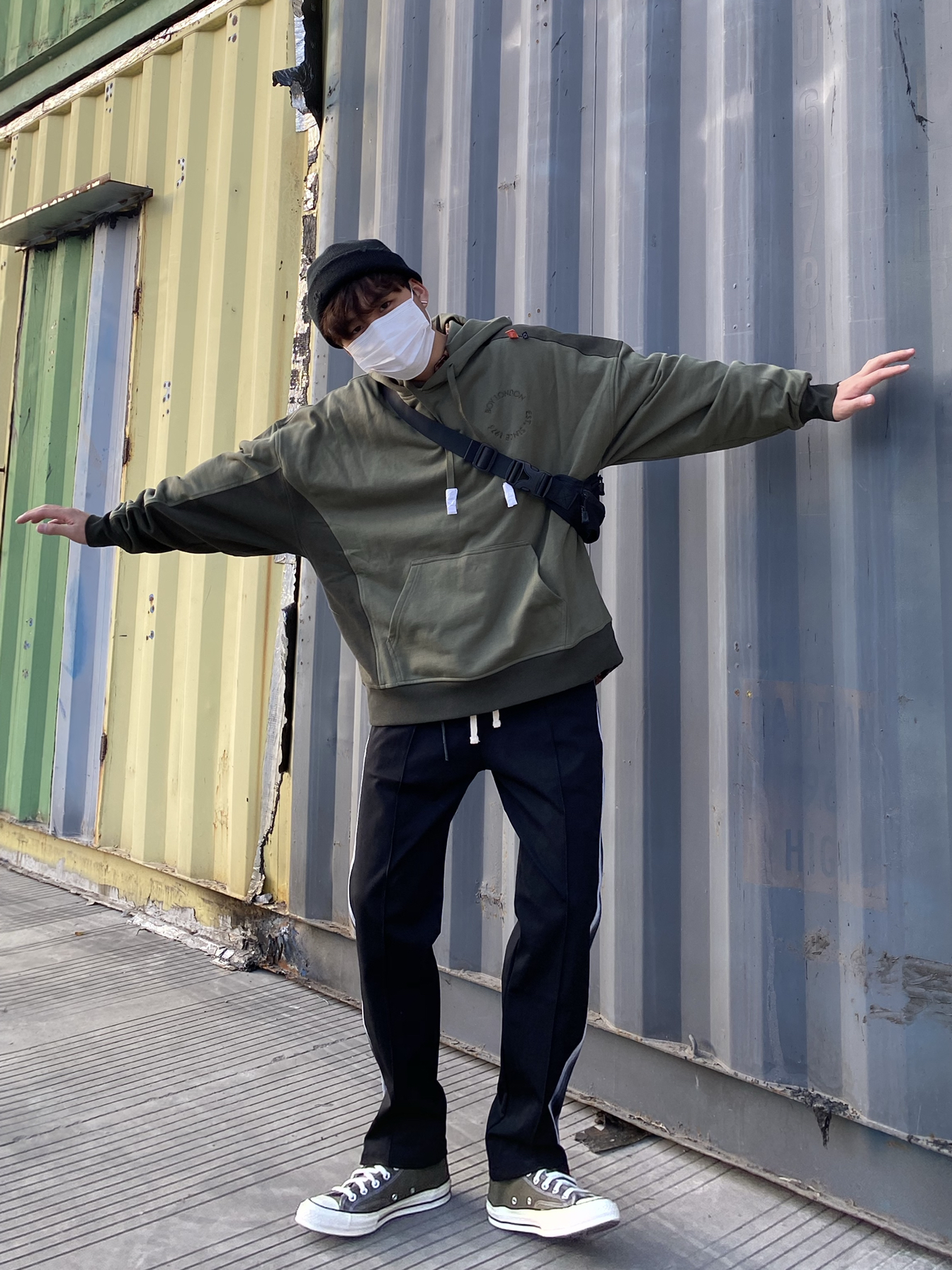 衣服:boylondon 裤子:RBP BRAND 鞋子:converse 背包:comback 帽子:champion 绿色是迷彩的基础色,上衣绿色真的显白,裤子修饰了身形,鞋子与衣服搭配衬托!
