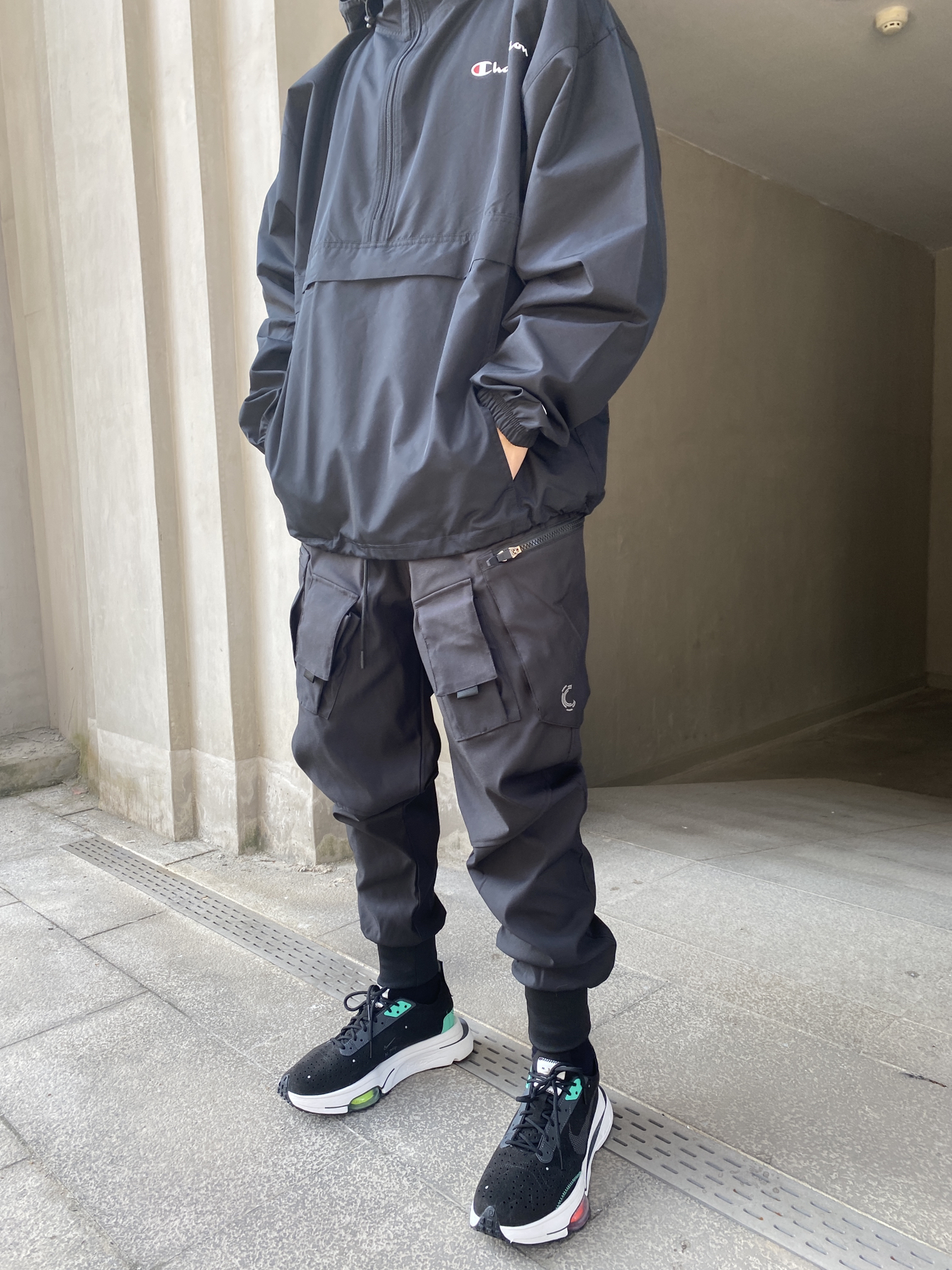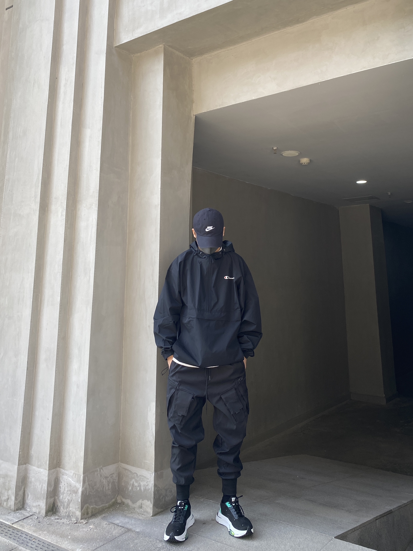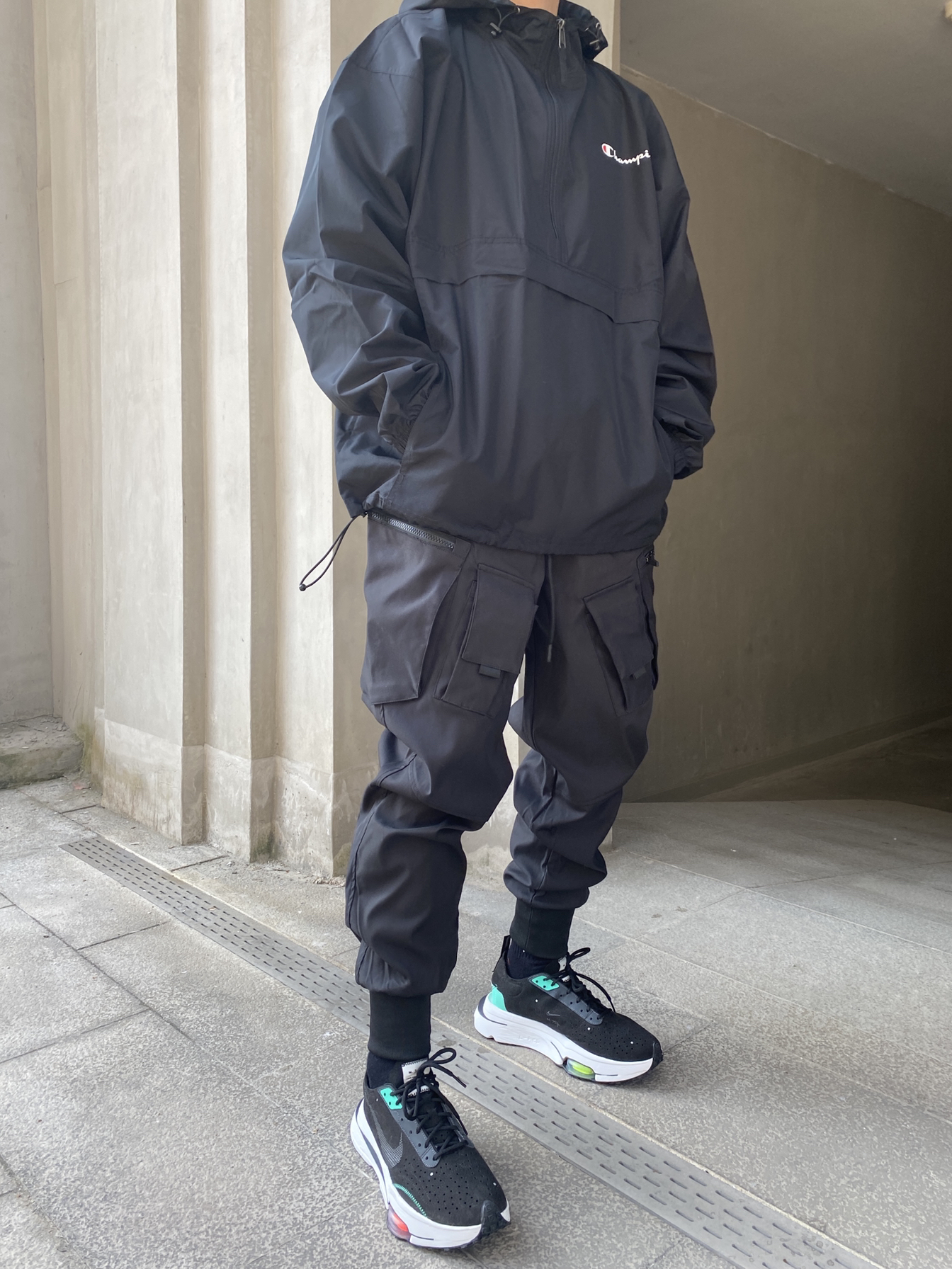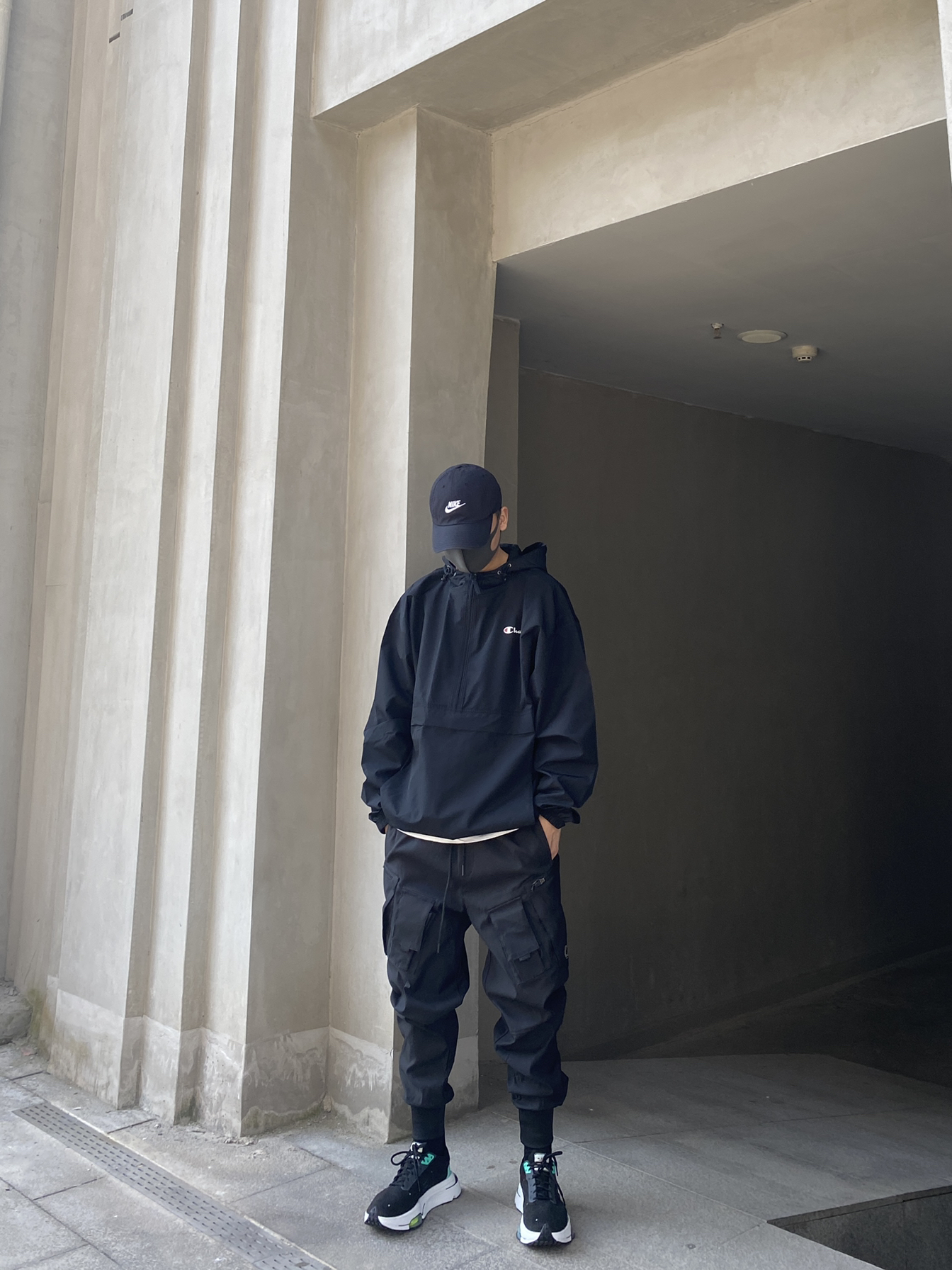 🧢:NIKE 👕:champion 👖:@CATSSTAC品牌 一身黑还是稳 冠军的这件冲锋衣还是很基础的 买大一码上身很宽松 面料很薄 属于春秋款 降温的兄弟们等一等吧 裤子依旧是cttc宝藏机能品牌 细节满满 面料特别适合天天下雨的地区 防水耐脏方便去污 版型也很适合我 上身超级显高!