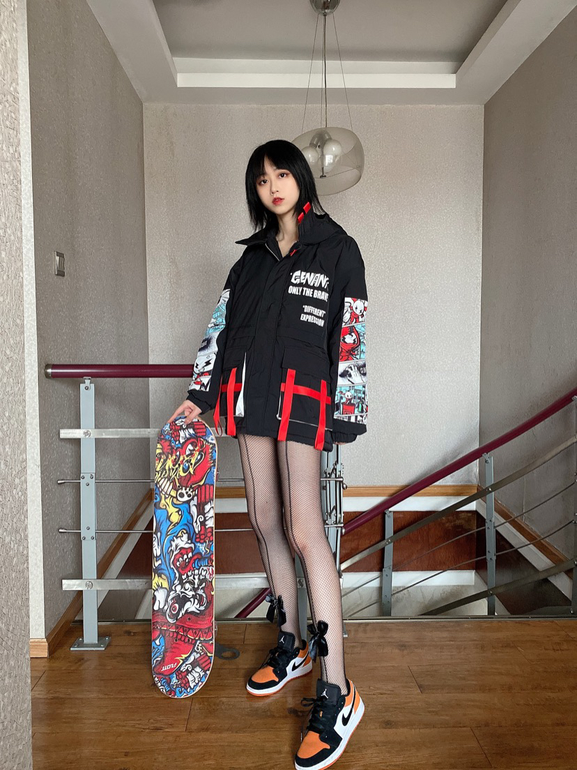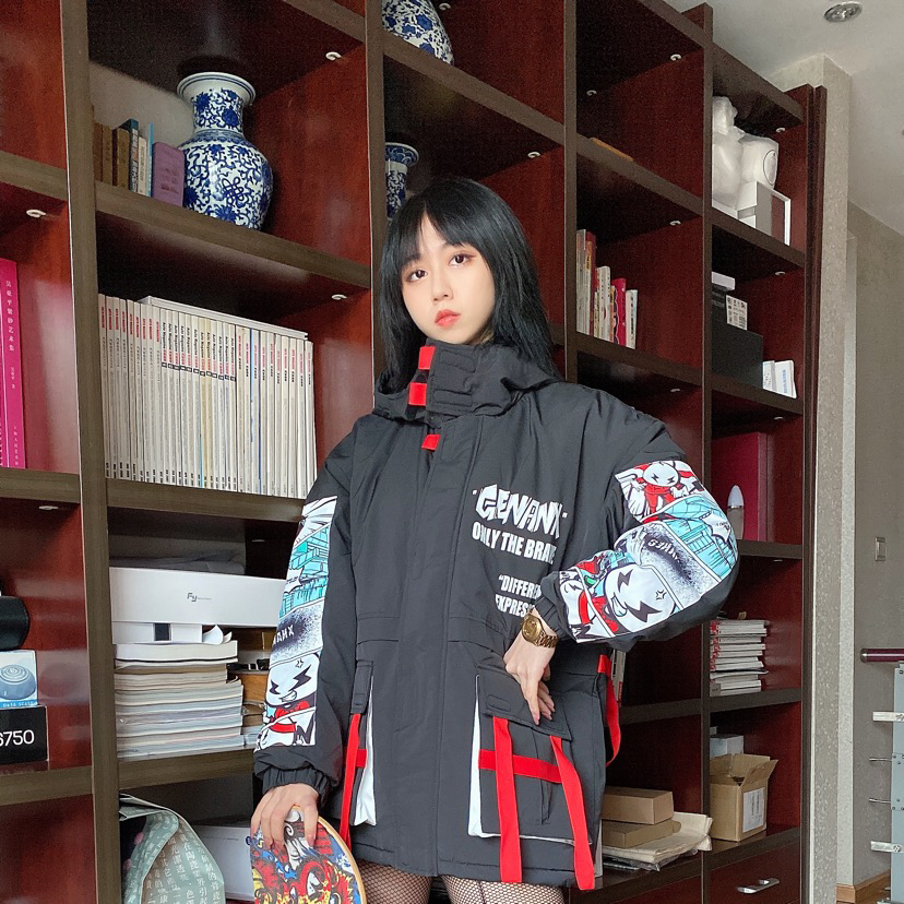 👔@GENANX_ 袖子上的涂鸦真的太可爱了 主色调黑红超级酷 口袋上的飘带是我最喜欢的地方 颜值和保暖担当!