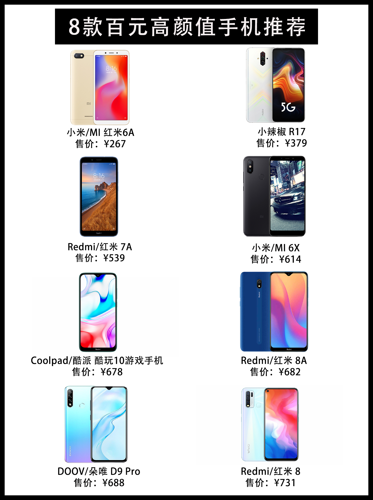 1、小米 红米6A 售价:267 特色:不到300元的入门级手机,性价比爆棚,还要什么自行车。 2、小辣椒 R17 售价:379 特色:仅10.3cm高,4.5cm宽,非常迷你的机身。 3、小米 6X 售价:614 特色:18年高性价比机型,同价位下相机非常出色,整体性能到位,屏幕403ppi相对细腻,唯一的缺点是电池仅有3000毫安。 4、Coolpad/酷派 酷玩10游戏手机 售价:67...