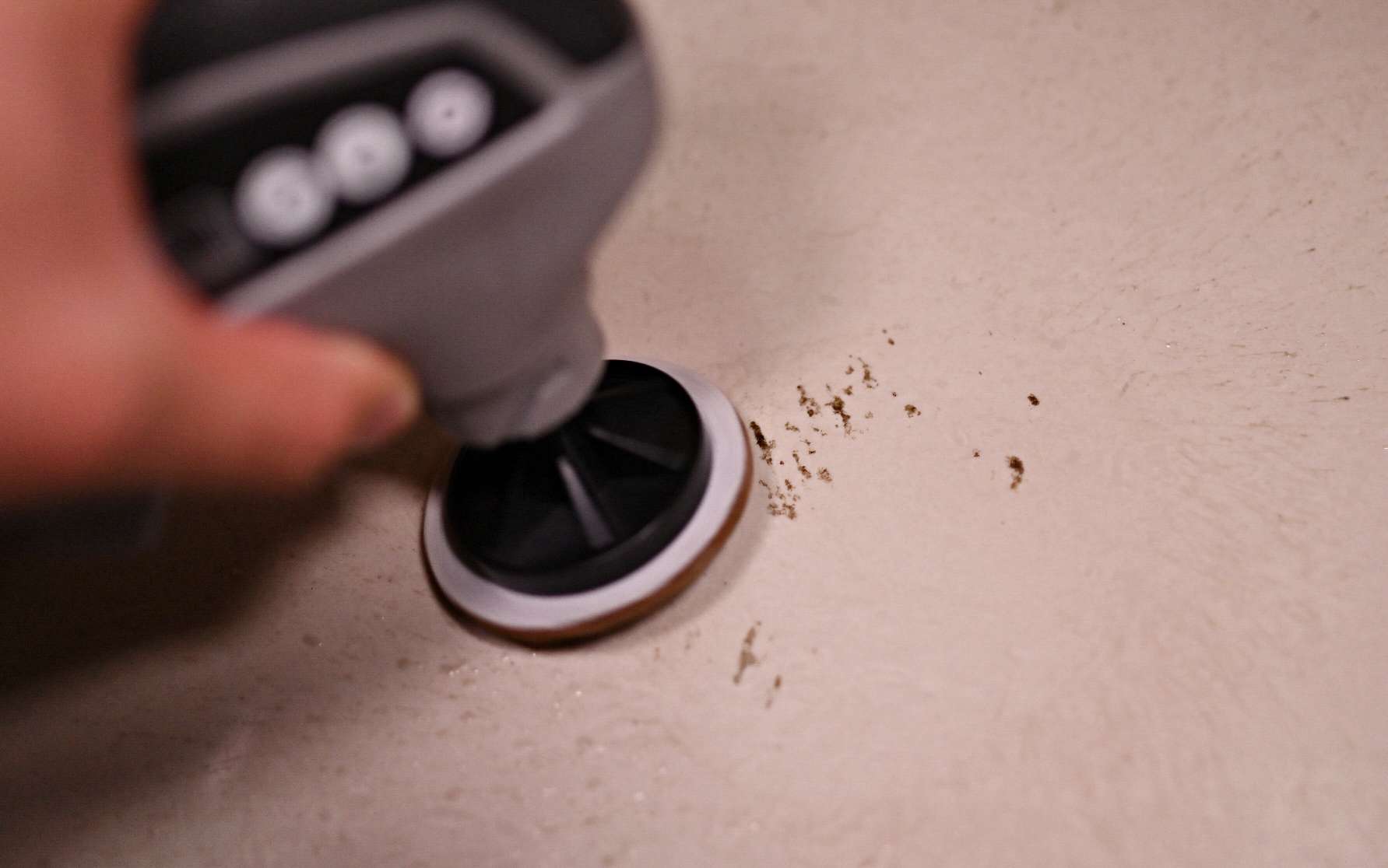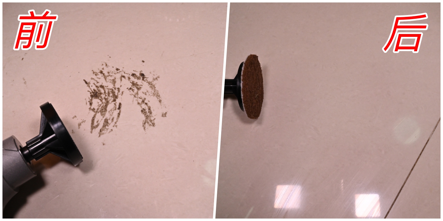 瓷砖清洁的效果出乎意料的好啊!大概一分钟,就清洁完毕了(两眼泪汪汪,过去都拖的什么地),不是自己不够勤快,是劳动工具不对啊。转速2200,当然比手动要有效率。果然应了那句话,科技才是第一生产力。可以从对比图看到前后的清洁对比,左边那不知名的黑色污块已经被完全清理干净了,瓷砖干净得都反光。机器大小合适,我刚好一手可以掌握(手比较大)。