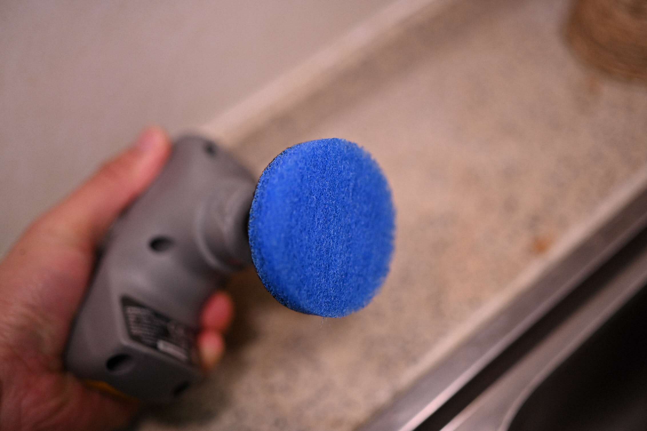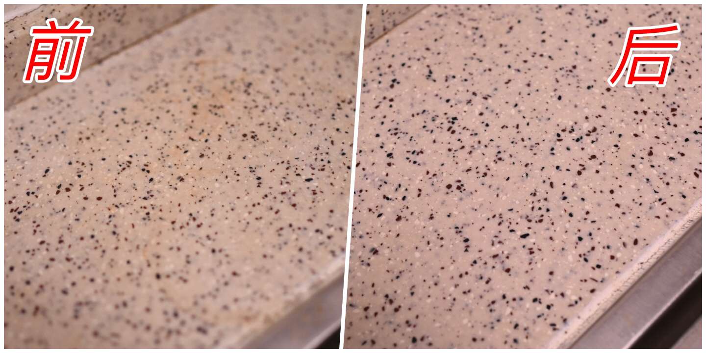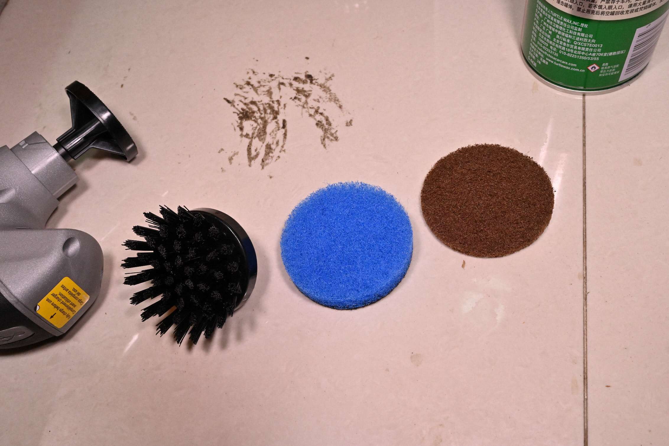 磨了一会,以为有效果,但抹干之后发现没啥效果。看来蓝色刷头还是嫩了点,换上更硬的棕色刷头吧。于是一顿操作,发现效果立竿见影啊!但,有点用力过头了,粉都被我磨出来了(WARNING:最强力擦片,主要用于金属去除烤焦食物或油污,所以慎用啊)...于是赶紧收工,用抹布擦拭干净。一个全新的灶台回来了(请看上面对比图)!