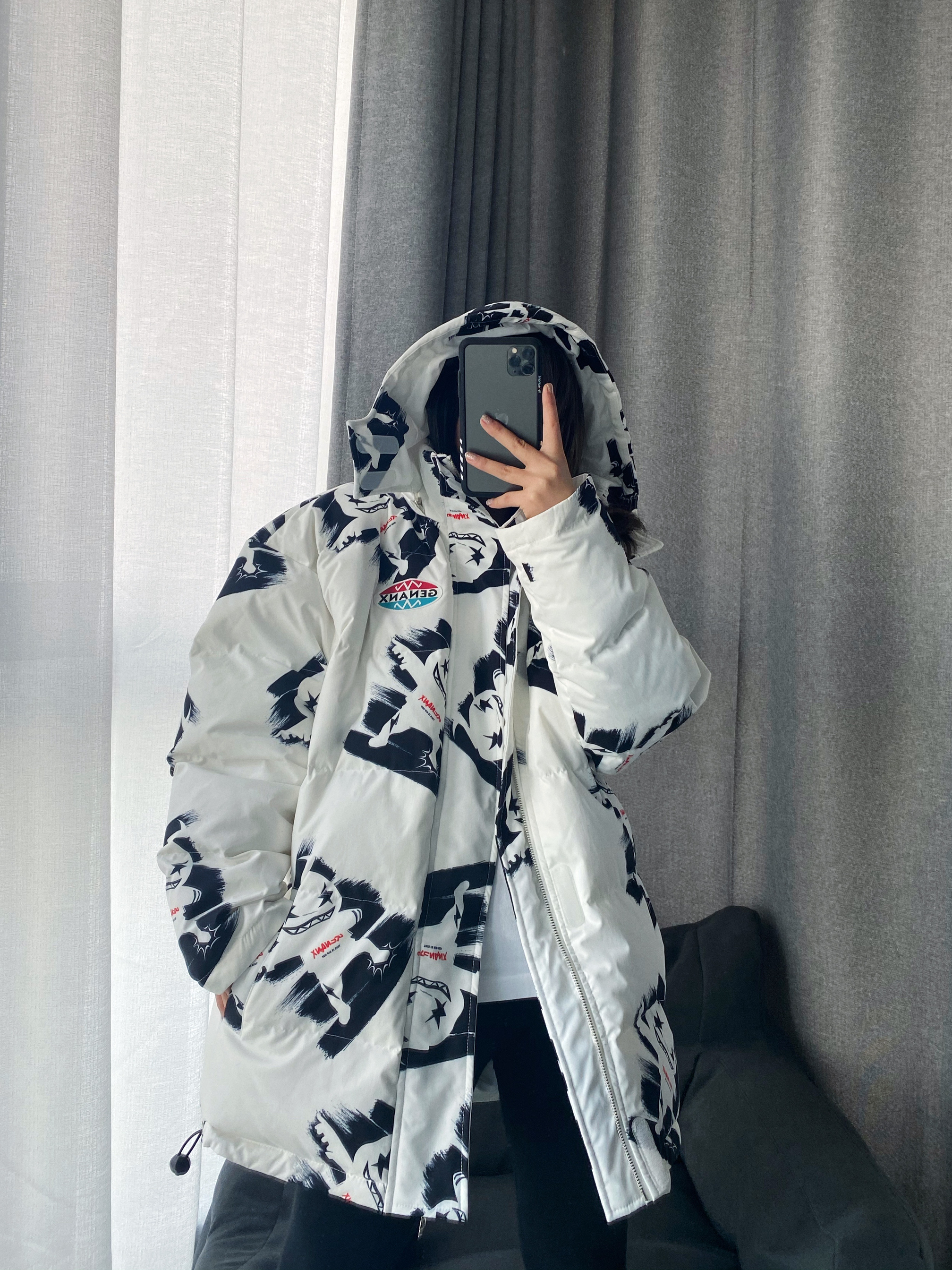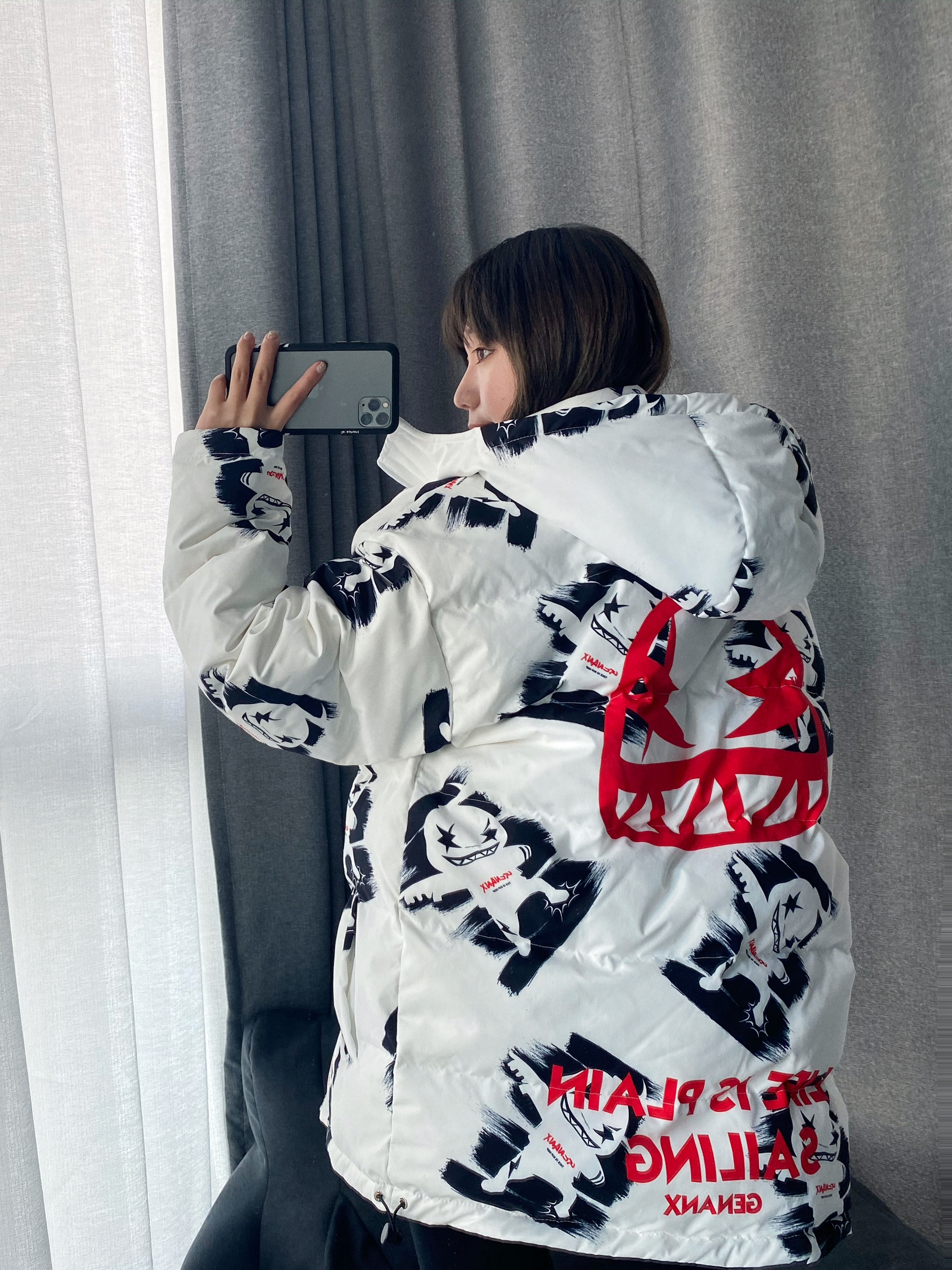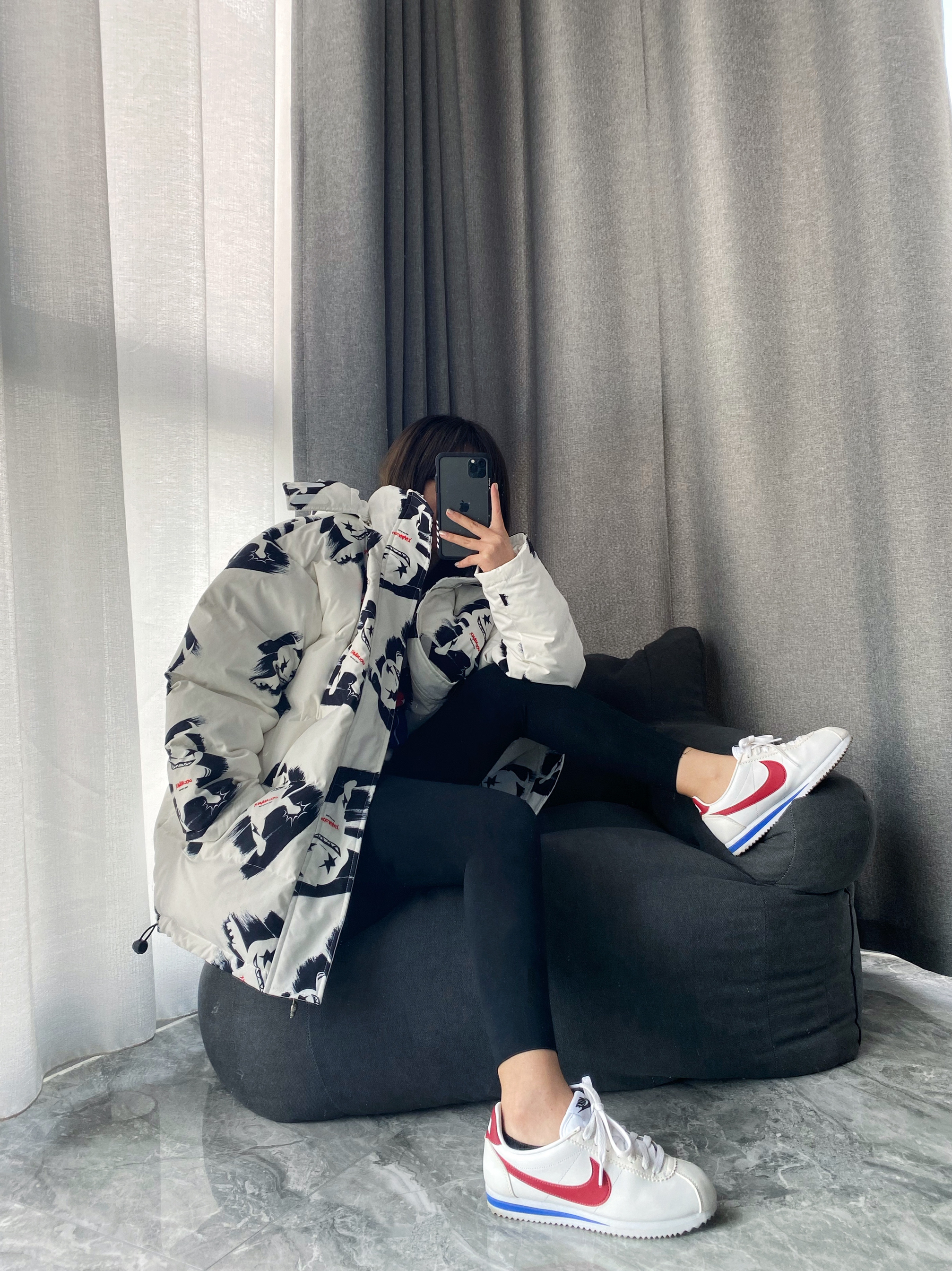 羽绒服:genanx 鞋子:Nike 阿甘 天冷真的要靠羽绒服过活,这件就很厚很暖!白色底色 加上黑红色满印印花 个性张扬!裤子就可以配得简单一些,找双有红白元素的阿甘鞋配着很🉑️。
