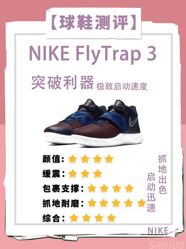 不知不觉,欧文的支线球鞋已经出到第三代了,前两代在后卫球鞋的竞争中都有着不错的竞争力,那就让我们来看看Nike Kyrie Flytrap 3的表现吧! 外观:与前两代较为相似的外形设计,不过三代多了一条魔术贴,颜值与前两代相近;(评分:⭐⭐⭐⭐) 耐磨与抓地力:弧形外底融入纹路图案,从一侧到另一侧包裹中底,铸造强劲抓地力,助力流畅转换步伐。XDR大底版本助你在水泥地上奋力飞驰;(评分:⭐⭐⭐...