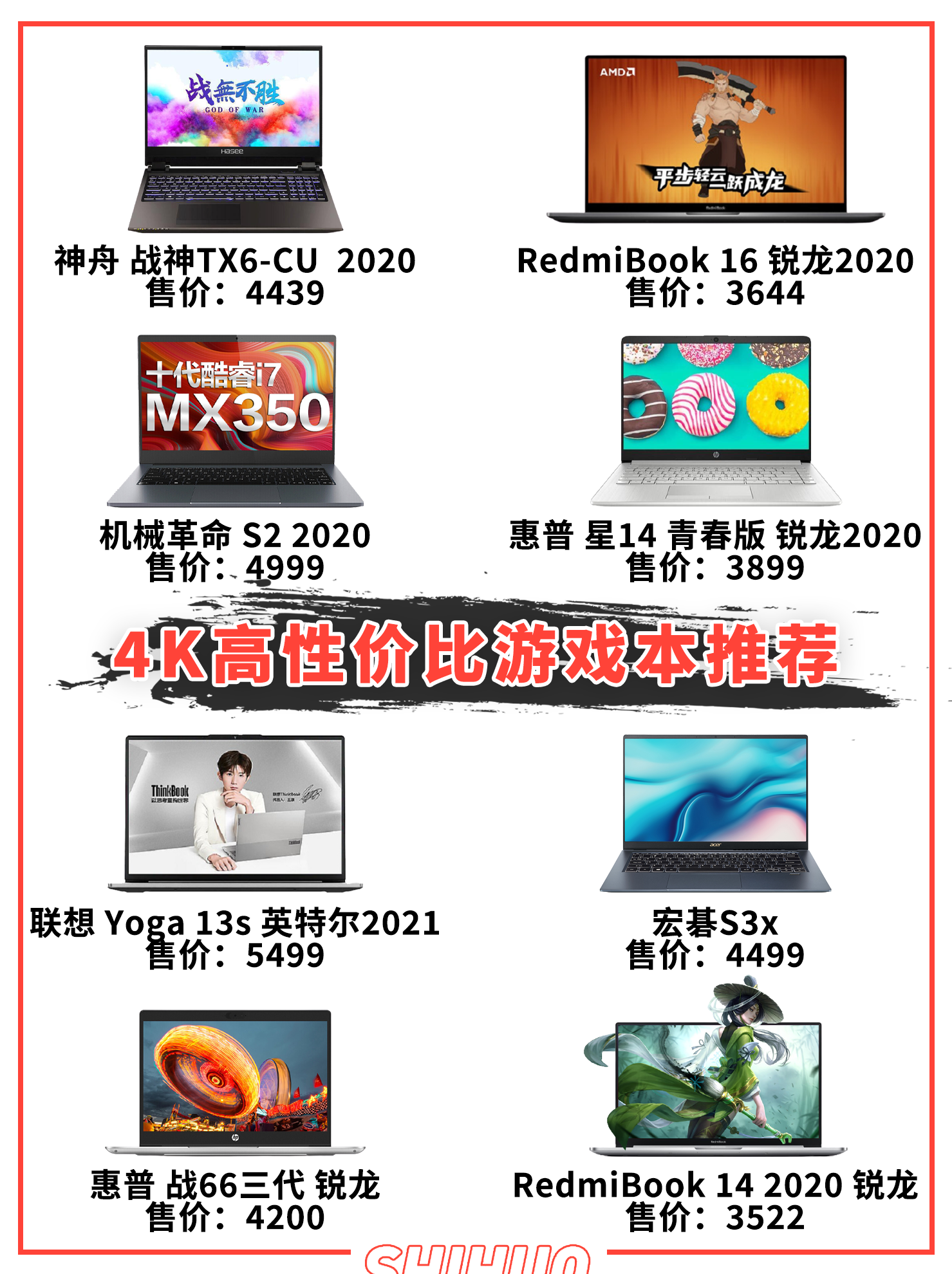 1、神舟 战神TX6-CU 2020款 16.1英寸游戏本 定位:性价比屠夫+1 特色:相比ZX6,采用高色域屏但屏幕刷新率为60Hz,屏幕稍大,相对ZX6,各有优劣,当然性能依旧强劲。 2、红米 RedmiBook 16 锐龙版 2020款 16.1英寸笔记本 定位:高性价比大屏入门级机器 特色:基本配置强大,整体采用金属外壳设计,内存使用了2666频率,硬盘采用sata硬盘,性价比...