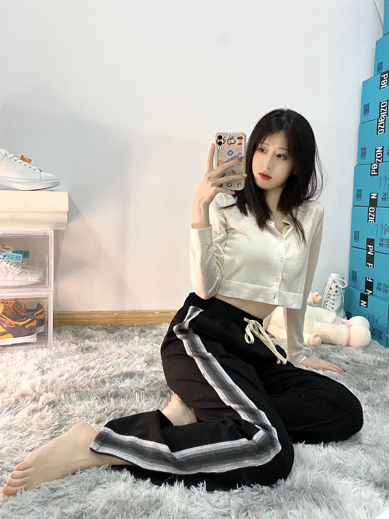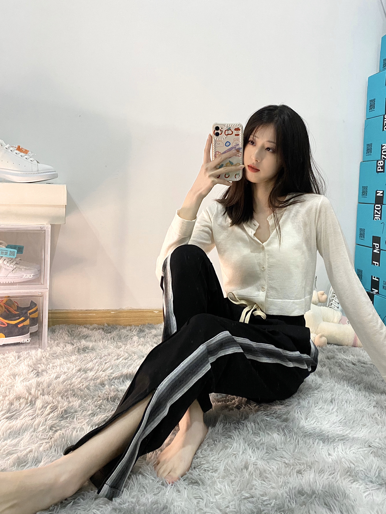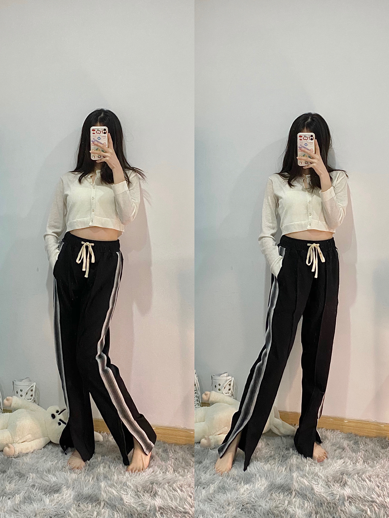 👔:romance of girl白色开衫 👖:rpb brand黑白侧边织带拉链运动条纹长裤 裤子两侧针织侧袋采用水墨做旧工艺 黑白灰三色结合在一-起 面料很好有垂感重量感 比较宽松里面可以加秋裤. 裤子中间还有一条中线 裤脚是拉链设计非常方便 穿低帮鞋的时候拉上 穿球鞋/高帮鞋就可以拉开 很显腿长