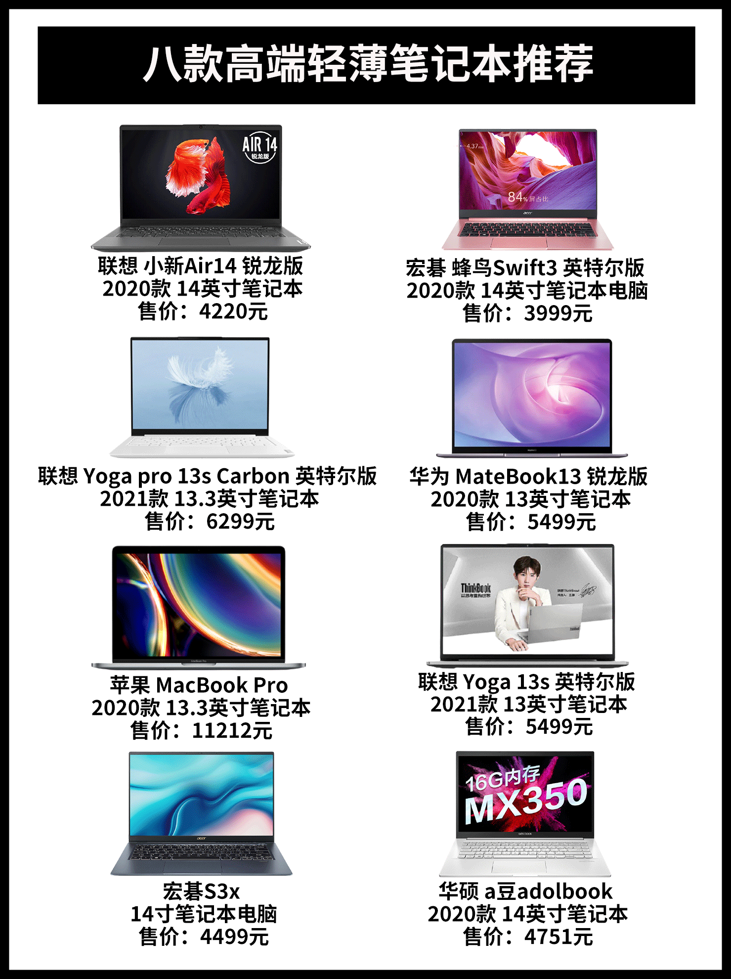 1、联想 小新Air14 锐龙版 2020款 14英寸笔记本 定位:轻薄移动轻度游戏使用 特色:磨砂金属A面,整体圆润处理没有任何割手感,可单手开合,R5-4600U极高的性能,搭配三星PM981A高端固态,3200hz内存,可支撑高强度办公使用,以及轻度游戏使用,性价比极高 2、宏碁 蜂鸟Swift3 英特尔版 2020款 14英寸笔记本电脑" 定位:兼顾轻薄与游戏 特色:镁合金机身,...
