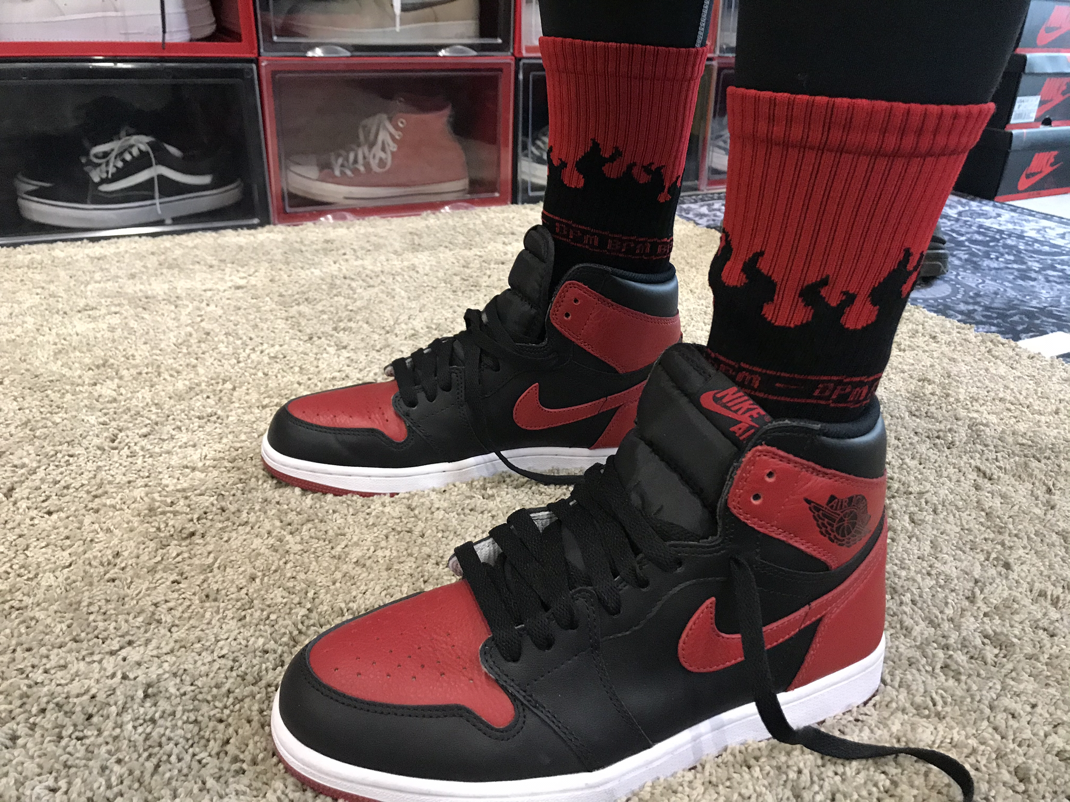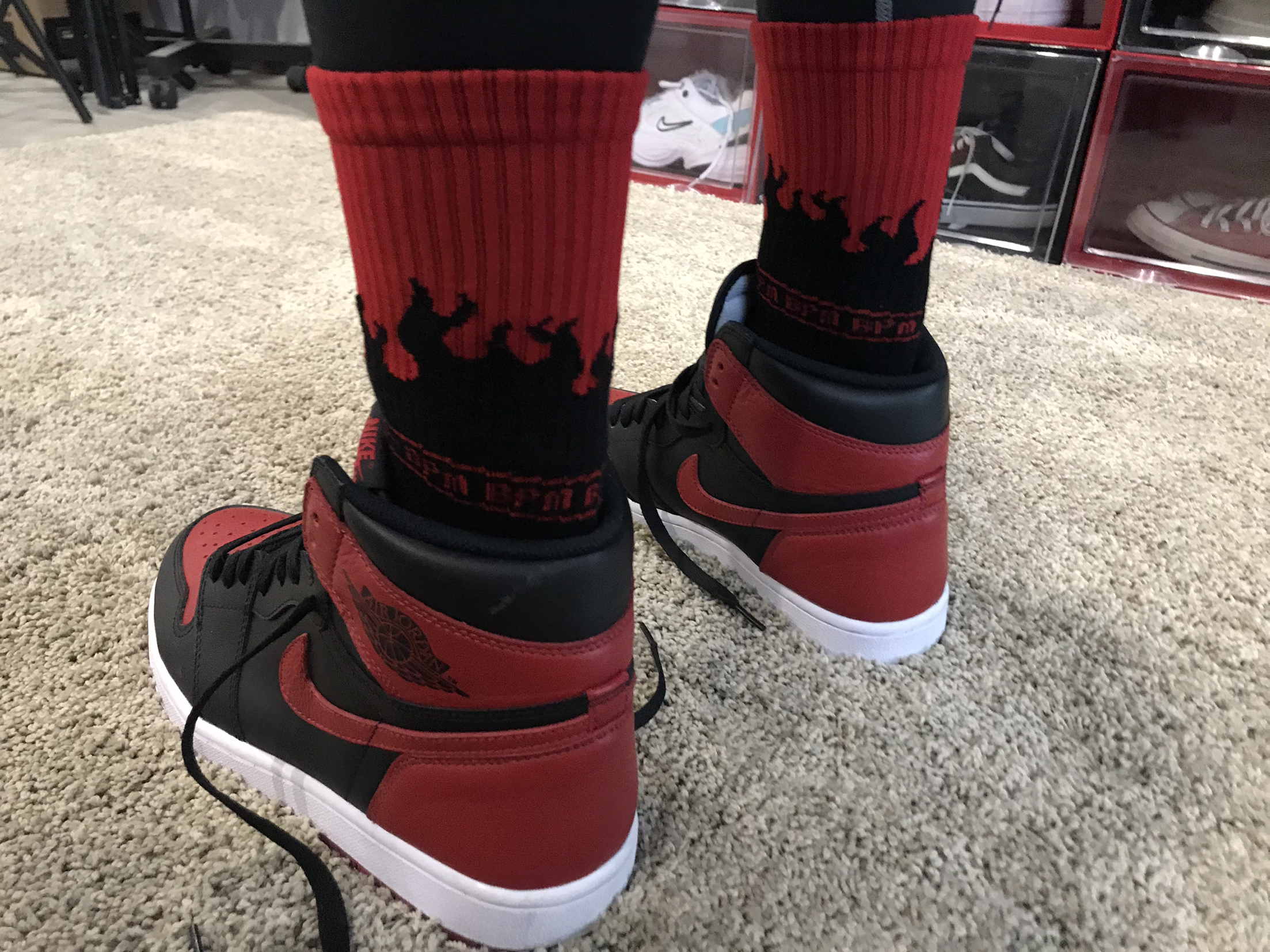 袜子🧦:BPM绝配家 袜子上的图案运用了当下很火的火焰🔥元素,通过设计师的设计,在袜子上添加细节,上面的图案形成整体,不会单调。 鞋子👟:AJ 1黑红禁穿 以“Bred"命名的黑红相间鞋身,整个鞋身都由皮质构造,鞋头为荔枝皮鞋舌是白色的布很厚实,在鞋子内侧有编号,鞋侧logo以红色点缀非常的显眼,不仅成就 了禁穿风波的反转人气,更开启了一段Air Jordan专属配色的经典传奇,连远在大洋彼岸神...
