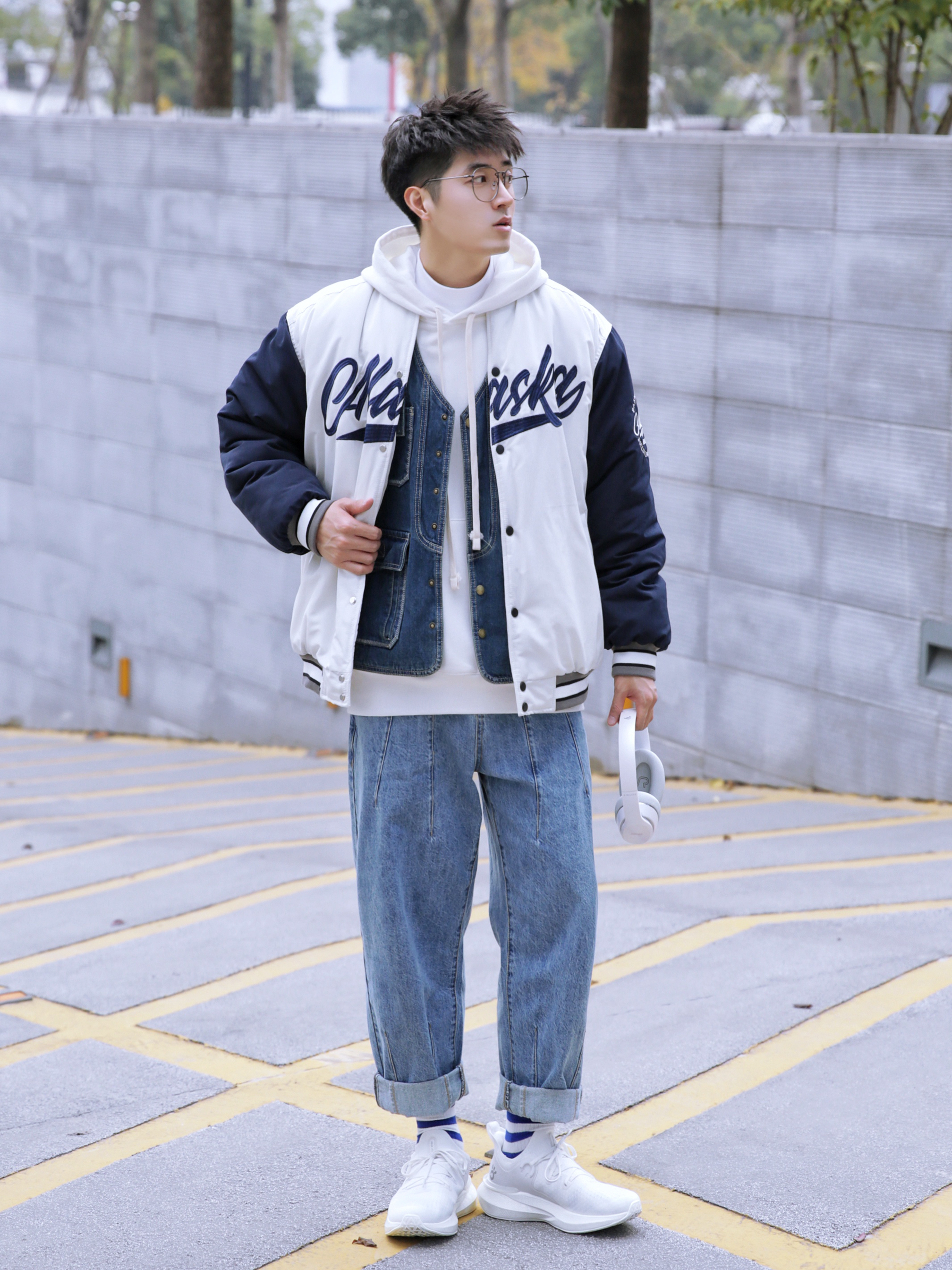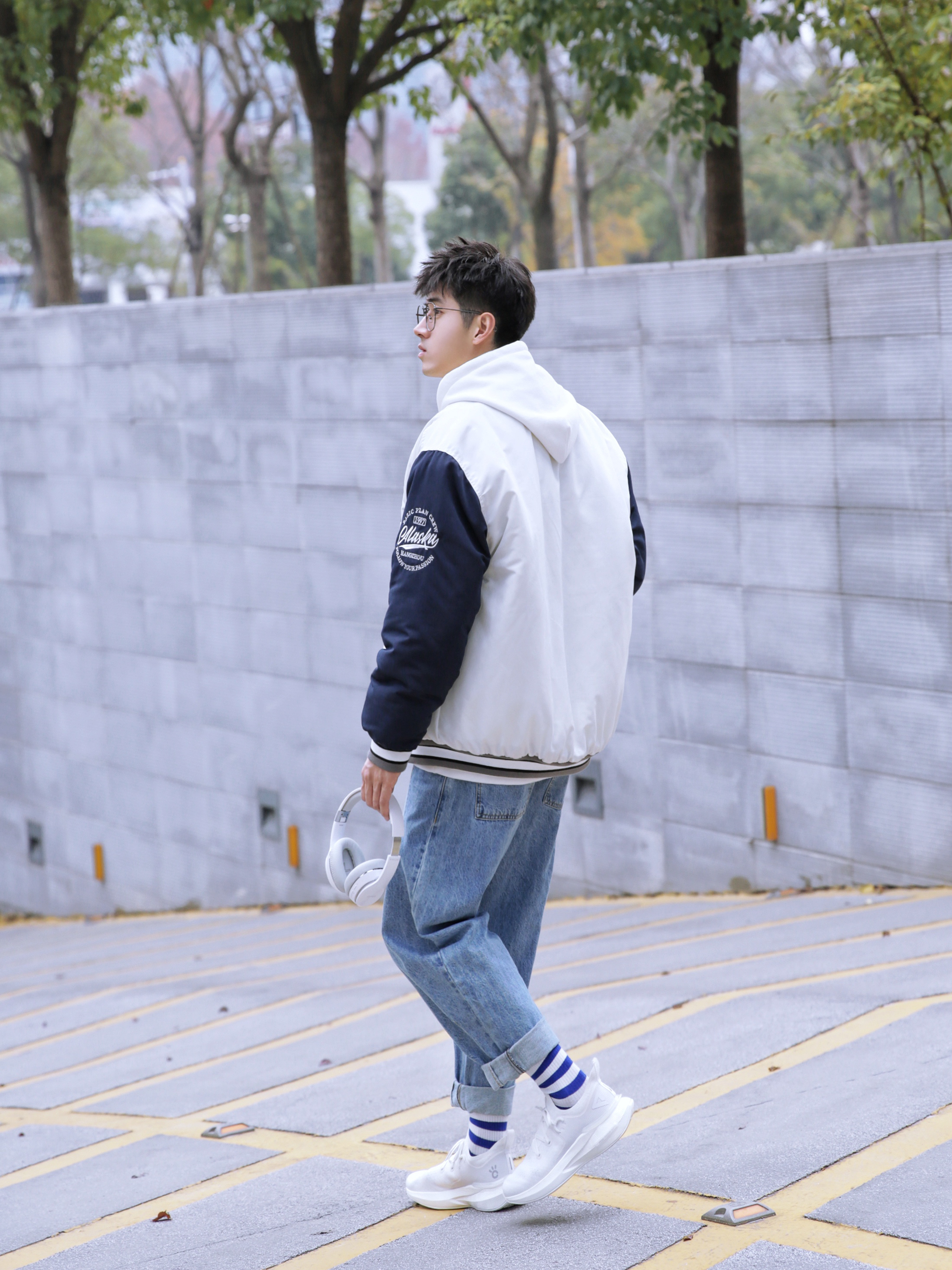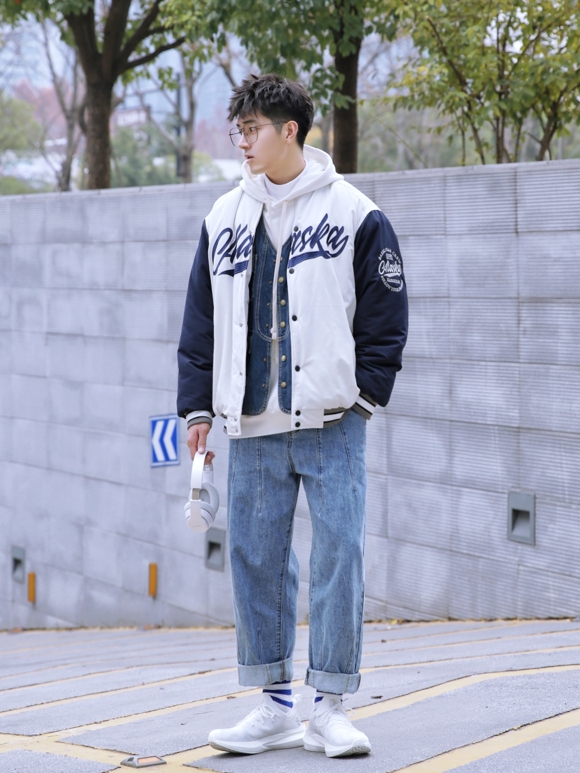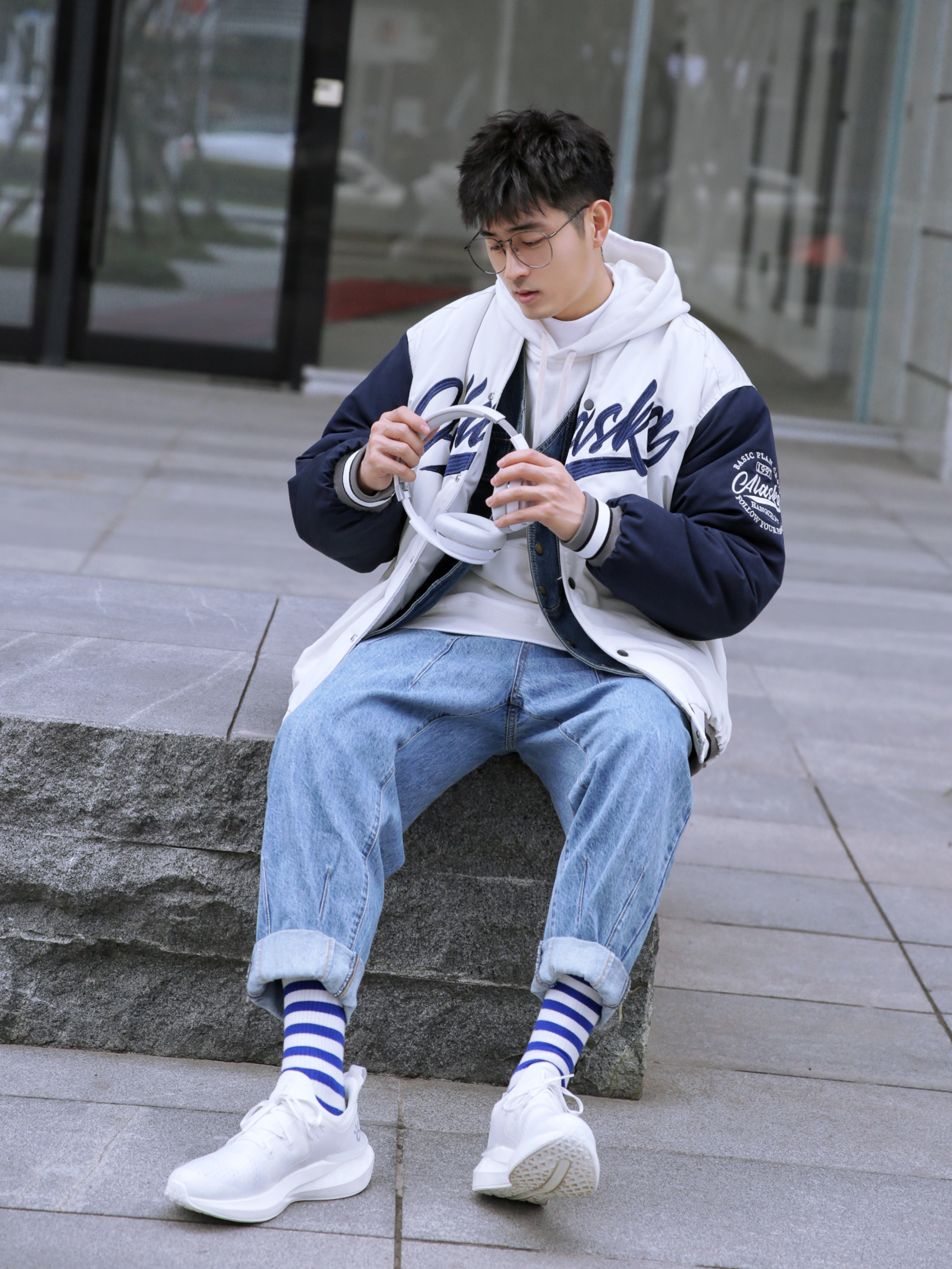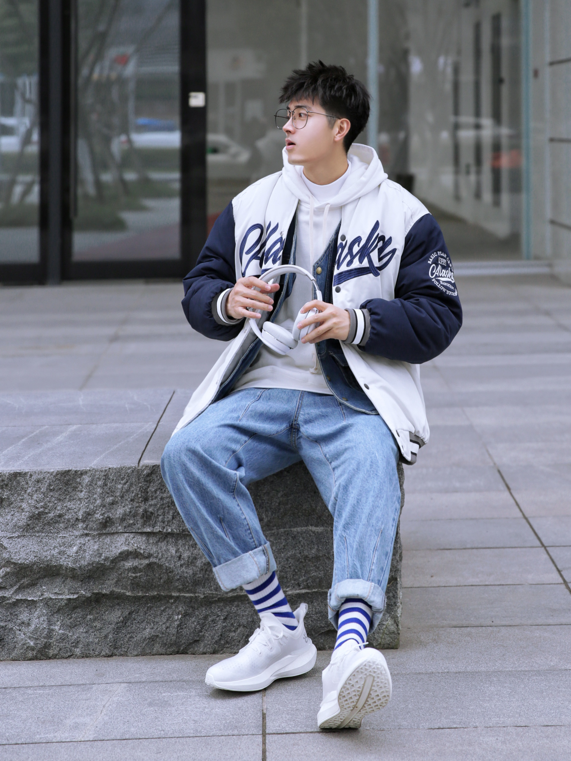 🔹近期,真的很喜欢棒球服单品,所以今天再来分享一套棒球棉服男友风校园搭配。 — ⚠️本人身高|体重:176CM|66KG(🉑️参考) — ·👔·外套·棒球棉服—PD大人; ·👕·内搭·马甲卫衣叠穿—PHOTODIARY; ·🎧·耳机·白色头戴式耳机—IAMARCHI; ·👖·裤子·水洗蓝牛仔裤—PD大人; ·🧦·袜子·蓝白条纹长袜—LARGEE; ·👟·鞋子·米白色跑鞋—匹克; — 🔹关于这双跑鞋...