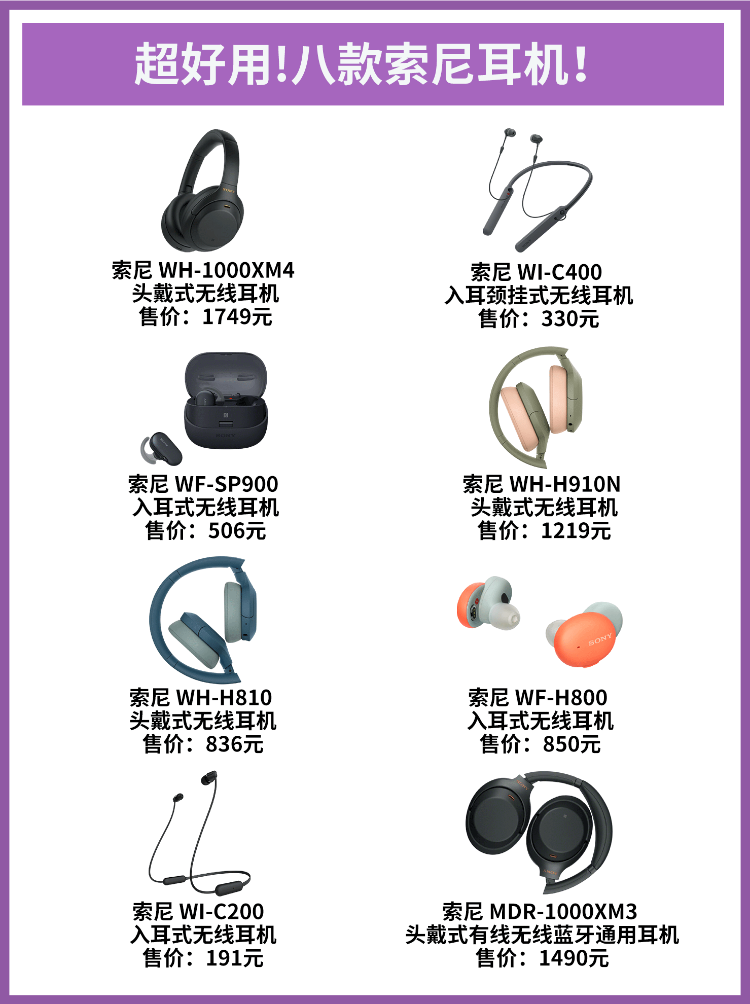 1、索尼 WH-1000XM4 头戴式无线耳机。 售价:1749 特点:集众多索尼黑科技于一体,能自动识别环境声,即使戴着耳机也不影响与人交流。AI智能降噪,多级消噪调节,多频信号处理声音更低失真。 2、索尼 WI-C400 入耳颈挂式无线耳机 价格:330 特色:搭载nfc技术,一碰即连无需反锁操作,该款质量的风评堪忧让大家依旧对他的产品望而却步,不具性价比 3、索尼 WF-SP900 ...