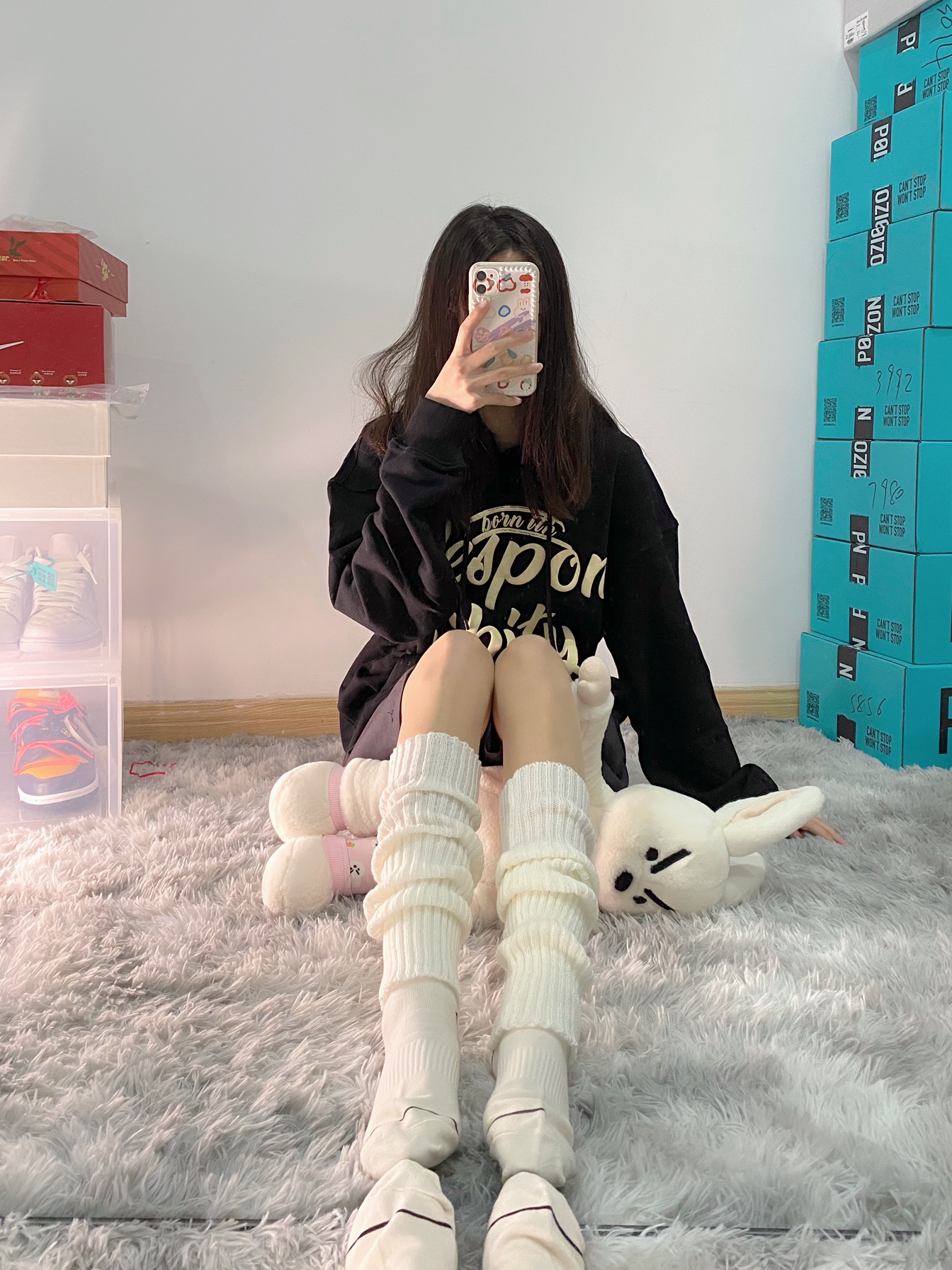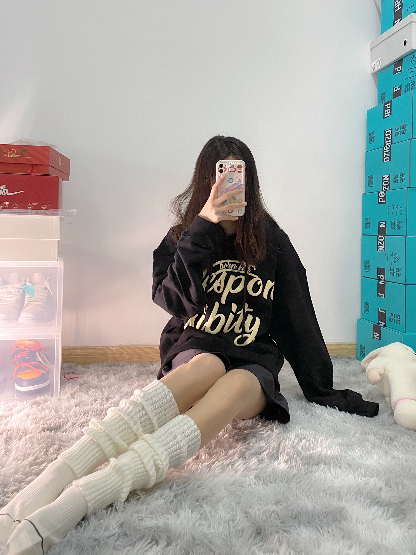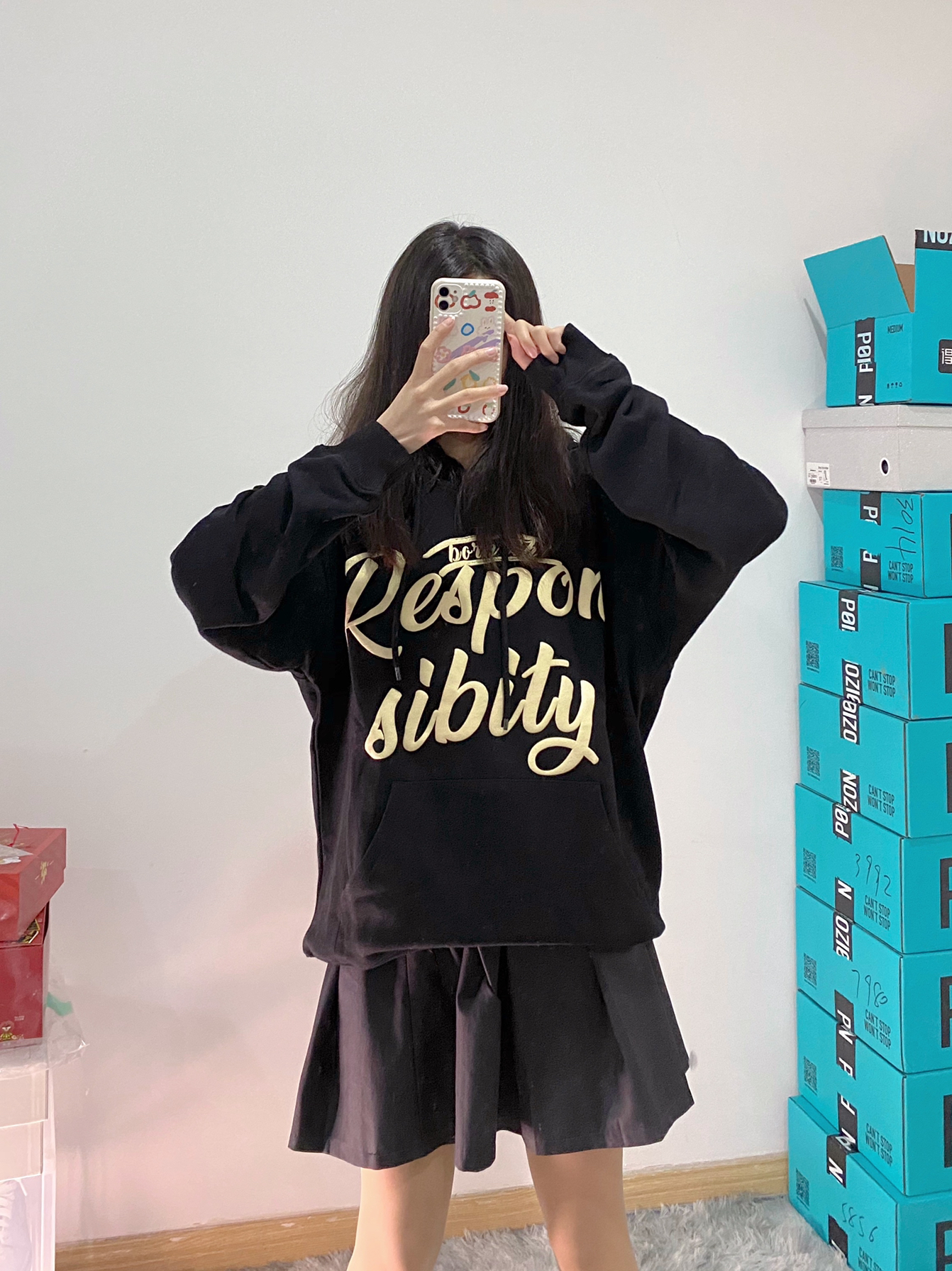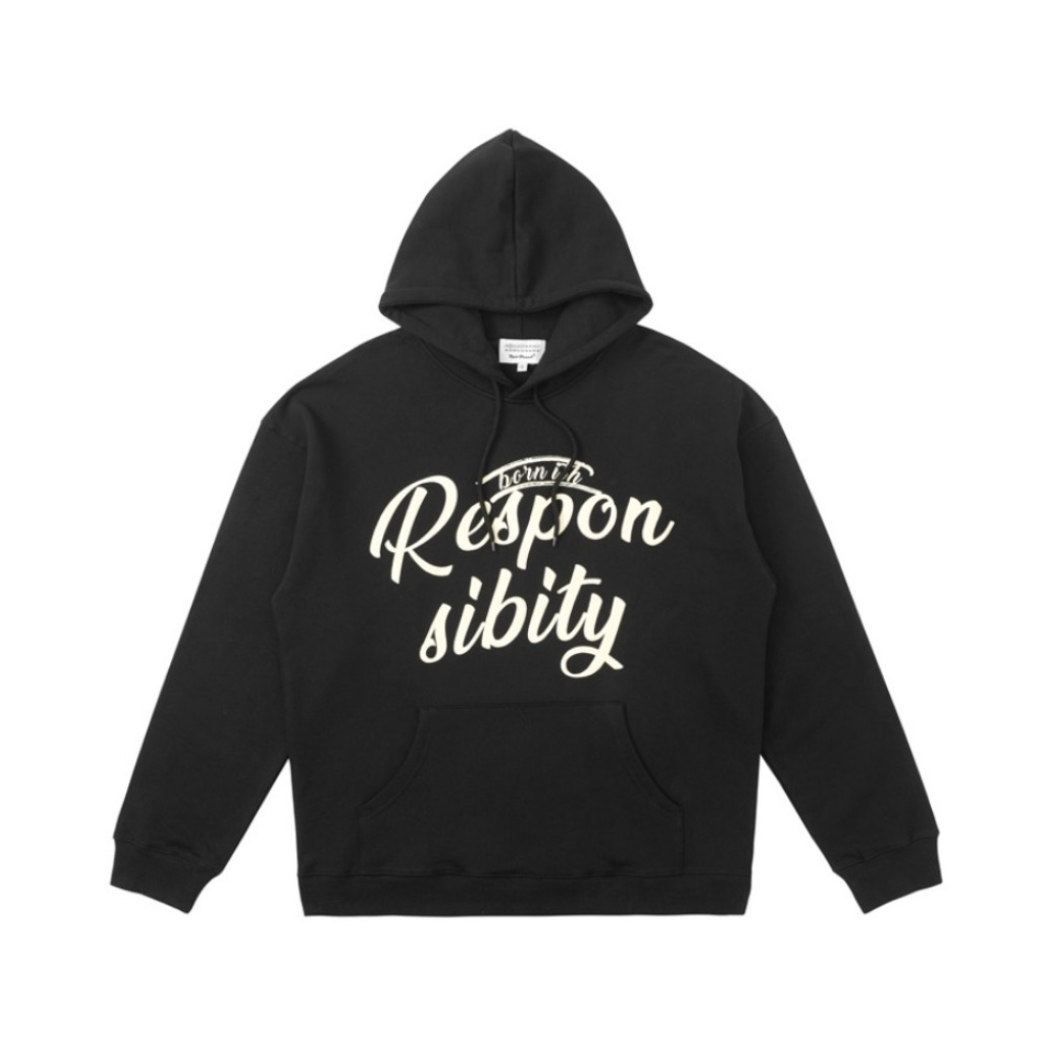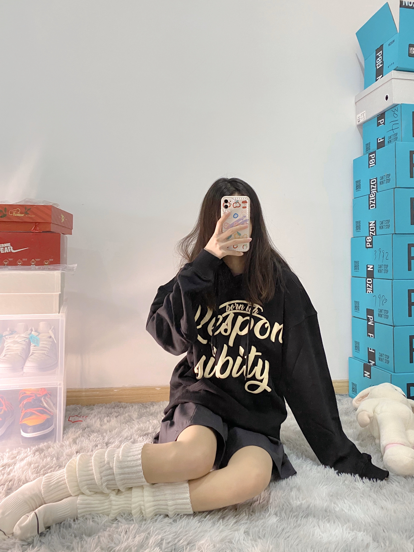 👔:RPB Brand黑色字母印花连帽卫衣 🧦:堆堆袜+rich bear短袜 🐰:问童子奋斗秋裤特别版 这件卫衣的印花采用了今年很火的发泡工艺 更好的解决了印花褪色问题 简约的美式街头风格无论内穿还是外搭都不会出错 印花的字体变换也有很好的辨识度 还有灰色和浅蓝色可以选择 我穿的是s码 黑色酷酷的 里面还可以套衣服 版型宽松