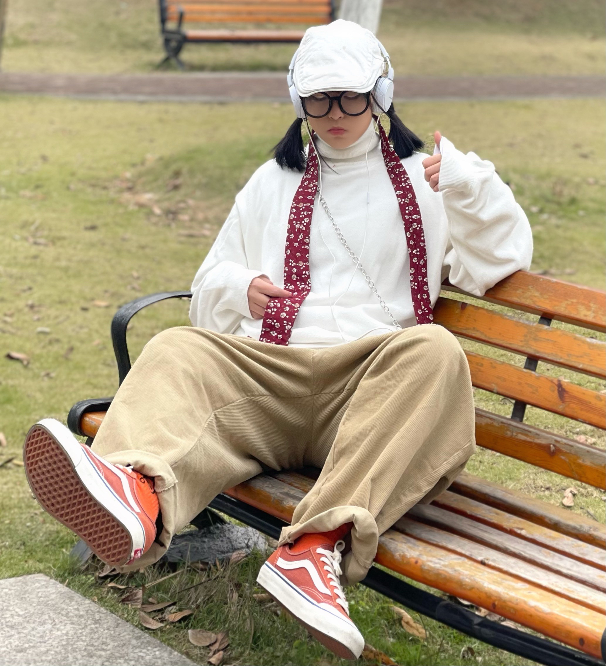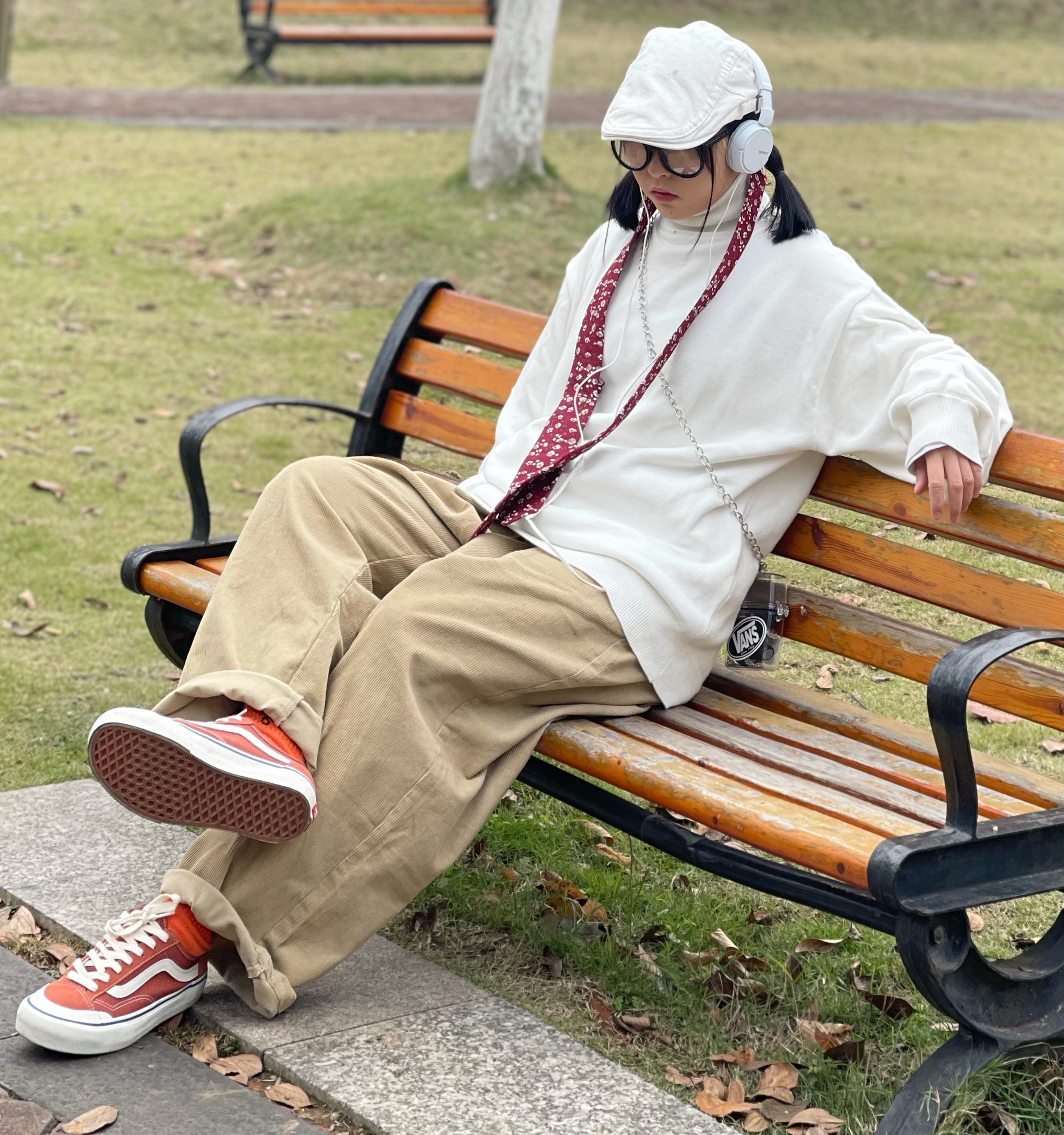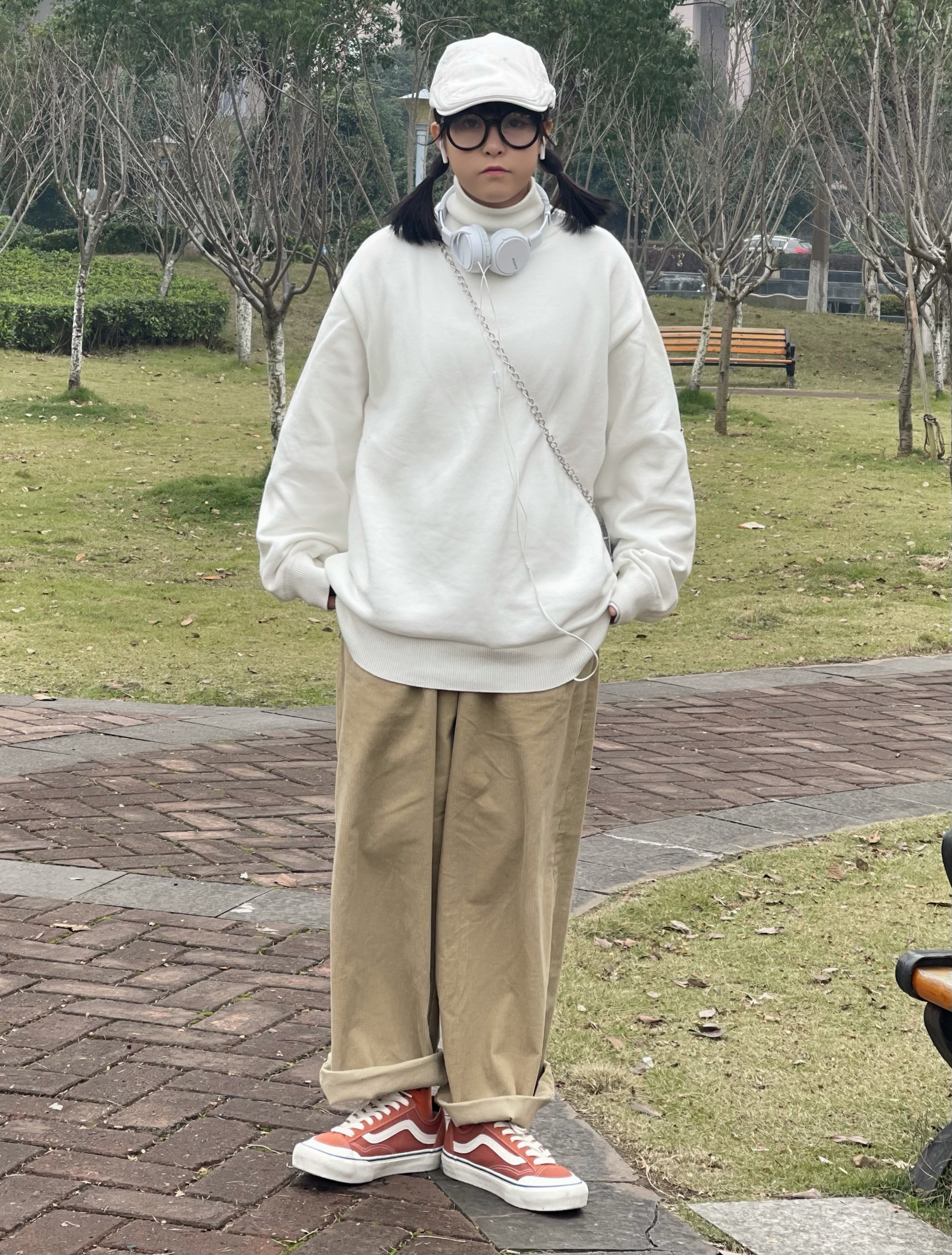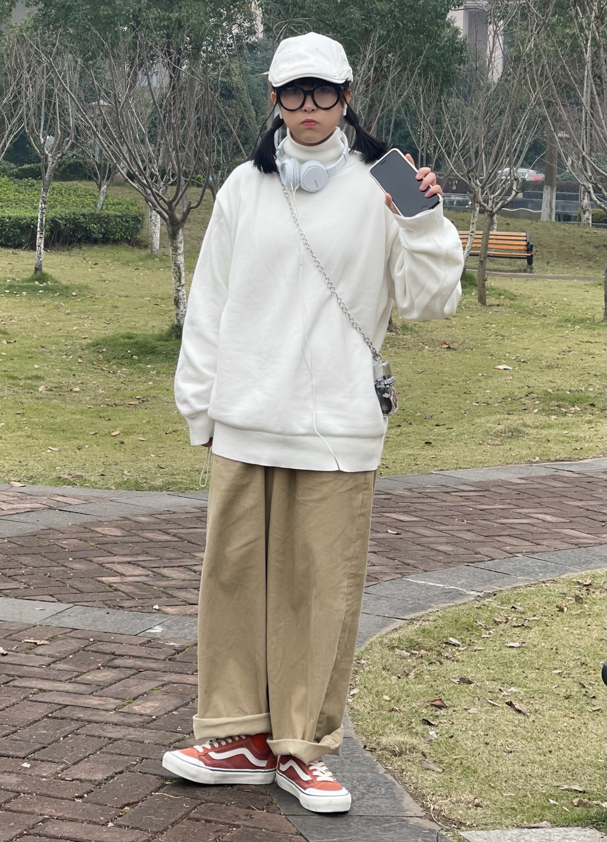就很简单干净日系又复古的穿搭Look 👔:旁白NARRATOR 👖:旁白NARRATOR 👟:Vans style36橘色 打底衫很厚实 也挺宽松 高领的很修身 搭配浅色外套都会好看 外搭卫衣也很有感觉! 搭配浅色的裤子 就很日系 文艺复古风 阔腿裤很显瘦 就很喜欢这种feel!