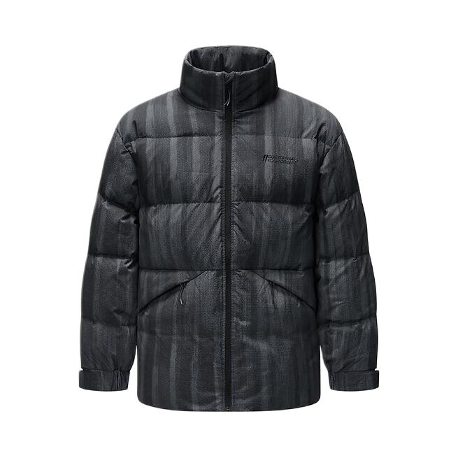 在功能配置方面,填充物为灰鸭绒,充绒量为150g+,绒子含量为80%(含)-85%(不含),面料为聚酯纤维(涤纶),成分含量为81%-90%,风格为青春流行,版型为宽松,领型为立领,袖长为长袖,衣长为短款,图案为肌理,袖型为收口袖,适用季节为冬季。