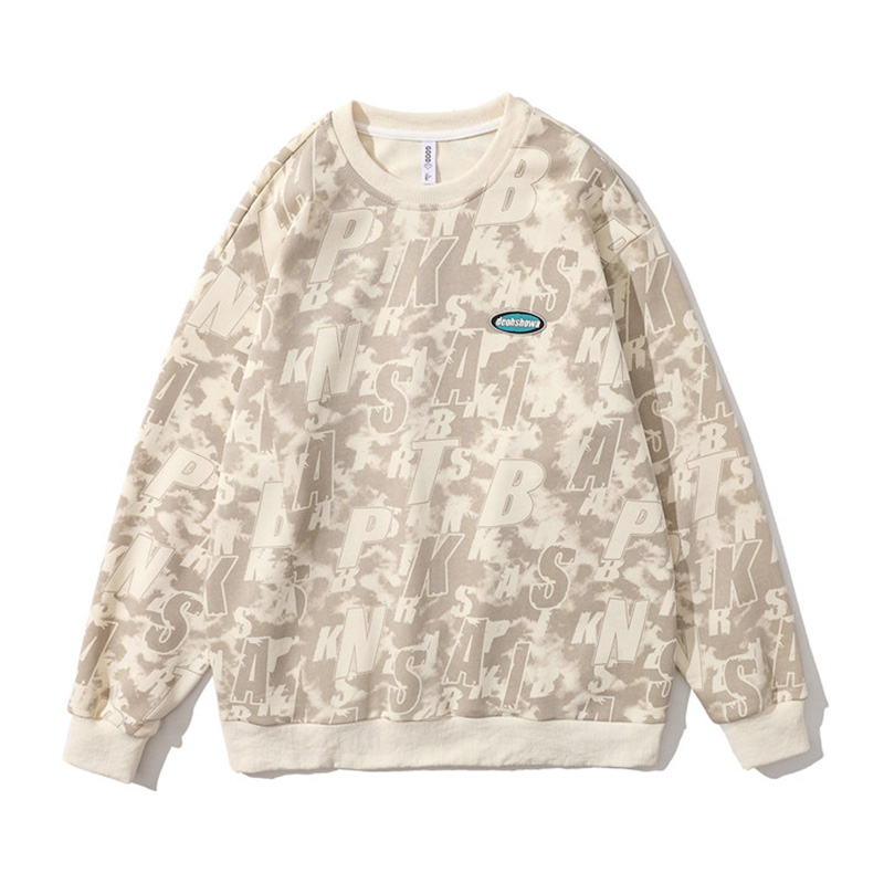 在功能配置方面,面料为聚酯纤维(涤纶),成分含量为90%-100%,风格为美式街头、青春流行,版型为宽松,领型为圆领,袖长为长袖,衣长为常规,衣门襟为套头款,厚度为适中厚度,图案为满印logo、字母logo、扎染、满印,袖型为常规袖,适用季节为秋季、春季,款式为打底。